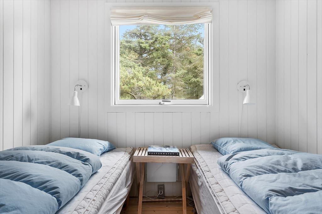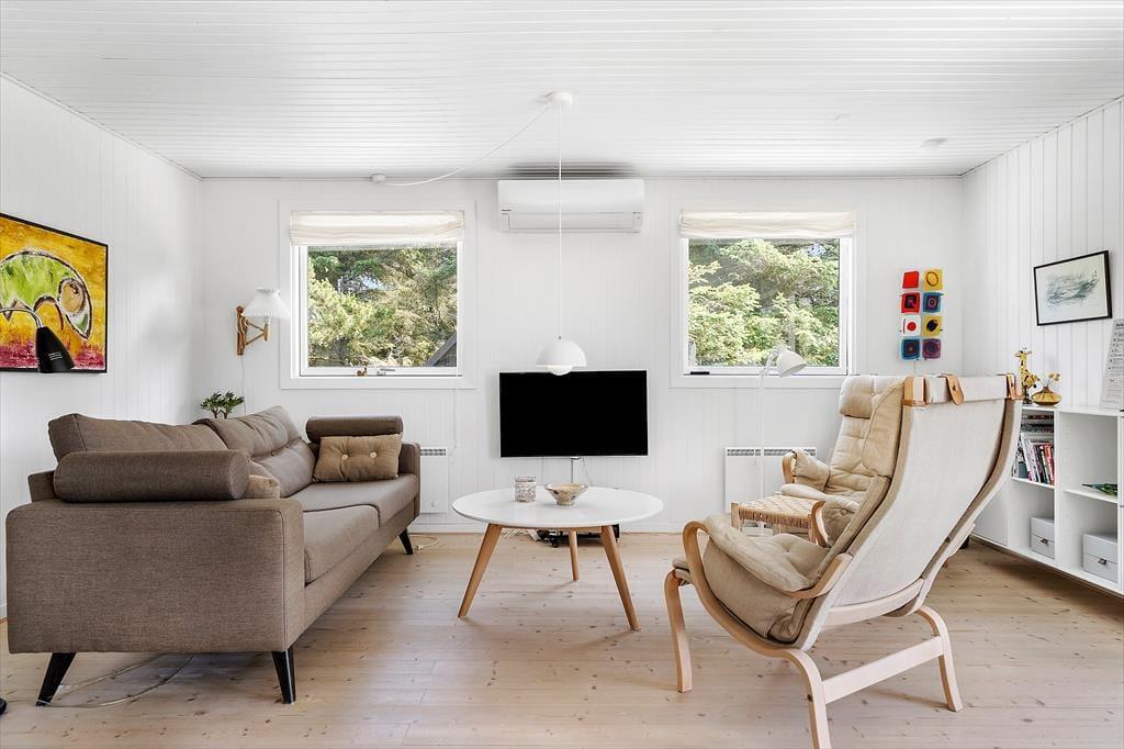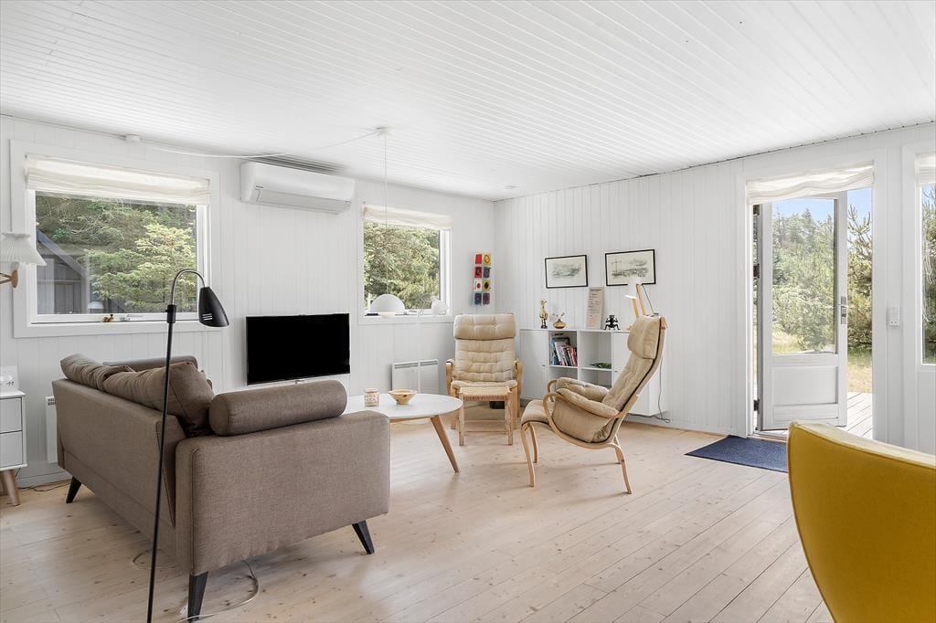 Når I ikke tilbringer dagen på stranden, langs fjorden eller på klitheden, er det skønt at tage den med ro hjemme i huset, der måler 80 m2. Planløsningen passer godt til seks personer, for der er tre soveværelser, et brusebadeværelse og en dejlig stue. I køkkenet har I gode arbejdsforhold, når I vil lave brunch eller forberede aftensmaden, og fordi det er en integreret del af stuen, behøver I ikke at gå glip af feriehyggen, selvom der skal røres i gryderne. På kølige dage kan I tænde op i brændeovnen og tage varmepumpen i brug, så der er lunt og rart, når I slænger jer i sofaen eller spiller kort ved spisebordet.