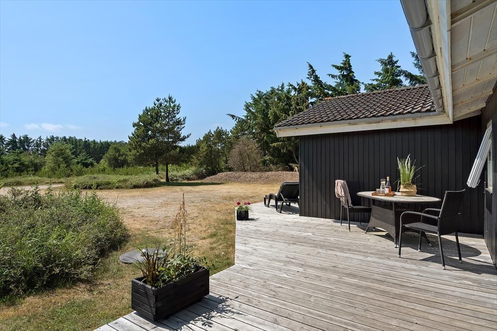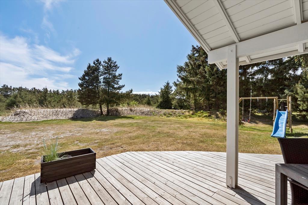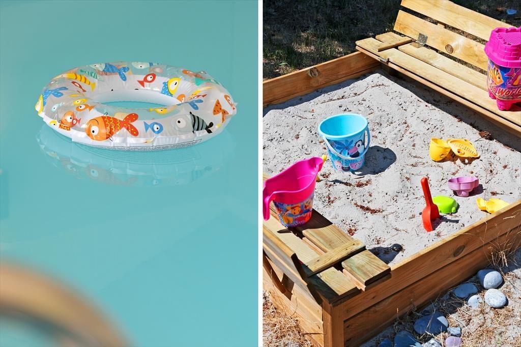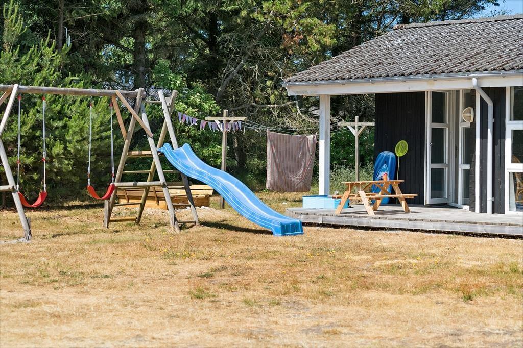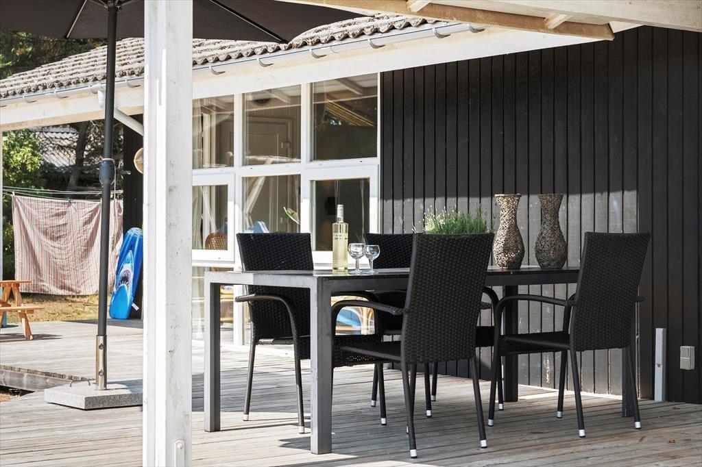 Fra både poolrummet og stuen har I direkte adgang til den store træterrasse, der breder sig syd for sommerhuset. Her kan I spise frokost i solen, og efterfølgende kan børnene selv smutte hen til gyngestativet og sandkassen lige ved siden af, mens de voksne bliver siddende. Trænger I alle til at komme op af havestolene, kan I spille havespil eller frisbee på græsplænen.