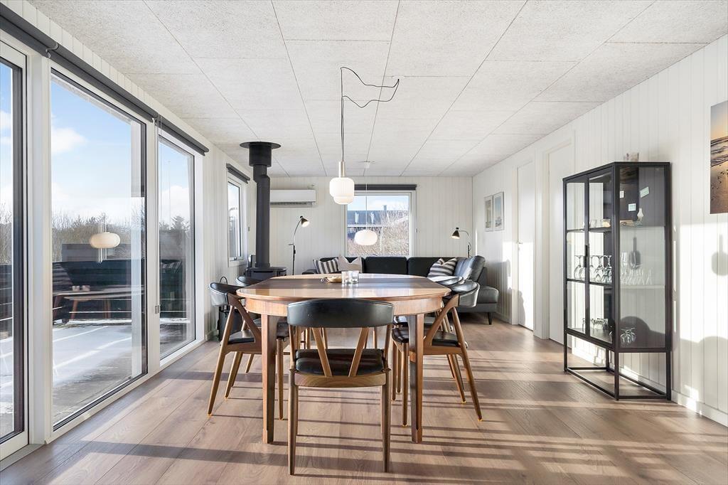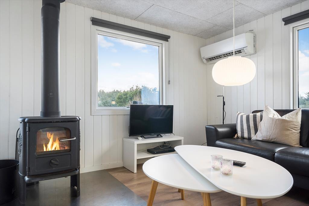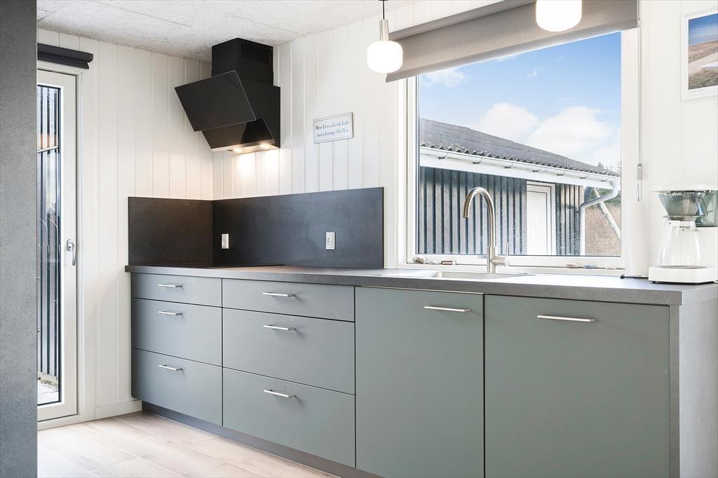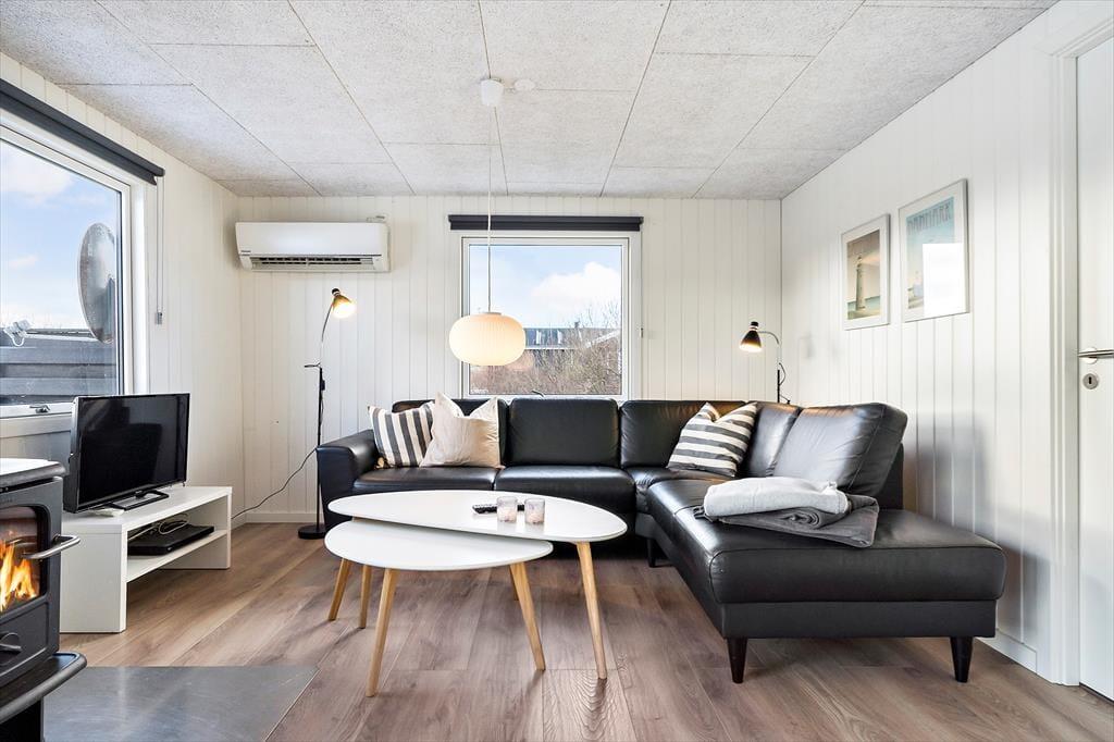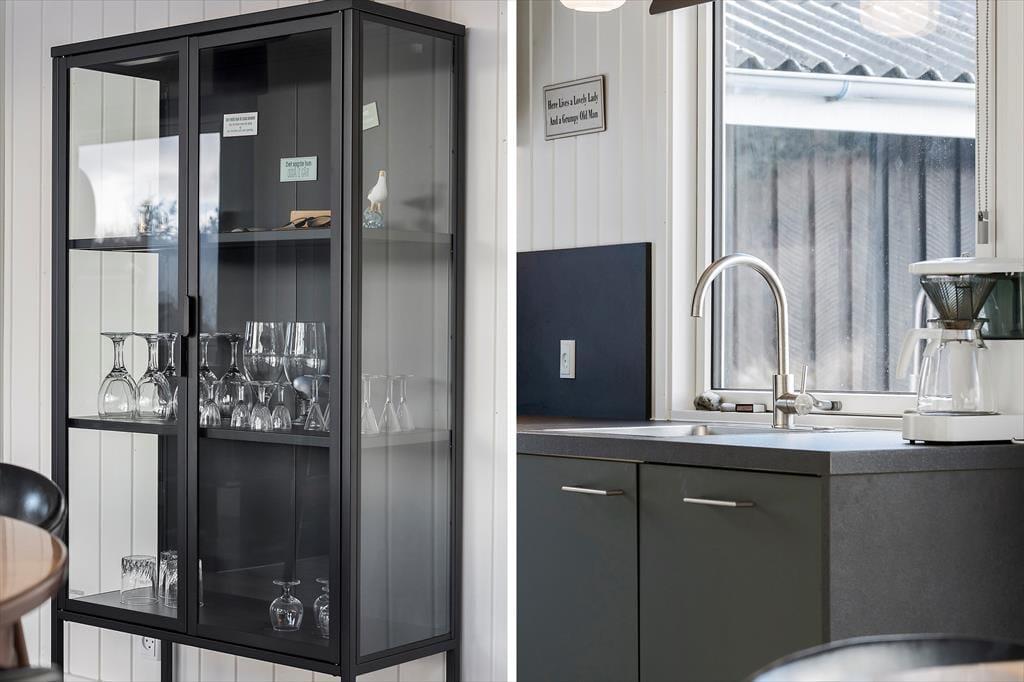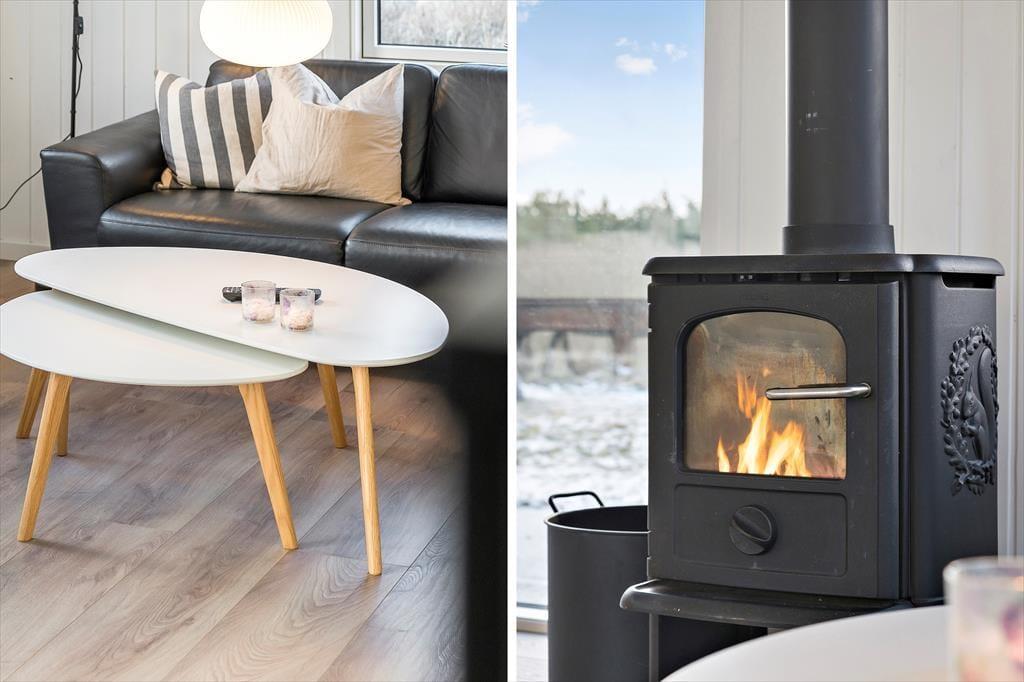 Beliggenheden er bestemt ikke det eneste, der er attraktivt ved huset, for inde bag den mørke facade venter der jer en lys og lækker feriebolig med moderne interiør. I får en skøn ramme om madlavningen i det veludstyrede, åbne køkken, og når der er dækket op, er det herligt at kunne samles om spisebordet til langstrakte måltider med gode snakke. Sofahjørnet er en hyggelig krog med fladskærms-tv og brændeovn, og når det er sengetid, kan I fordele jer på husets tre dejlige soveværelser. Husets badeværelse fremstår i lige så flot stand som de øvrige rum.