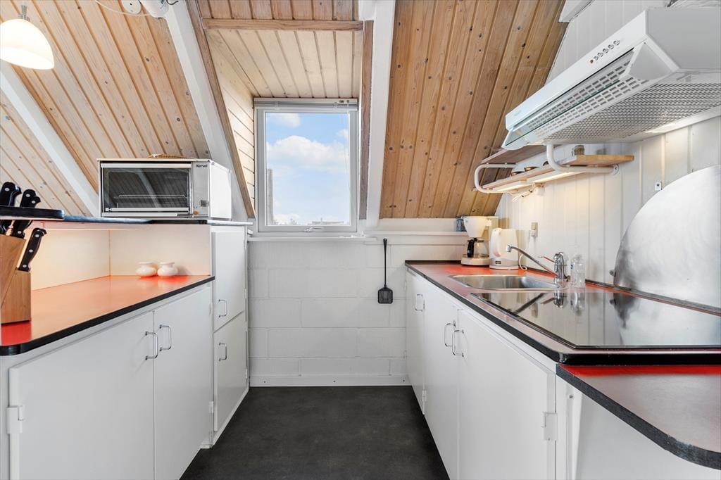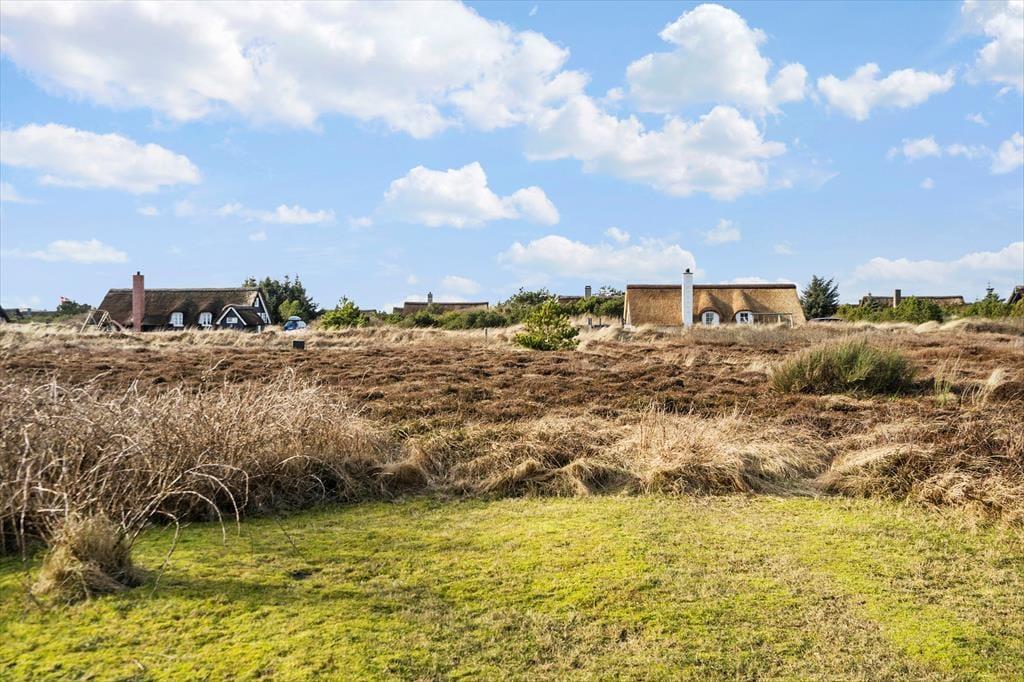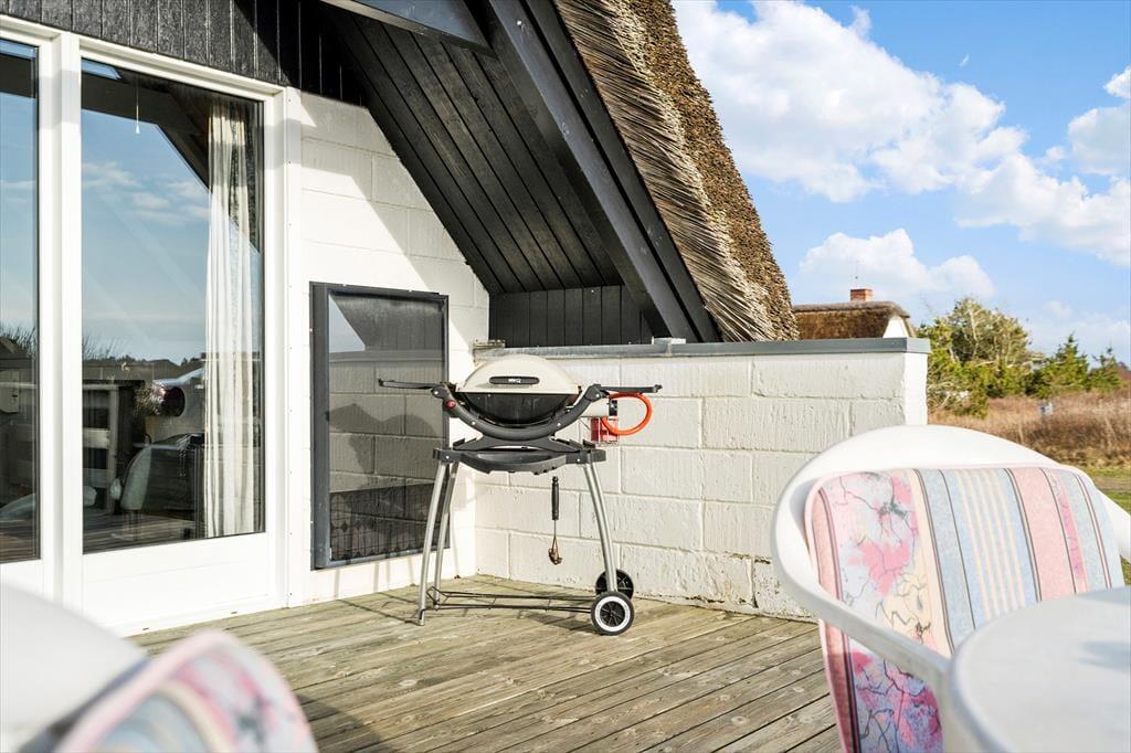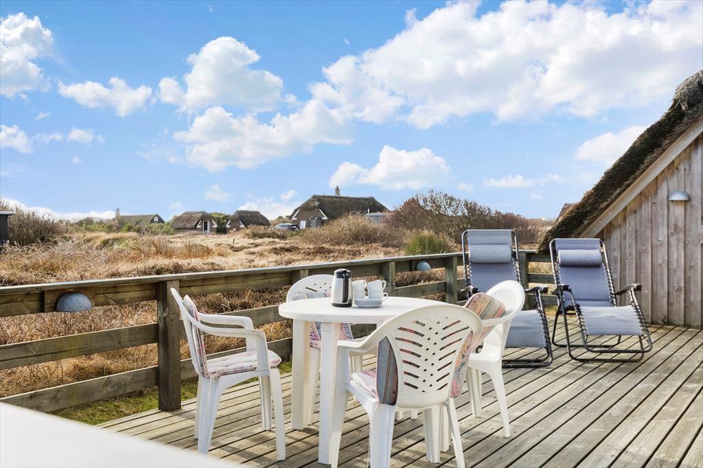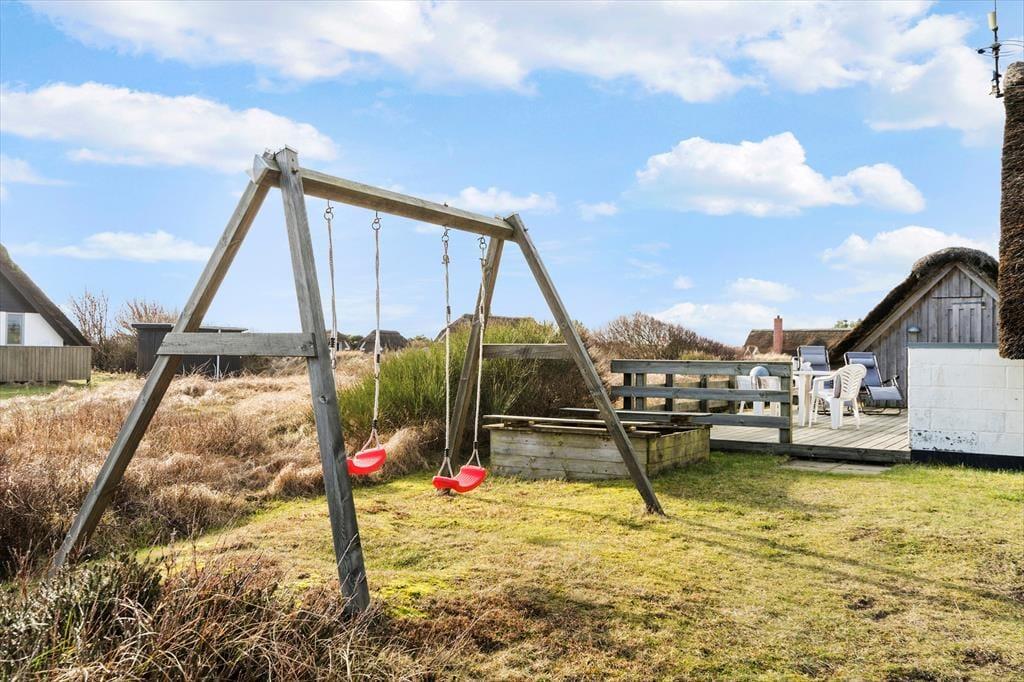 Sommerhusets store træterrasse ligger godt i forhold til solen, så du kan nyde det gode vejr fra morgen til aften i bekvemme rammer. Bliver du tørstig, er det nemt at smutte ind for at hente et glas vand eller en varm kop kaffe i køkkenet, og måltiderne kan selvfølgelig også oplagt flyttes ud i det fri. Når du sidder her, kan du se Lyngvig Fyr knejse i det fjerne over Holmsland Klits sommerhuslandskab, og helt tæt på kan du nyde duften og synet af lyng og anden bevoksning på husets store naturgrund. Nær terrassen er der gyngestativ og sandkasse til familiens yngste medlemmer.