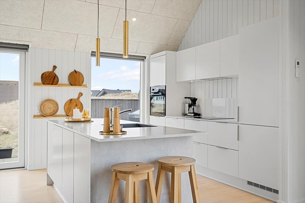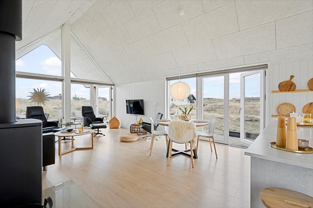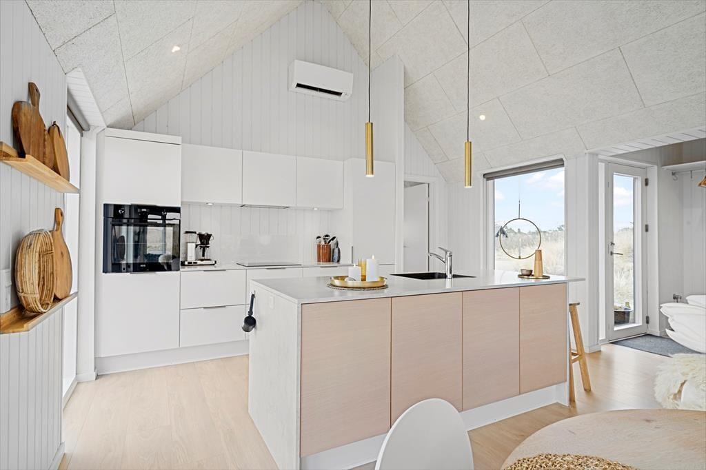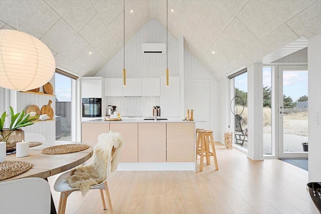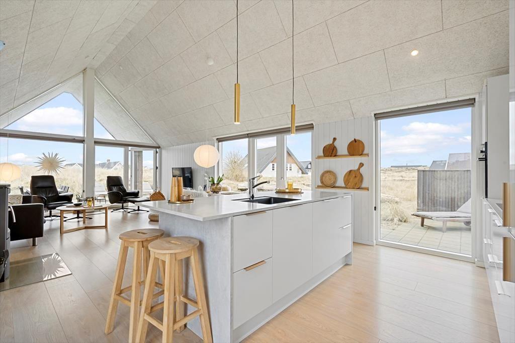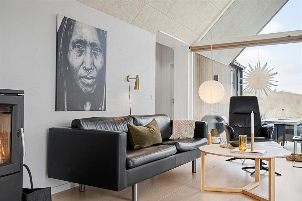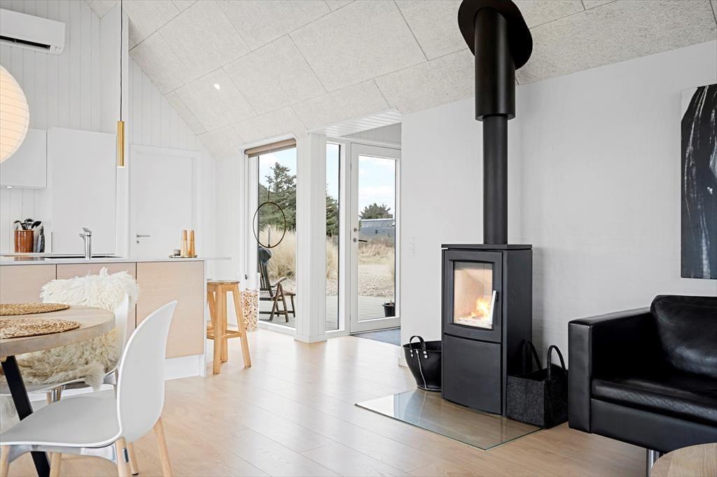 Inde bag den flotte træfacade er rummene lyse og indbydende, og der er god plads, så du kan oplagt invitere venner eller familie med på ferie. Uanset hvem dit selskab er, kan I se frem til nogle herlige dage, hvor I bare slapper af og nyder livet. Brændeovnen ved stuens sofa er perfekt til eventuelle kølige dage, og i det åbne og veludstyrede køkken får I rig mulighed for at lave alle jeres yndlingsretter, lige meget om det er en simpel omgang pasta eller noget mere avanceret. Spisepladsen er et af de steder, hvor I har et kønt kig ud over klitterne og himlens forbipasserende skyer – når I altså ikke sover længe på de tre soveværelser eller slapper af i saunaen på det ene badeværelse.
