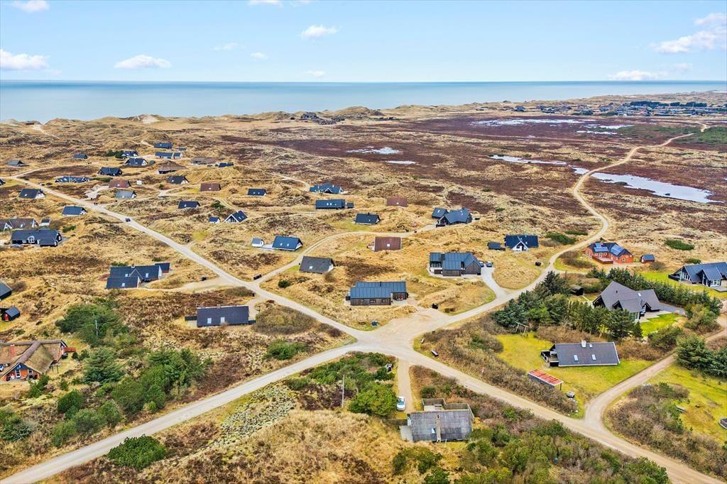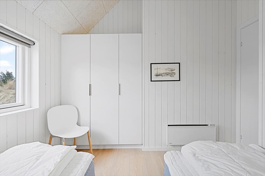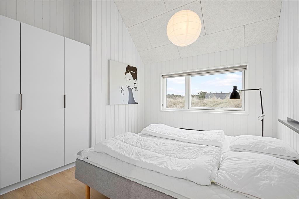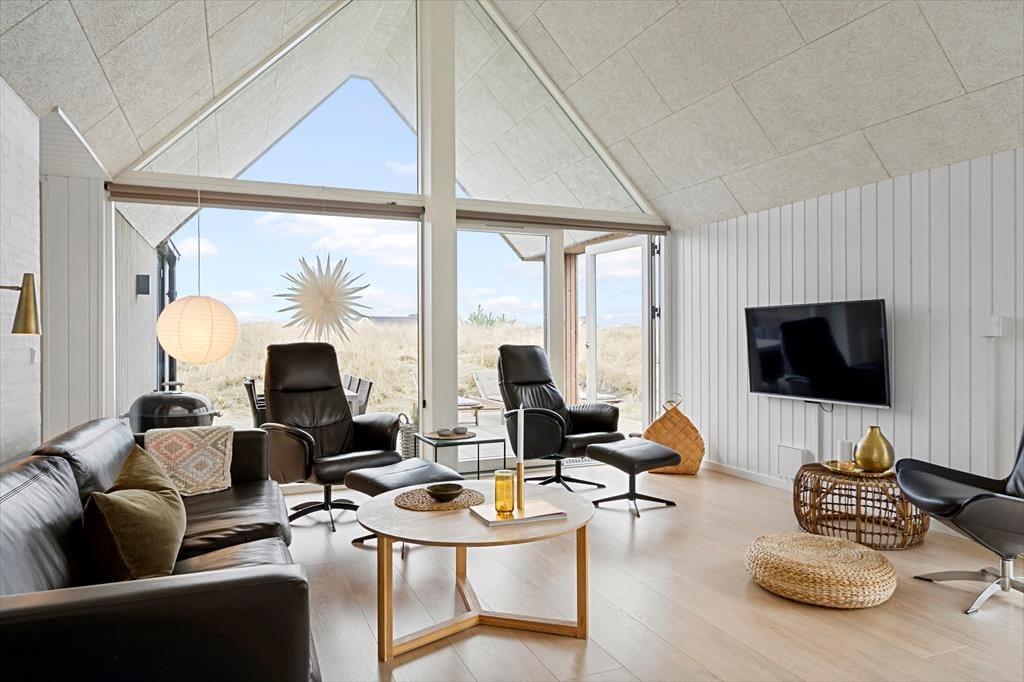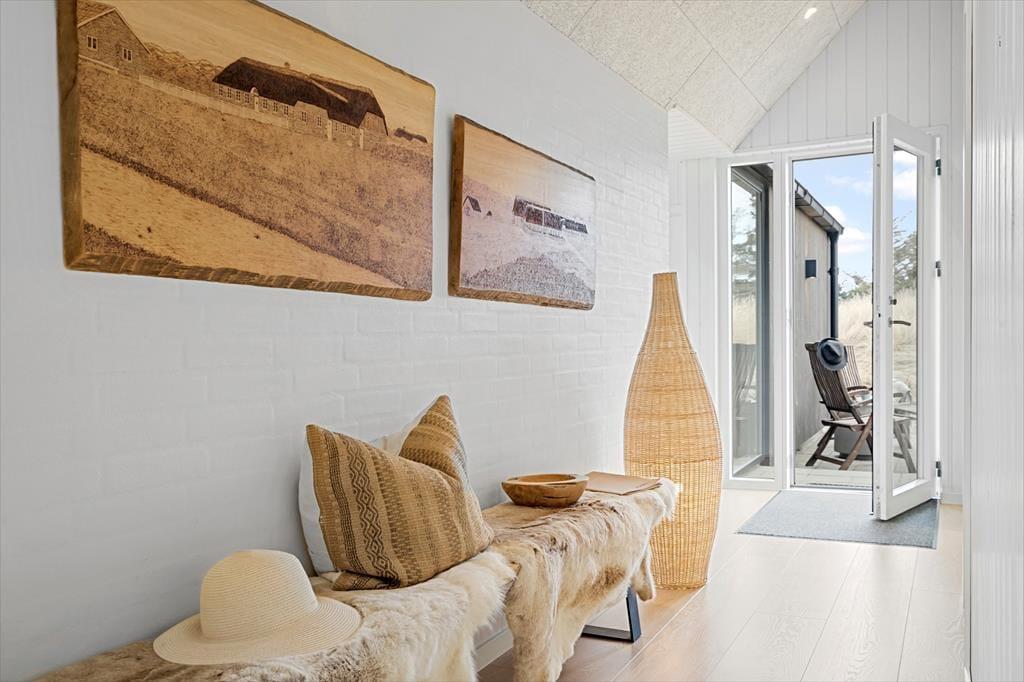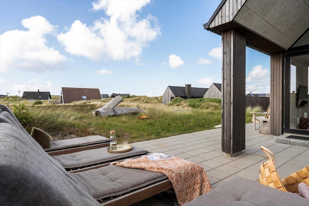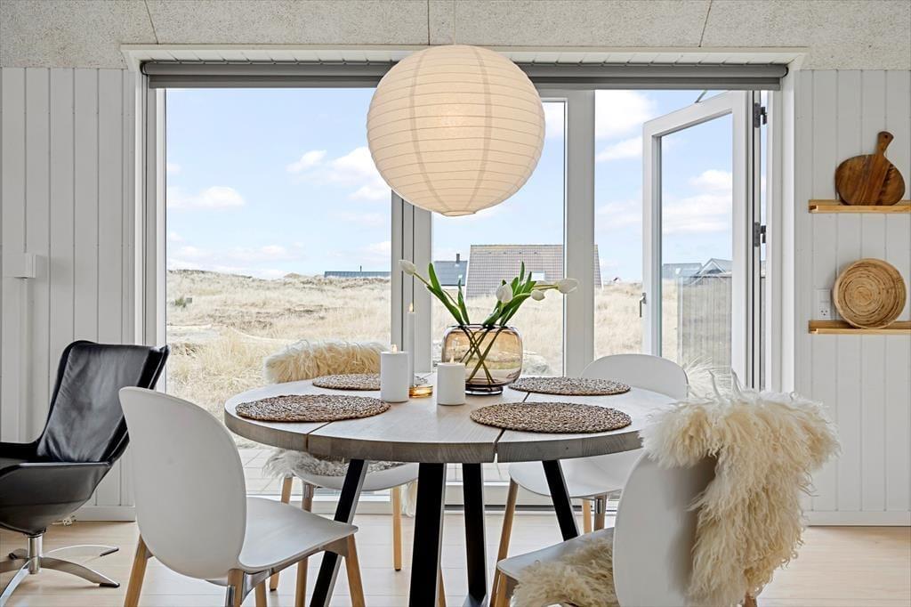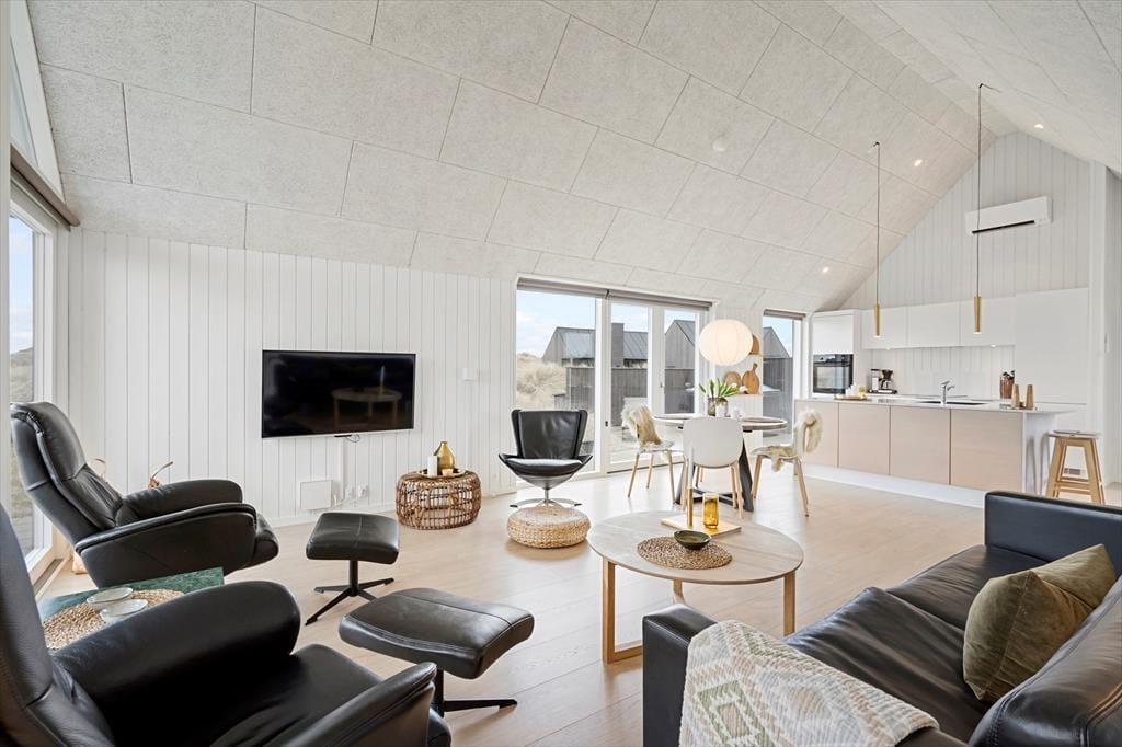 Inde bag den flotte træfacade er rummene lyse og indbydende, og der er god plads, så du kan oplagt invitere venner eller familie med på ferie. Uanset hvem dit selskab er, kan I se frem til nogle herlige dage, hvor I bare slapper af og nyder livet. Brændeovnen ved stuens sofa er perfekt til eventuelle kølige dage, og i det åbne og veludstyrede køkken får I rig mulighed for at lave alle jeres yndlingsretter, lige meget om det er en simpel omgang pasta eller noget mere avanceret. Spisepladsen er et af de steder, hvor I har et kønt kig ud over klitterne og himlens forbipasserende skyer – når I altså ikke sover længe på de tre soveværelser eller slapper af i saunaen på det ene badeværelse.