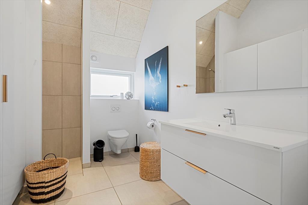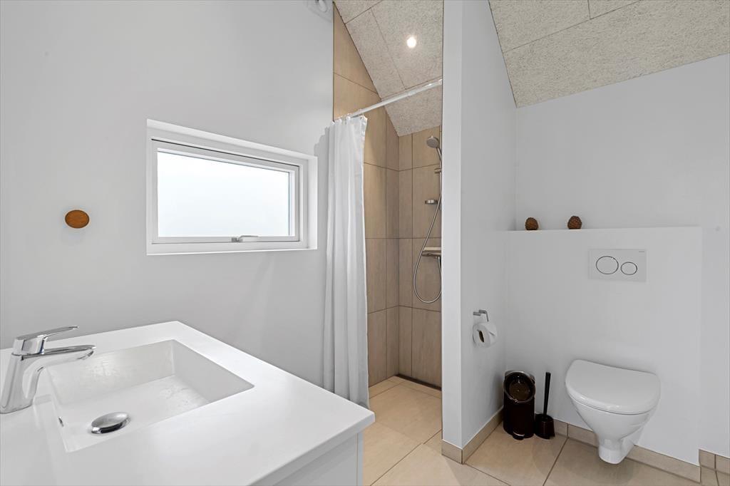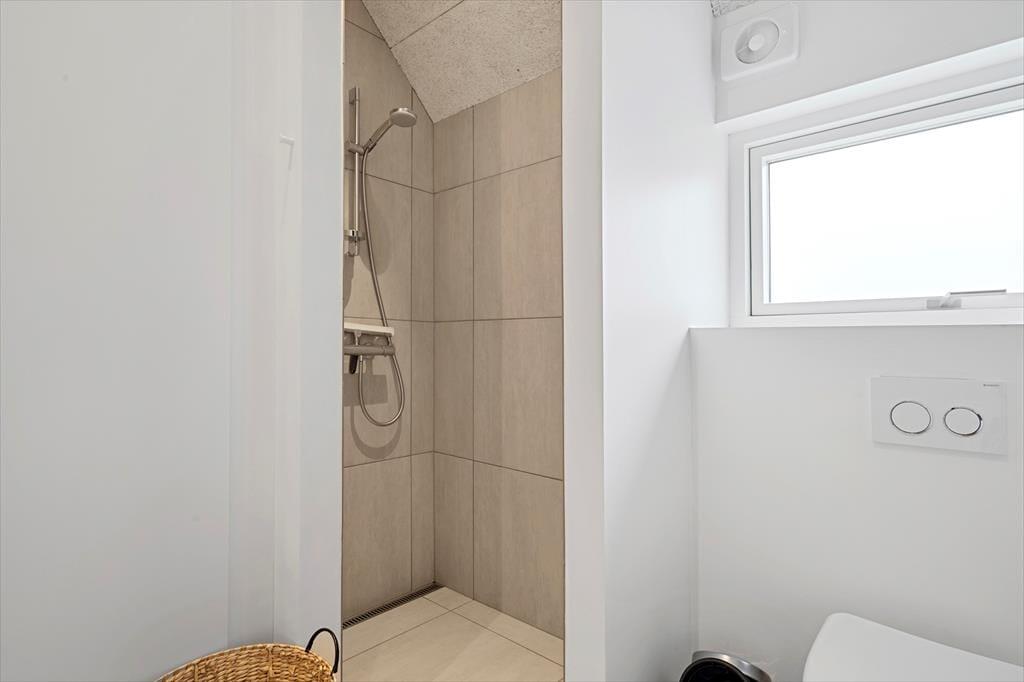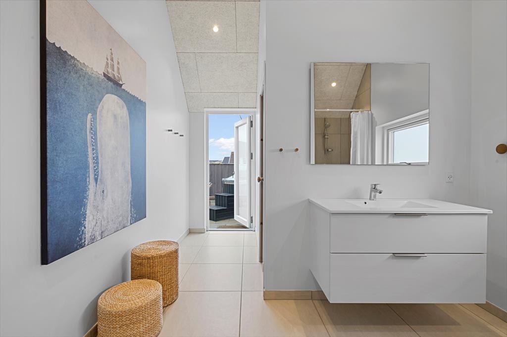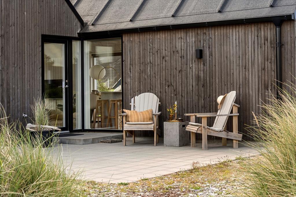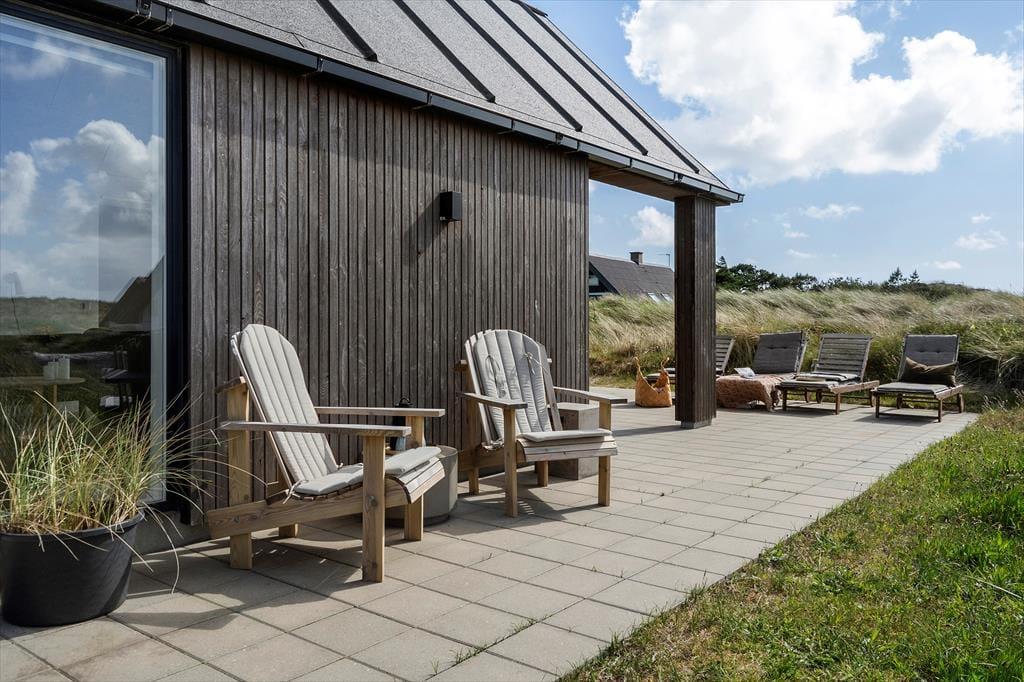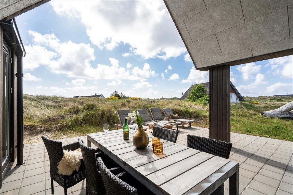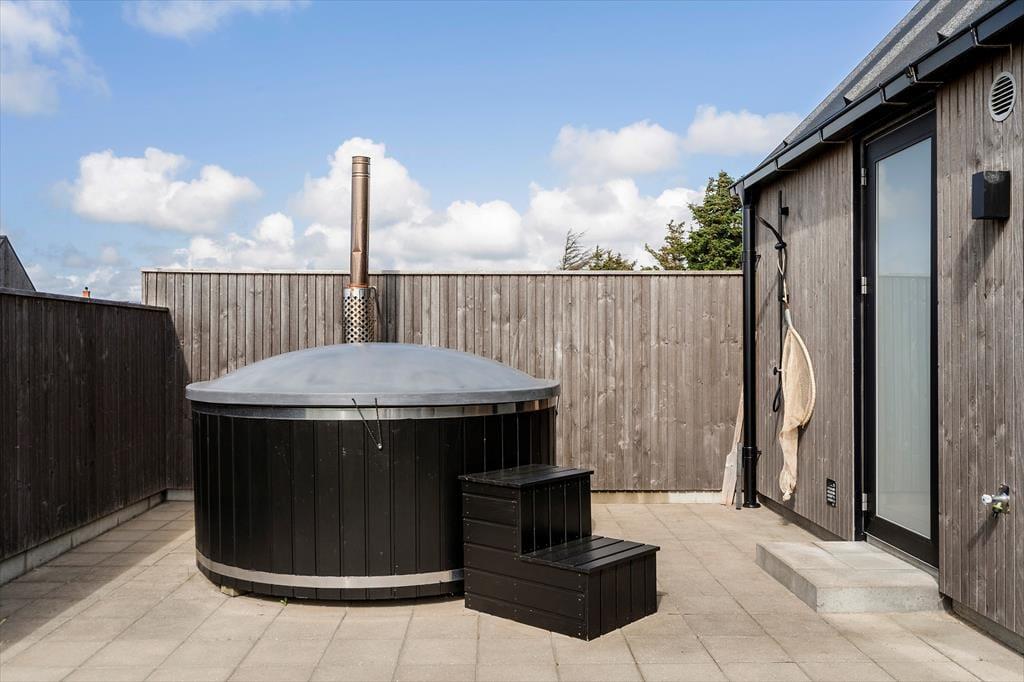 Sommerhuset byder på wellness i udsøgte omgivelser, for fra badeværelset med sauna har du direkte adgang til et afskærmet område med vildmarksbad og bruser. Tænk, at kunne sidde i det varme vand på en råkold efterårsdag eller en stjerneklar sommeraften med intet andet end afslapning på ferieprogrammet! Husets store og delvist overdækkede terrassemiljø indbyder også til livsnyderi, og både morgenkaffen, frokosten og den friskgrillede aftensmad kan indtages i solen, hvis det er det, du og dine kære drømmer om. Der er selvfølgelig havemøbler og liggestole til rådighed, og selv på det udendørs møblement kan husets høje kvalitet tydeligt mærkes.