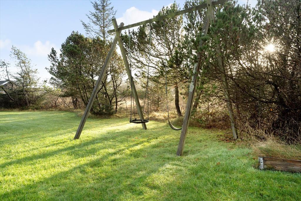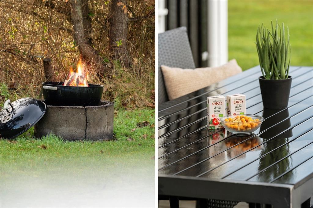 På den åbne træterrasse kan I starte dagen med morgenkaffe i solen, mens I lytter til fuglene, der holder til i buskene omkring huset. Terrassen har afskærmning, så I altid kan finde et lunt hjørne, uanset vejret. I haven finder I både gynge og bålsted – to faciliteter, vi ved, skaber store øjeblikke for både børn og voksne. Her kan ungerne lege frit, mens de voksne tænder op i bålet og samler familien til skumfiduser og gode snakke i skumringen. Det er sommerhusferie, når det er allerbedst.