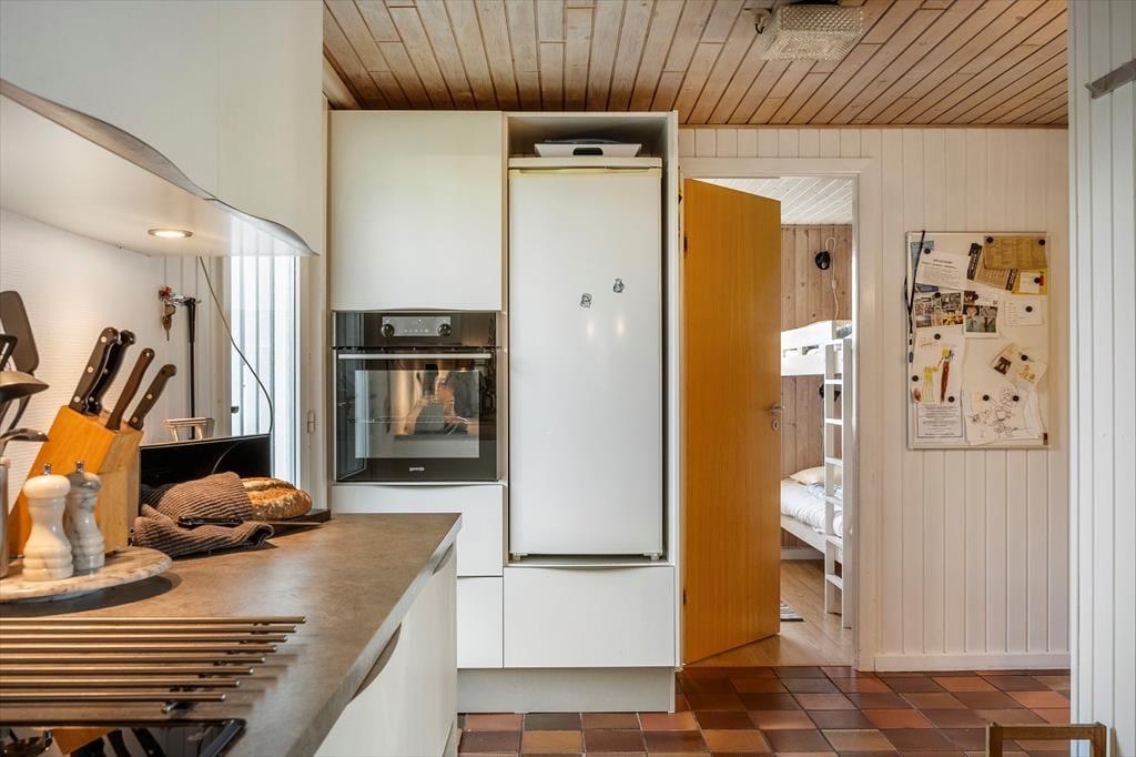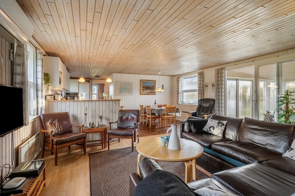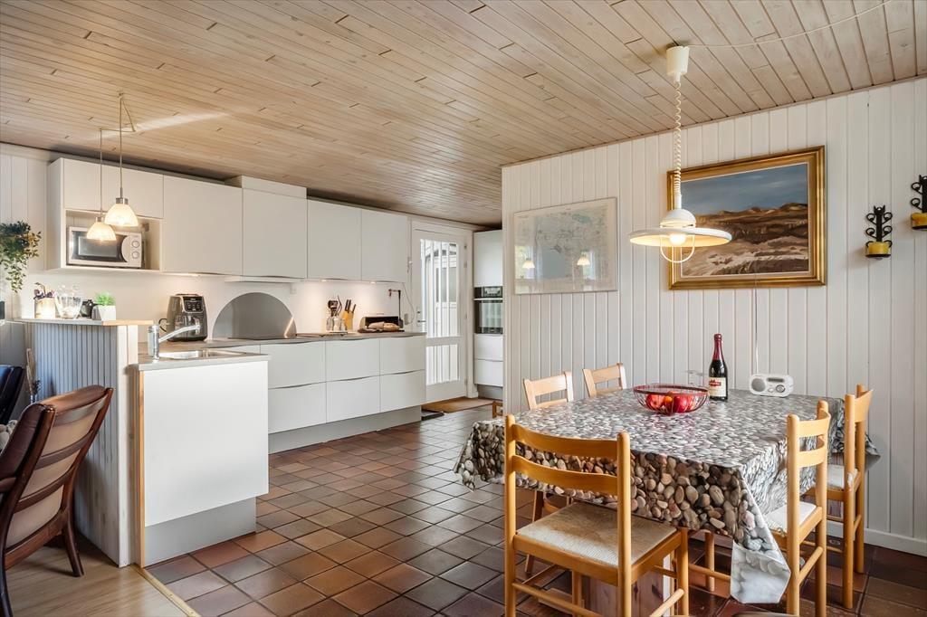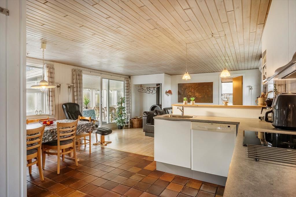Når I træder ind i sommerhuset på Lyngsletten 11, bliver I mødt af et åbent og indbydende opholdsrum, hvor køkken og stue går ud i ét – lige som vi ved, mange af vores gæster foretrækker. Her er det let at samles om dagens måltider, mens samtalen flyder på tværs af rummene. I stuen knitrer brændeovnen i baggrunden og spreder en varm og hyggelig atmosfære, der gør det svært ikke at sætte sig godt til rette i sofaen med en kop kaffe.