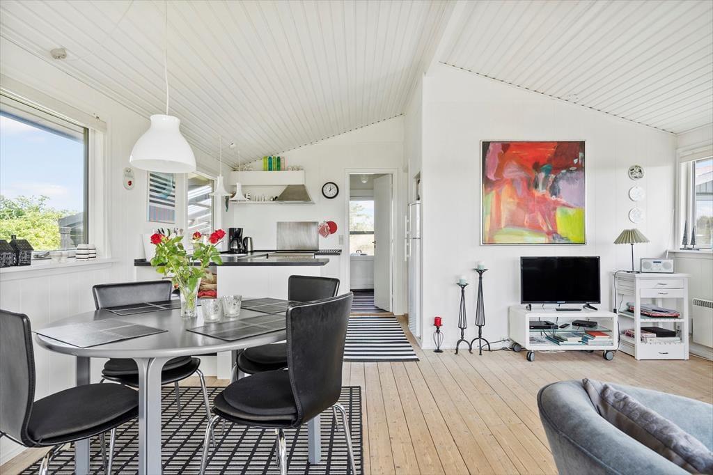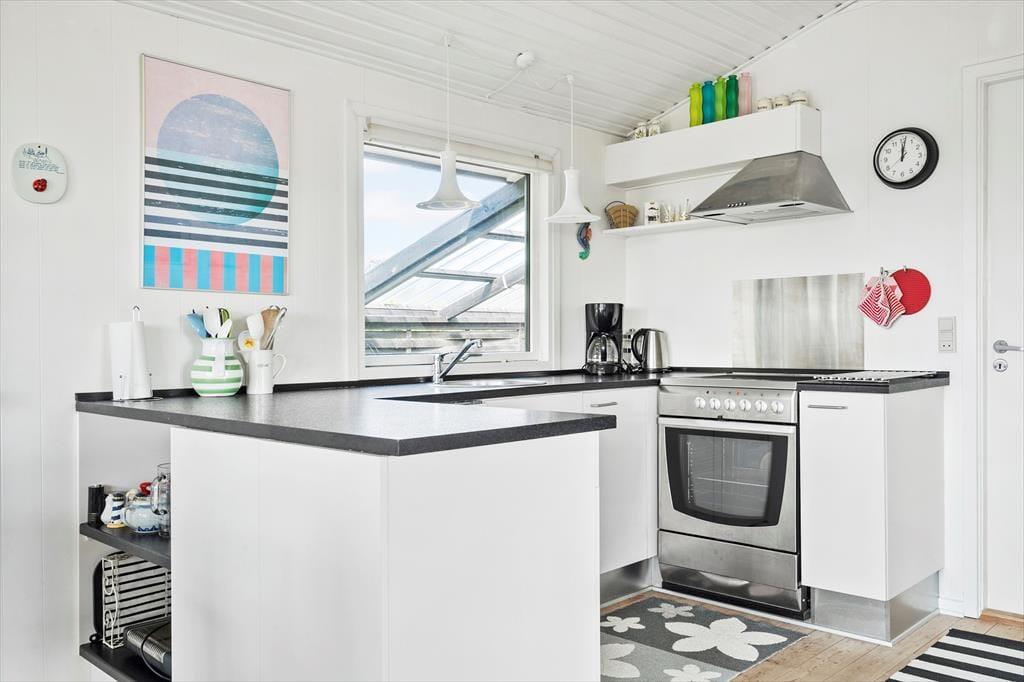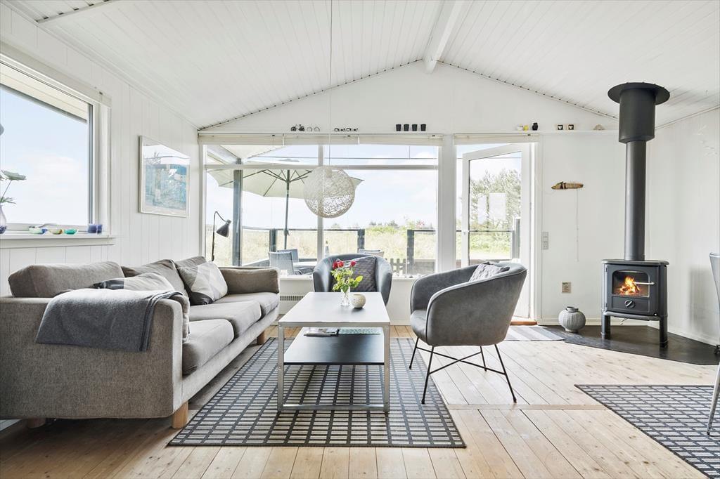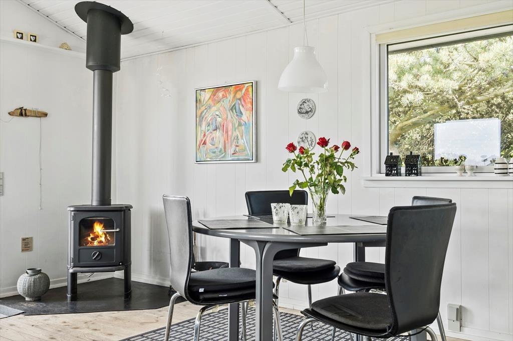Det hyggelige sommerhus er indrettet med to gode soveværelser, der giver sovepladser til fire personer. Fra husets entré/fordelingsgang har I direkte adgang til badeværelset, der er indrettet med bruseniche og gulvvarme. Derudover byder sommerhuset på et stemningsfuldt opholdsrum, hvor køkkenet og stuen glider i ét. Køkkenet er moderne og veludrustet, og opvaskemaskinen gør det nemt at rydde af efter en veloverstået middag. Stuen er indrettet med spisebord og sofaarrangement, og her kan I hygge jer med lækre måltider og filmaftener, mens ilden knitrer i brændeovnen. I kan også samles om brætspil ved spisebordet, krybe under et lunt tæppe med en god bog, bruge iPad’en via feriehusets wi-fi og nyde den skønne udsigt til marehalmen og det bølgende klitlandskab.