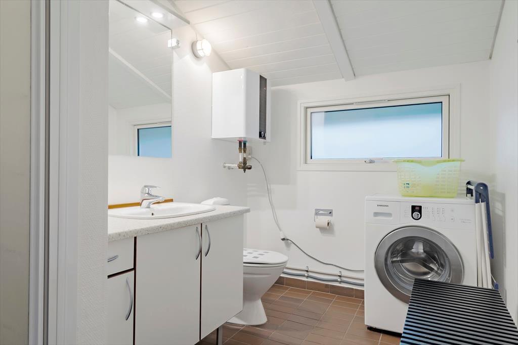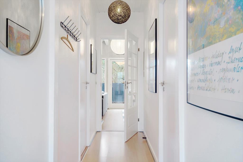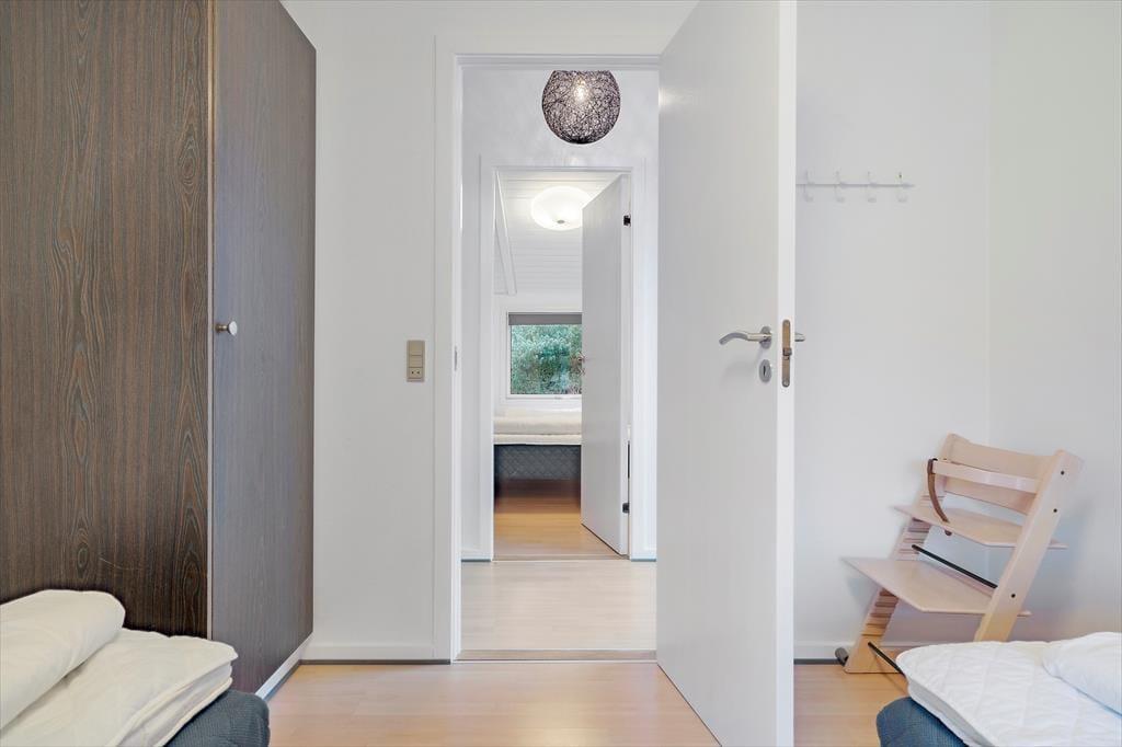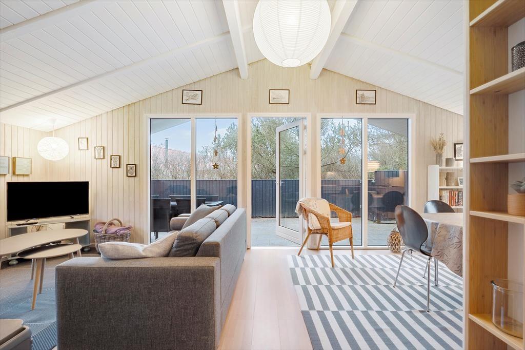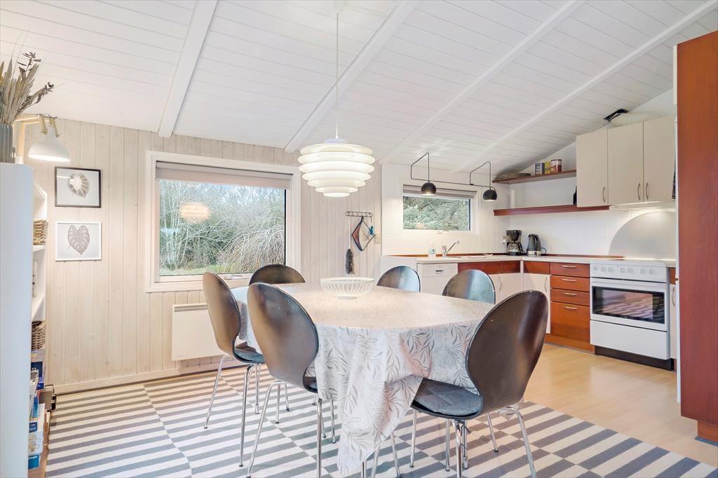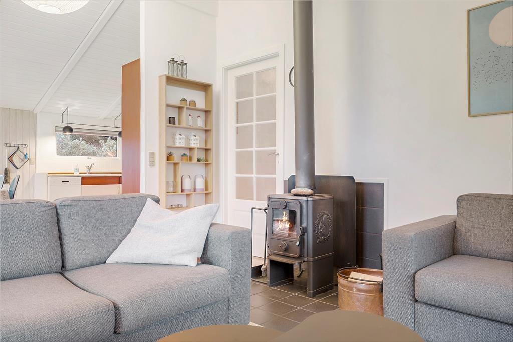 Sommerhuset er stemningsfuldt indrettet, og størstedelen af kvadratmeterne udgøres af et stort opholdsområde, hvor køkkenet og stuen er forenet. Køkkenet har plads til, at I kan være flere sammen om at lave mad, og opvaskemaskinen er med til at forenkle køkkenarbejdet. Retterne serveres let ved spisebordet, og sofaerne giver mulighed for at slappe af med en god film, læse en bog, surfe på iPad’en via sommerhusets wi-fi eller bare dagdrømme, mens ilden knitrer i brændeovnen. Sommerhusets tre soveværelser fremstår alle lyse og luftige. Badeværelset byder på bruseniche og vaskemaskine, og der er god plads til sko og overtøj i entréen.