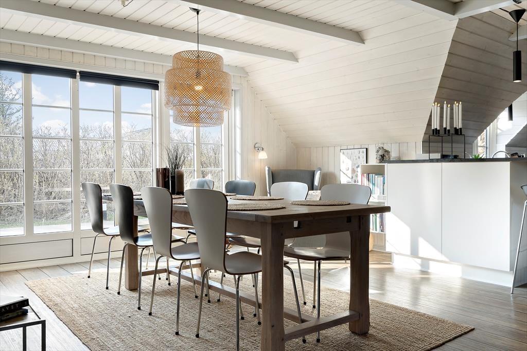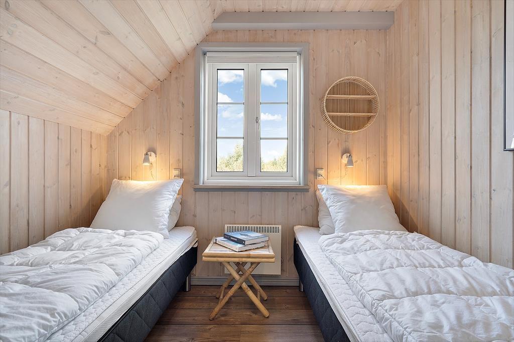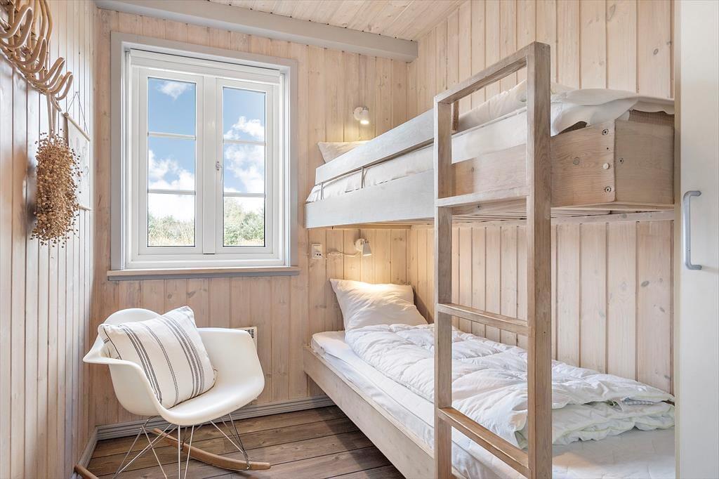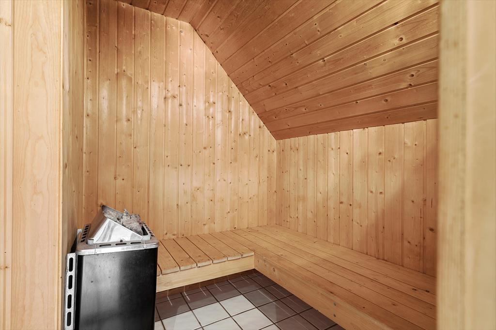 Fire soveværelser er ligeligt fordelt i to afdelinger i hver sin ende af huset, så er I to familier på ferie sammen, har I hver jeres soveafsnit. Alle kan samles i den store, åbne opholdsafdeling, hvor køkkenet og stuen glider i ét, og hvor varmepumpen og brændeovnen sørger for en behagelig temperatur. Vær sammen om at lave mad i det moderne køkken, og lad opvaskemaskinen lette køkkenarbejdet, mens I hygger omkring spisebordet eller I de bløde møbler. Wi-fi og fladskærms-tv sikrer underholdningen, og i depotrummet finder I bob, minibordfodbold og andre sjove spil. Foruden entréen byder feriehuset også på et separat toilet samt et wellnessbadeværelse, der har bruseniche, og hvor I kan nyde boblerne i spabadet eller den varme damp i saunaen.