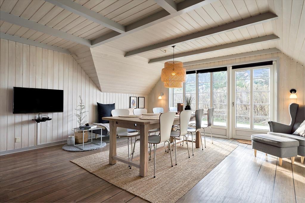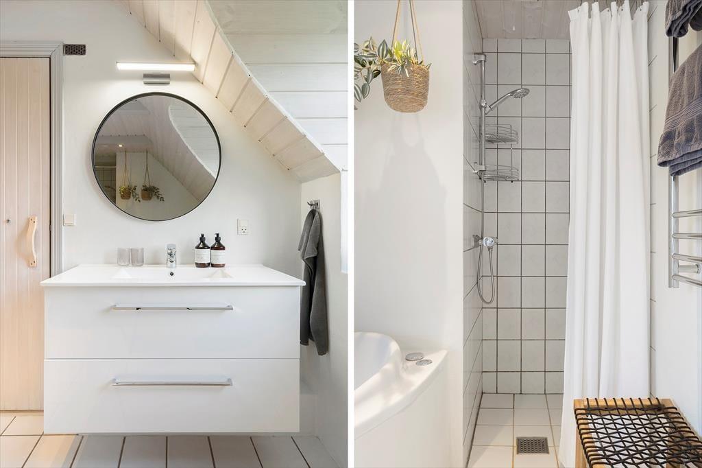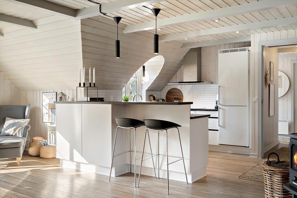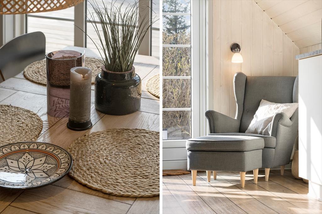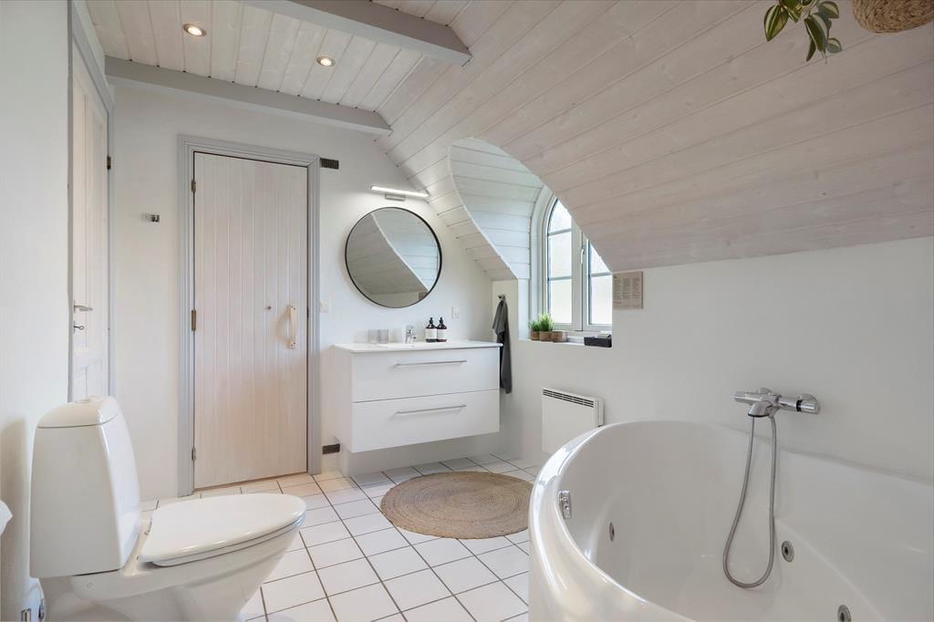 Fire soveværelser er ligeligt fordelt i to afdelinger i hver sin ende af huset, så er I to familier på ferie sammen, har I hver jeres soveafsnit. Alle kan samles i den store, åbne opholdsafdeling, hvor køkkenet og stuen glider i ét, og hvor varmepumpen og brændeovnen sørger for en behagelig temperatur. Vær sammen om at lave mad i det moderne køkken, og lad opvaskemaskinen lette køkkenarbejdet, mens I hygger omkring spisebordet eller I de bløde møbler. Wi-fi og fladskærms-tv sikrer underholdningen, og i depotrummet finder I bob, minibordfodbold og andre sjove spil. Foruden entréen byder feriehuset også på et separat toilet samt et wellnessbadeværelse, der har bruseniche, og hvor I kan nyde boblerne i spabadet eller den varme damp i saunaen.