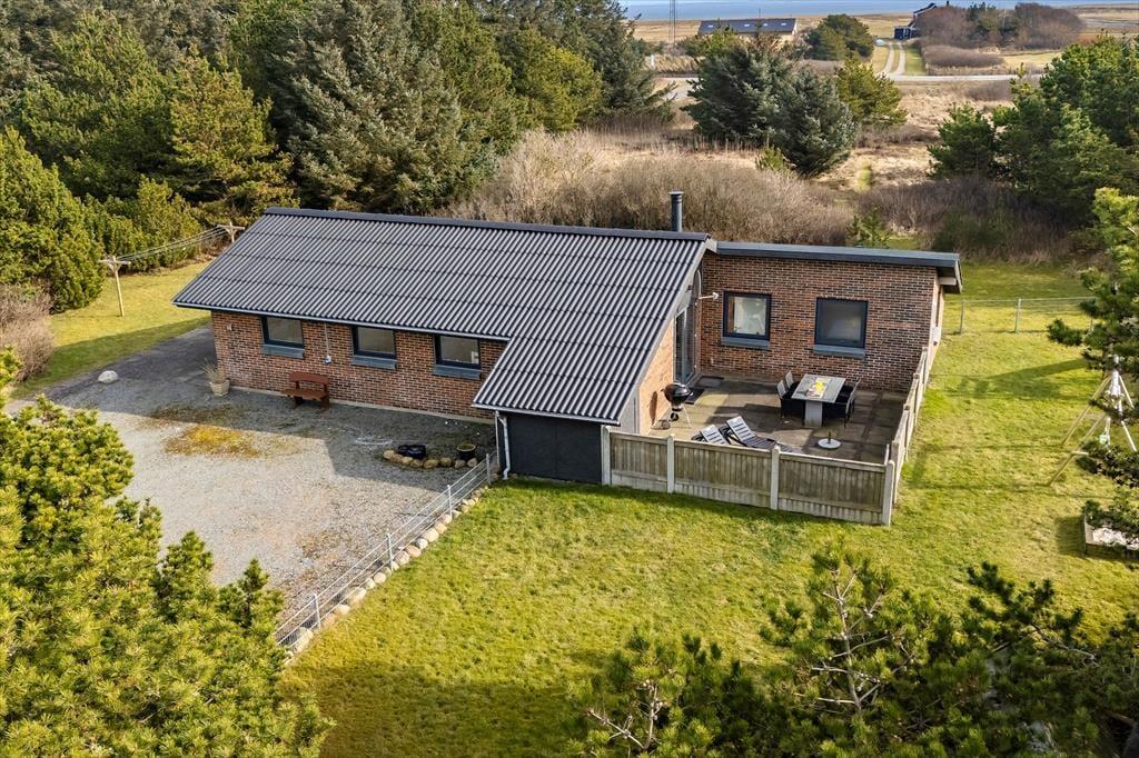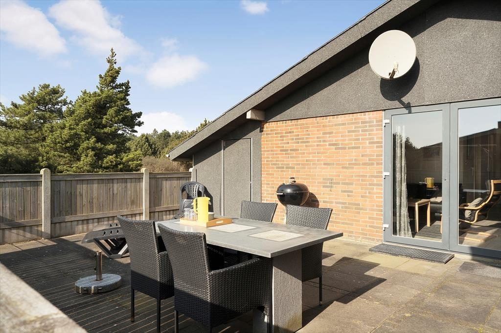 En østterrasse giver mulighed for at nyde morgenens kop kaffe i solopgangen. Ejendommens anden terrasse er sydvestvendt, og her har I det ideelle sted at servere frokosten og aftenmåltidet i solen. Terrassen er indhegnet, og det sammen gælder en del af haven, så små børn eller hunden sagtens kan få lov at gå frit. Haven byder på legeredskaber, og mod øst er grunden anlagt som en naturgrund med kig til fjordengene og Ringkøbing Fjord.