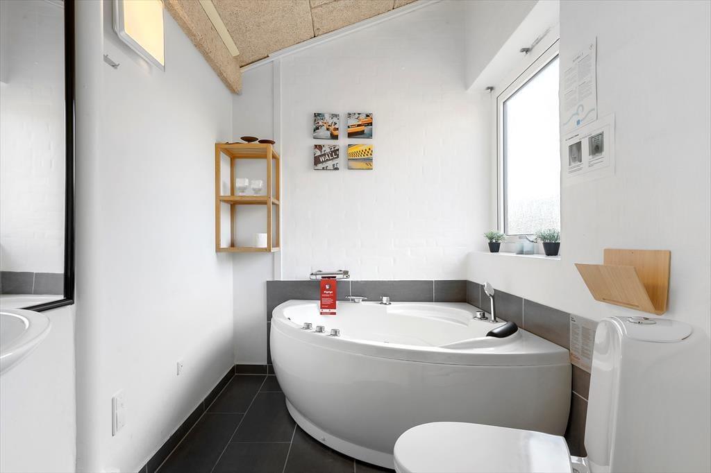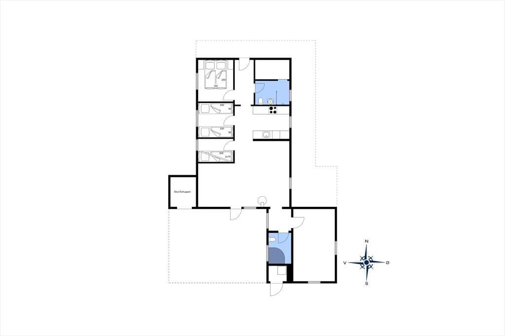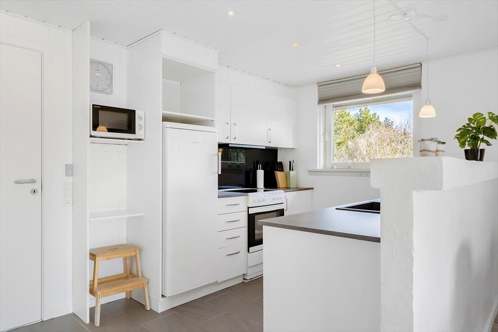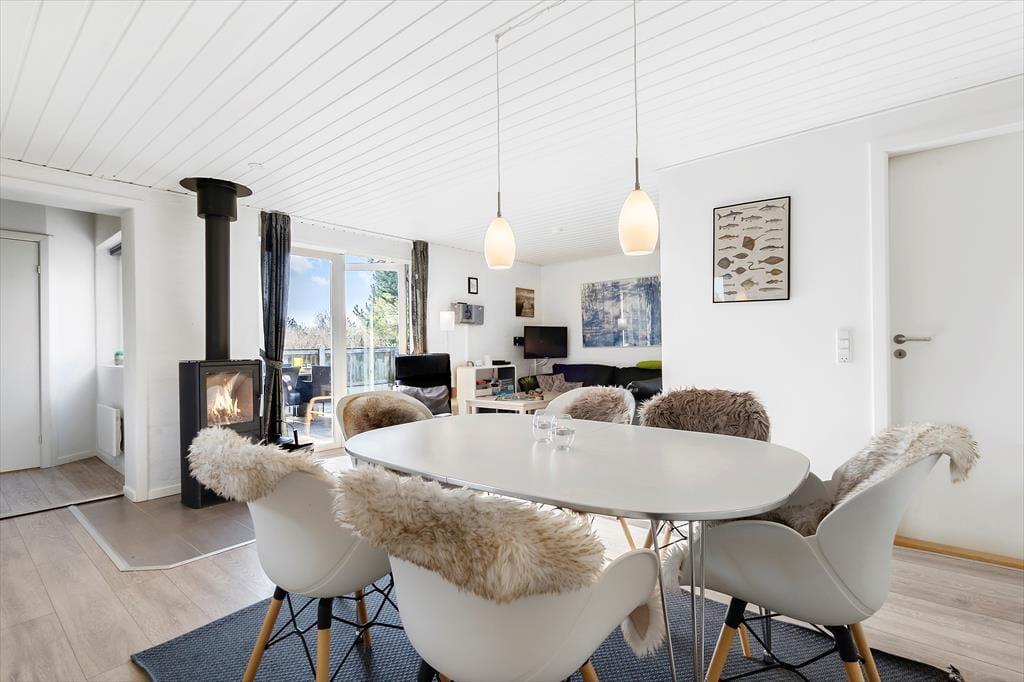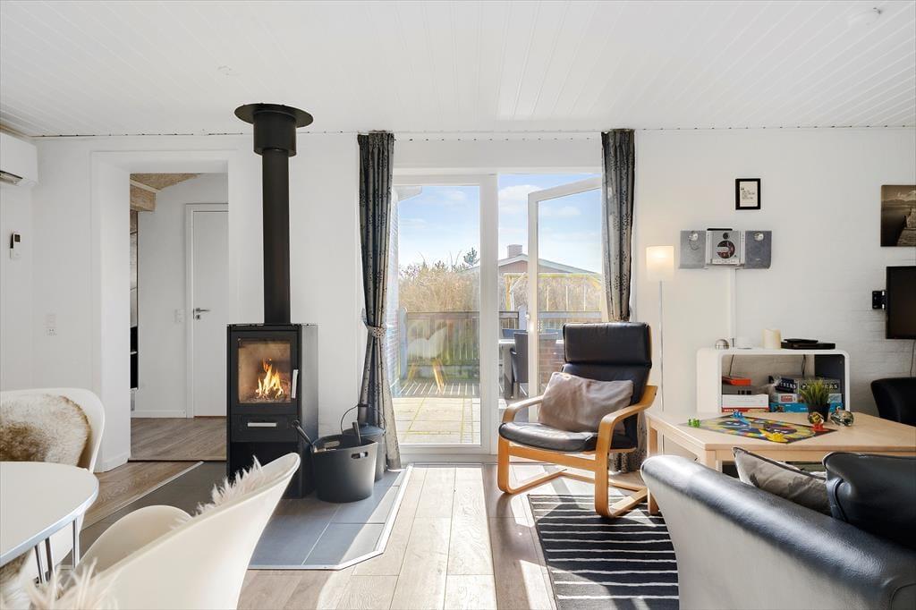 Sommerhusets 104 m2 fordeler sig på to sektioner. Den ene byder på aktivitetsrummet, hvor familiens yngste kan lege, spille og se tv. Her er også et badeværelse med spa samt et depotrum med fryser (sidstnævnte har I adgang til fra terrassen). Husets anden sektion rummer tre gode soveværelser, som i alt kan rumme seks personer. Ved entréen ligger et badeværelse med bruseniche, gulvvarme og sauna, og endelig er der opholdsafdelingen, hvor køkkenet og stuen er forenet. Køkkenet er veludstyret med alt ønskeligt udstyr, inklusiv opvaskemaskine og vaskemaskine, der letter de praktiske opgaver i løbet af ferien. Stuen byder på et spiseafsnit og en sofasektion, og med tv, wi-fi og musikanlæg er underholdningen sikret, mens varmepumpen og brændeovnen hjælper jer med at få den ønskede temperatur.