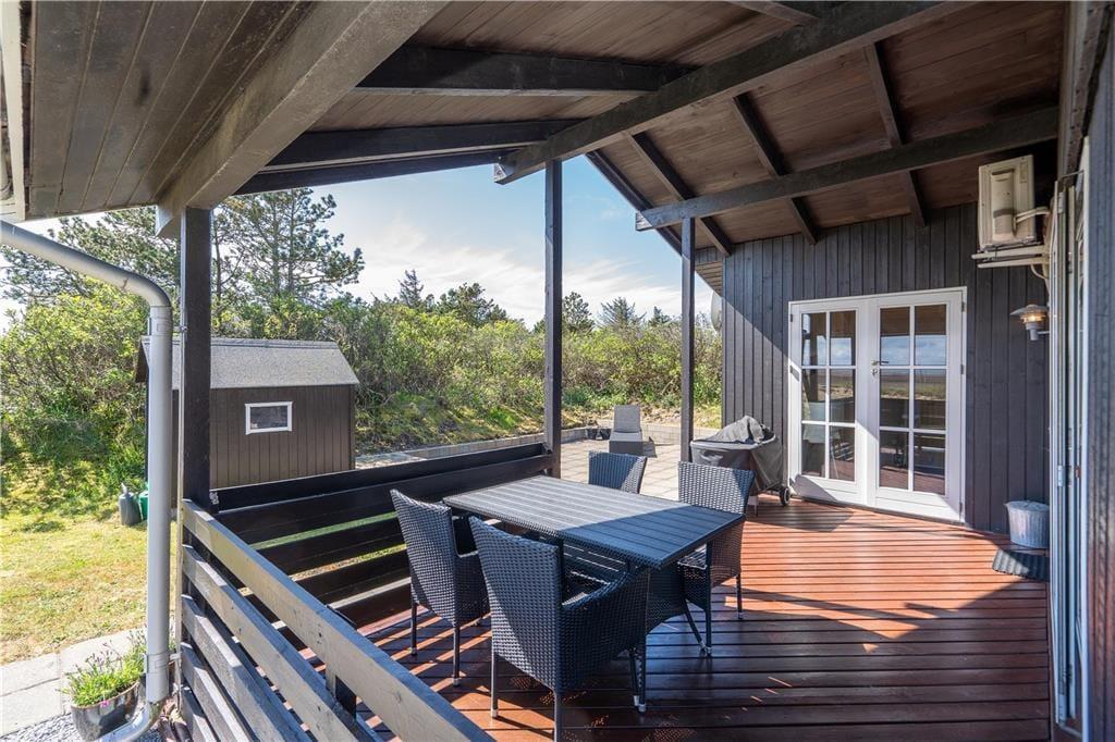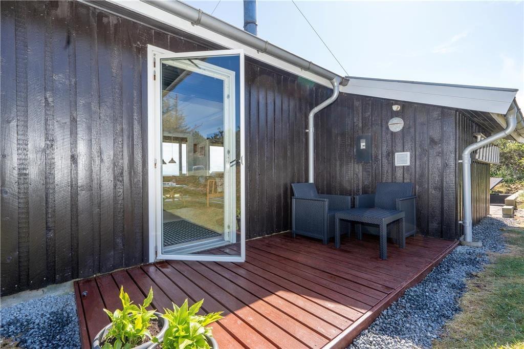 Fra stuen er der direkte adgang til et øst- og sydvendt terrassemiljø med en overdækket og en åben del. Her kan I nyde feriedagene i solen dagen lang, og under overdækningen kan I finde både ly og læ, når I vil grille om aftenen. Fra udearealerne har I et skønt udsyn til mark, eng og fjord. De yngste har god plads til leg, og her er både et gyngestativ og en sandkasse.