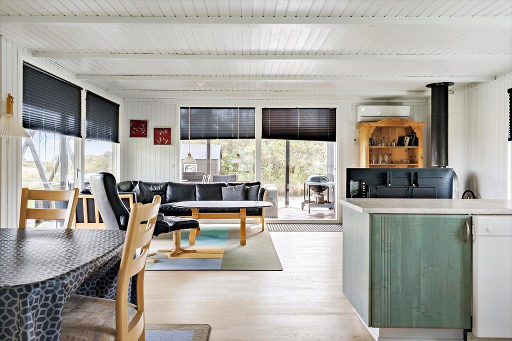 Sommerhuset rummer tre gode soveværelser, som tilsammen giver seks sengepladser, og badeværelset er lyst og pænt indrettet med bruseniche. En god sauna ligger i annekset, der også byder på et bryggers med vaskemaskine, tørretumbler og fiskerensebord. Ferieboligens opholdsrum består af køkken og stue i åben forbindelse, og her sørger varmepumpen og brændeovnen for, at I kan få lige den temperatur, I drømmer om. Køkkenet er veludstyret og byder blandt andet på en opvaskemaskine, mens stuen er indrettet med spisebord og en sofaafdeling med tv. Store vinduespartier lukker masser af lys ind, og herfra kan I nyde den betagende udsigt til naturen og fjorden.