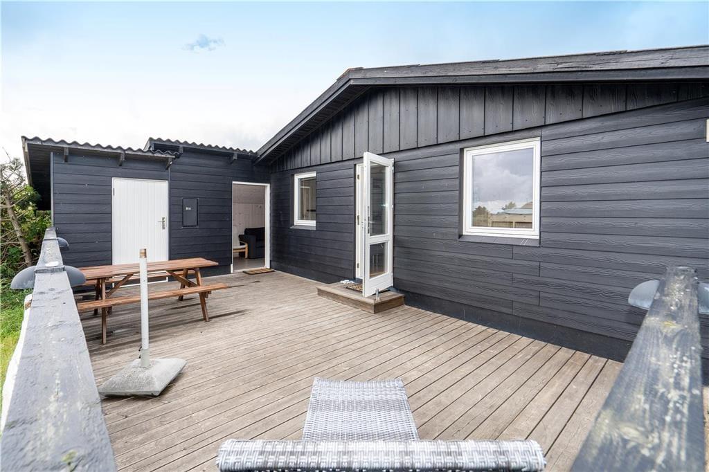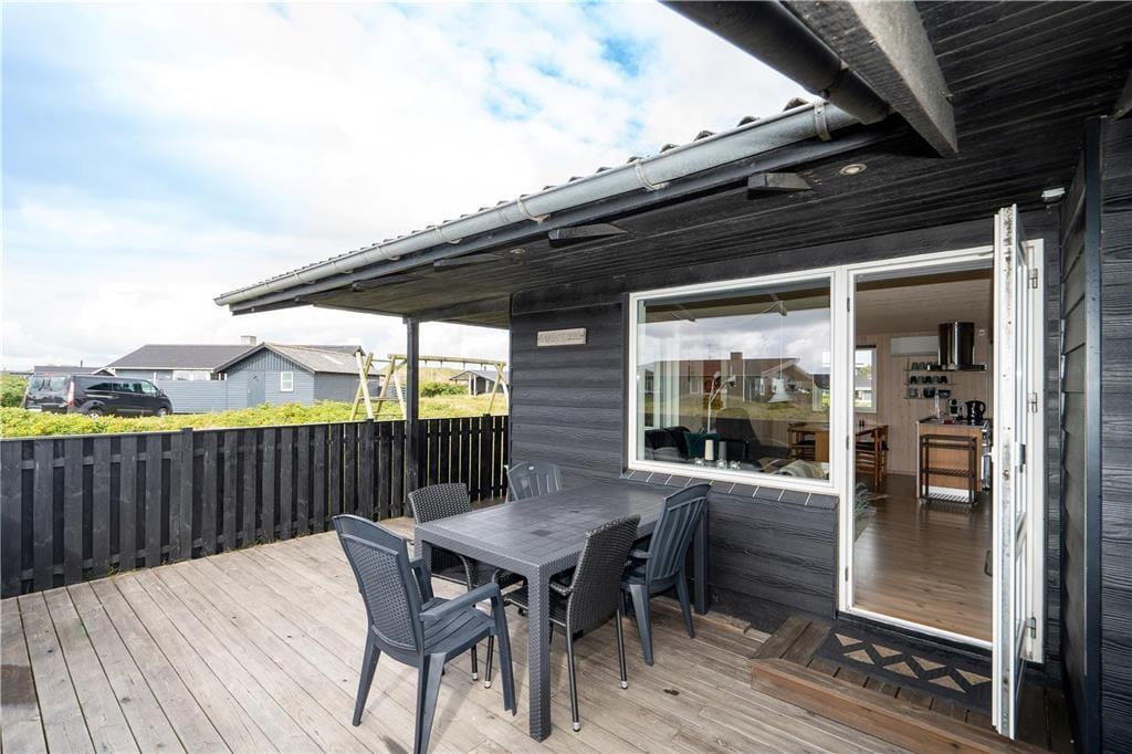 En østvendt terrasse giver mulighed for at nyde morgenkaffen og formiddagens brunch i de første solstråler. I løbet af dagen kan I trække rundt om huset til den sydvestvendte terrasse, der også er aflukket af et stakit, så hunden kan gå frit, hvis den er så heldig at komme med på ferie. Familiens yngste har glæde af et gyngestativ, og naturgrunden giver god plads til at boltre sig.
