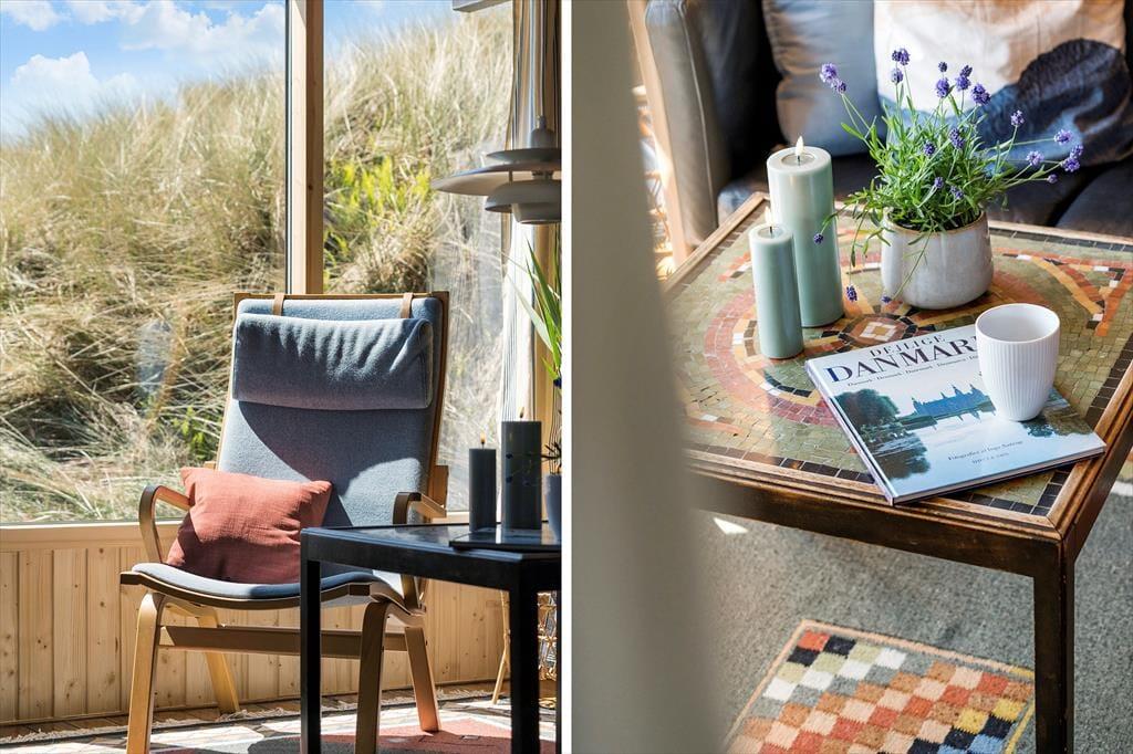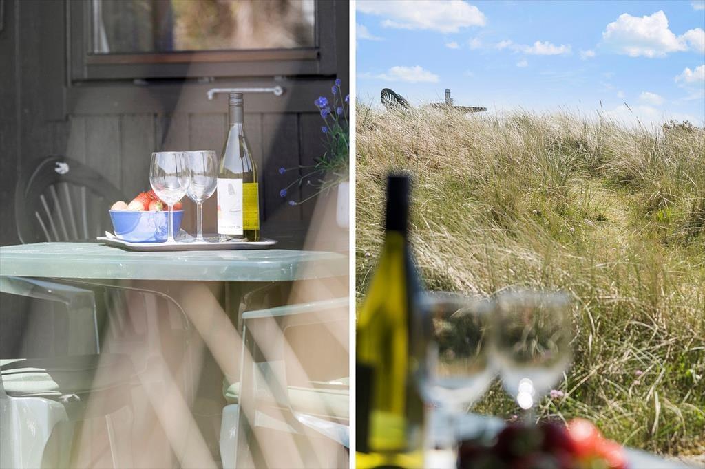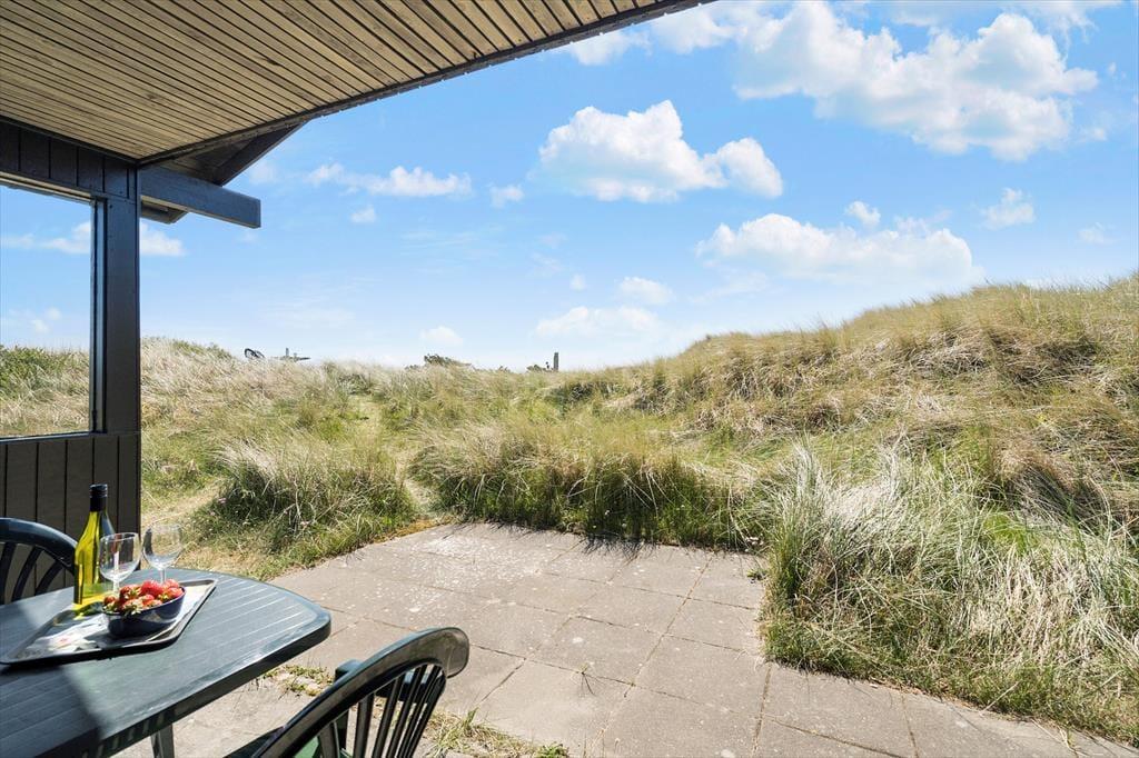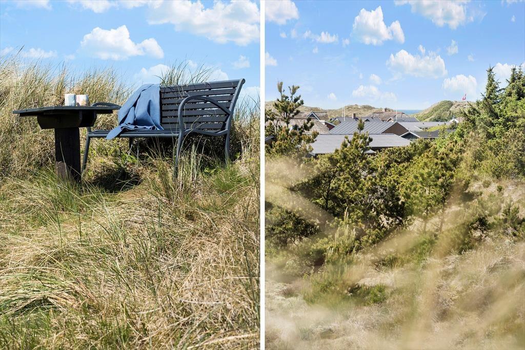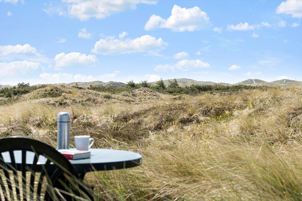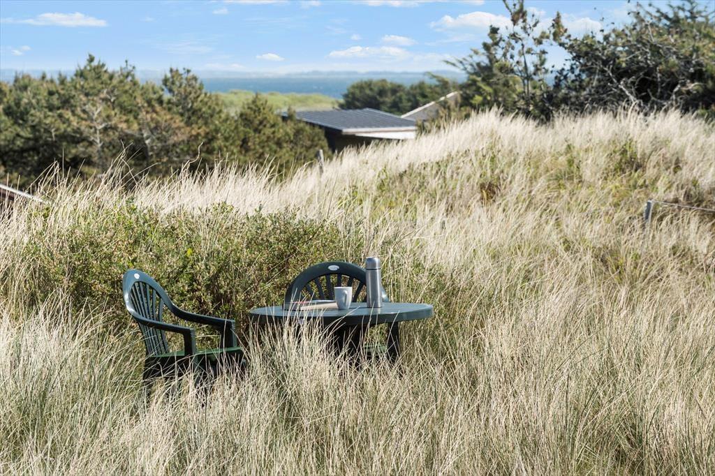 Fra stuen har I direkte adgang til en delvist overdækket terrasse, der vender mod sydvest og ligger dejligt ugeneret på grund af den høje klit. Mod nordøst ligger et overdækket og afskærmet terrasseareal, hvor I kan sidde i læ, mens I kigger ud på det kuperede landskab. Vil I virkelig nyde udsigten, skal I flytte driverlivet op på klitoppen, hvor I kan slappe af på naturgrundens bænk. Panoramavuet er formidabelt, og når solen står højt over Holmsland Klit, er det nemt at mærke feriefreden indfinde sig i krop og sjæl.
