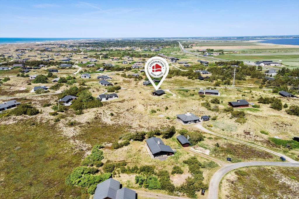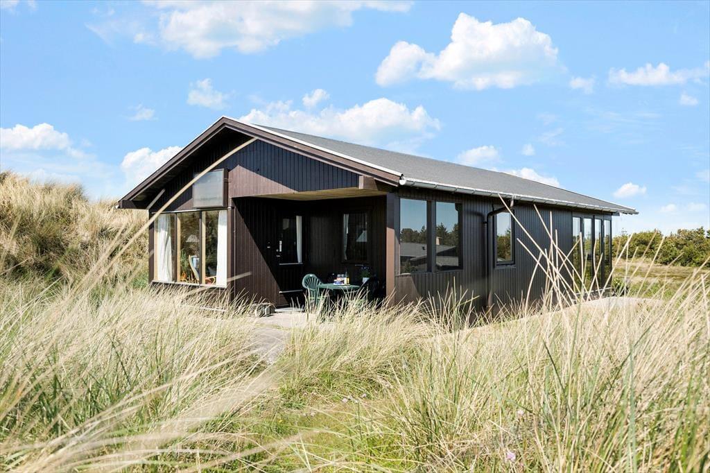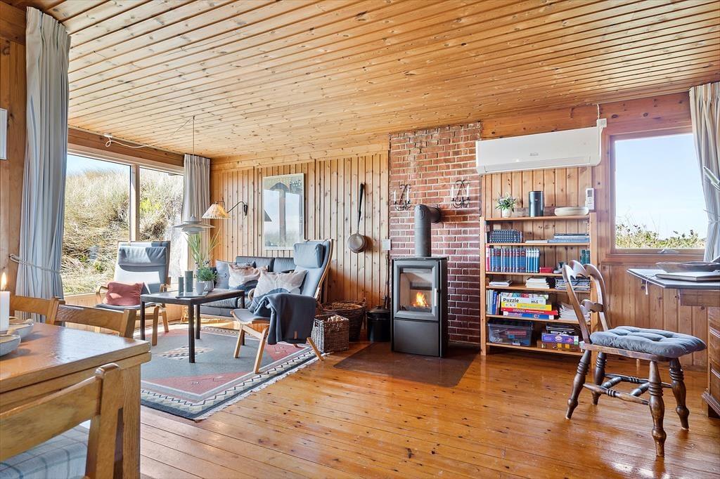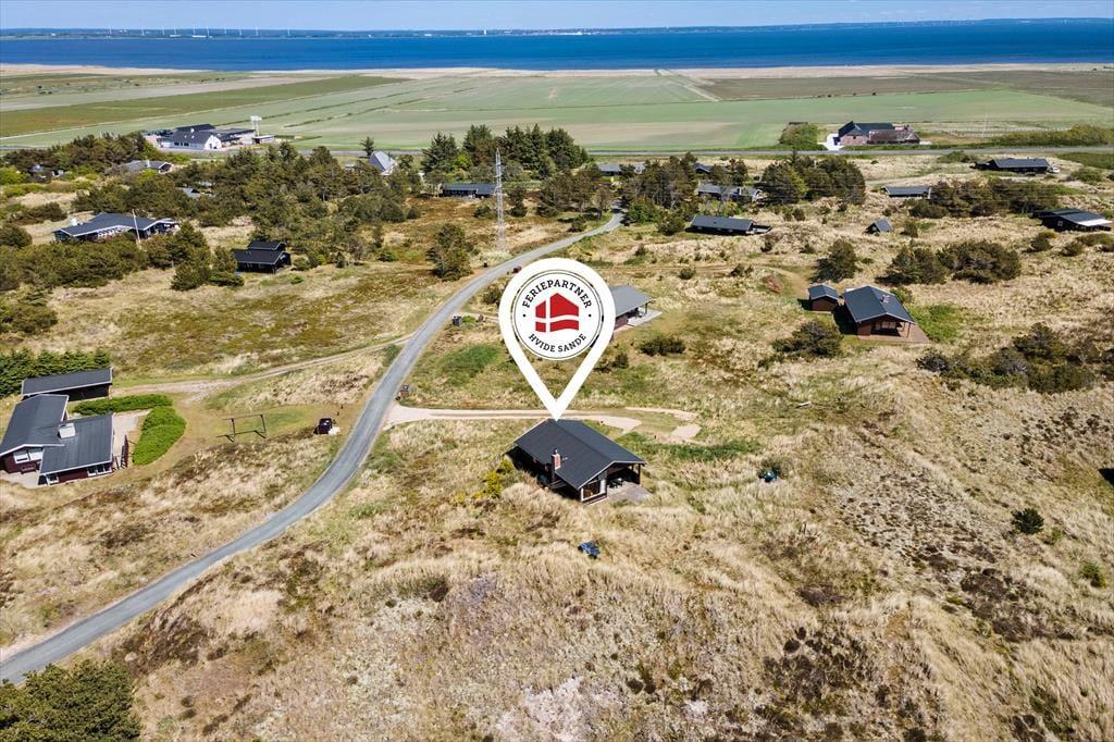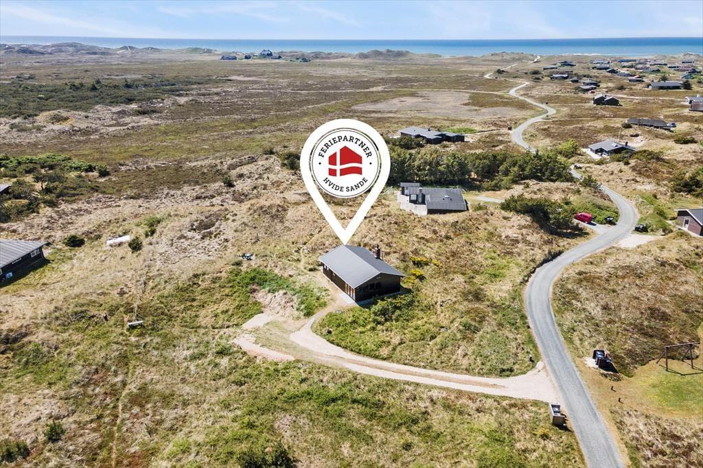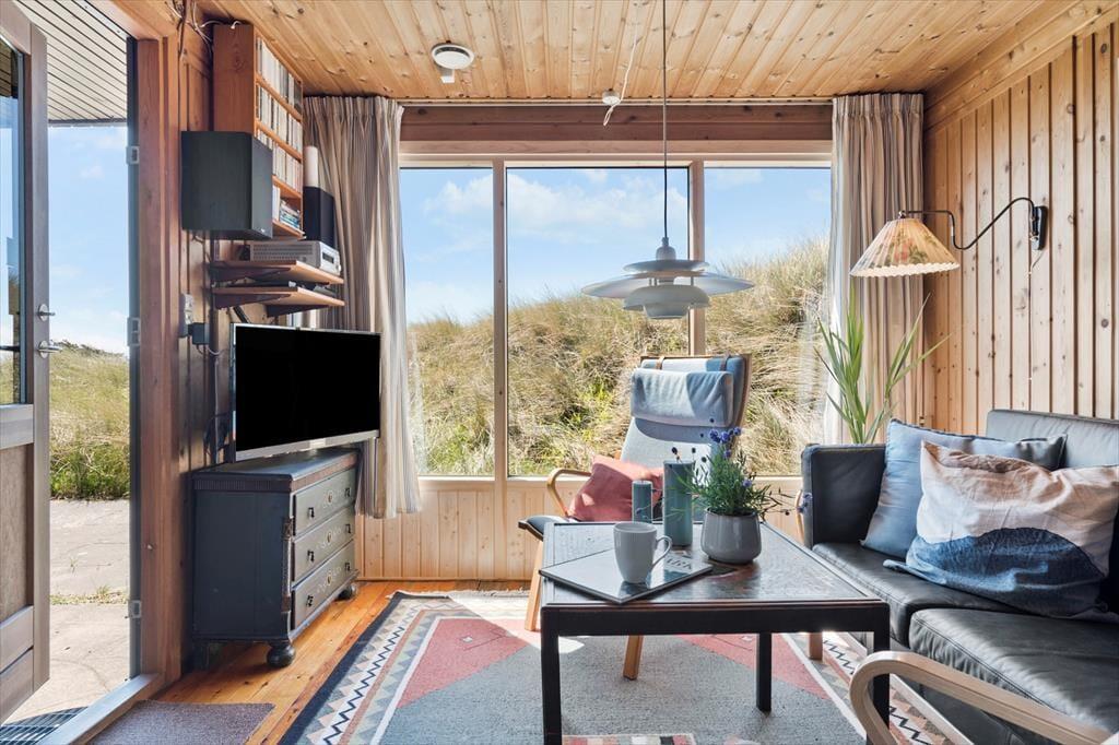 Fra stuen har I direkte adgang til en delvist overdækket terrasse, der vender mod sydvest og ligger dejligt ugeneret på grund af den høje klit. Mod nordøst ligger et overdækket og afskærmet terrasseareal, hvor I kan sidde i læ, mens I kigger ud på det kuperede landskab. Vil I virkelig nyde udsigten, skal I flytte driverlivet op på klitoppen, hvor I kan slappe af på naturgrundens bænk. Panoramavuet er formidabelt, og når solen står højt over Holmsland Klit, er det nemt at mærke feriefreden indfinde sig i krop og sjæl.