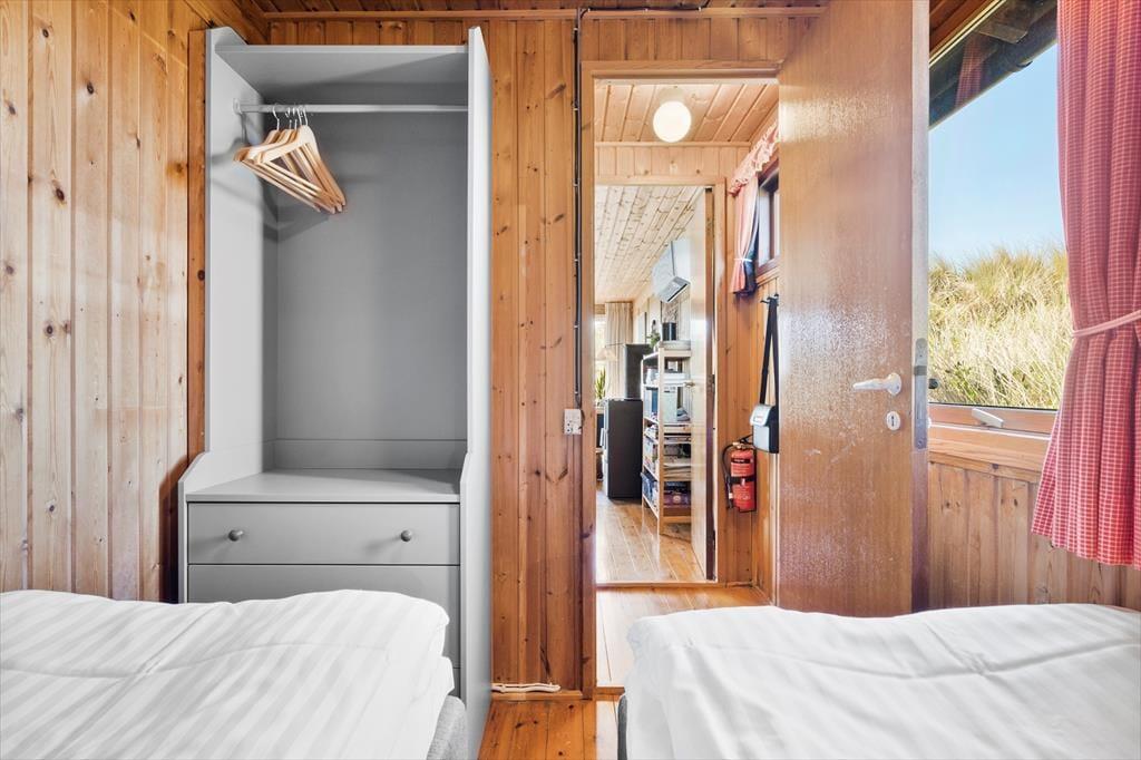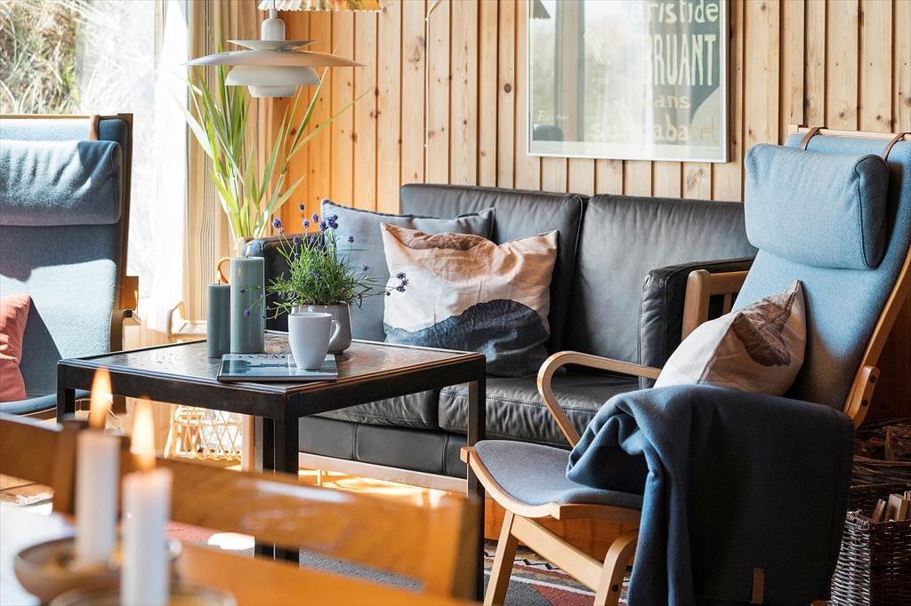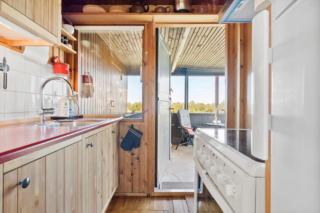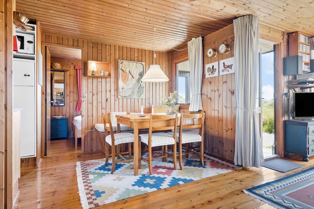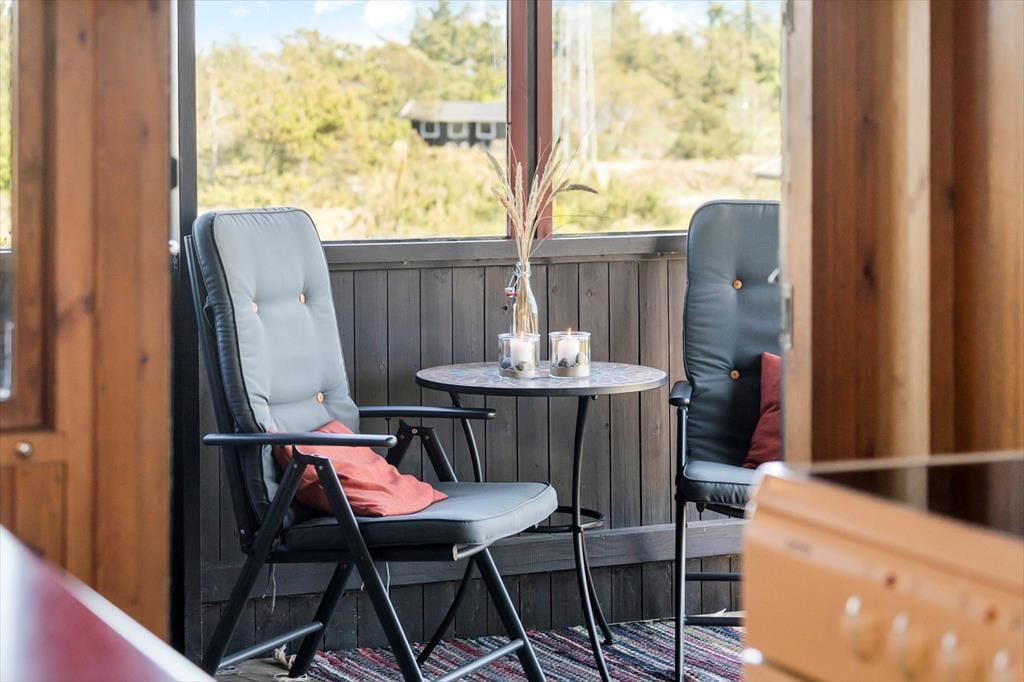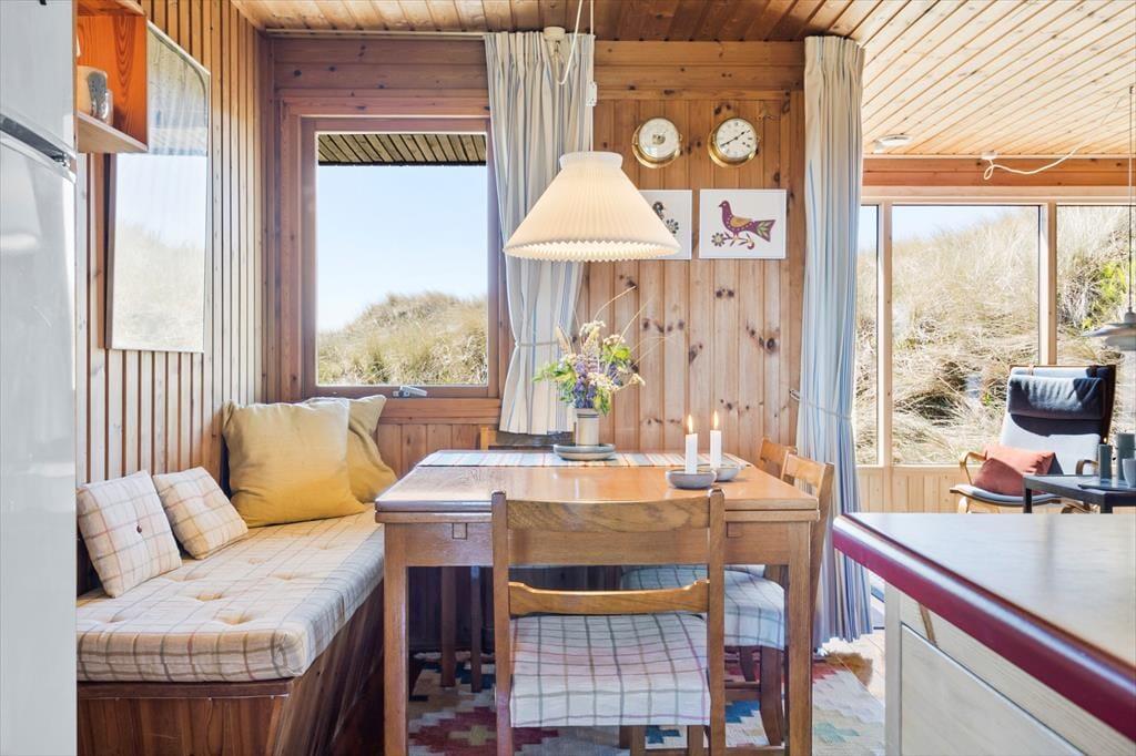 Fra stuen har I direkte adgang til en delvist overdækket terrasse, der vender mod sydvest og ligger dejligt ugeneret på grund af den høje klit. Mod nordøst ligger et overdækket og afskærmet terrasseareal, hvor I kan sidde i læ, mens I kigger ud på det kuperede landskab. Vil I virkelig nyde udsigten, skal I flytte driverlivet op på klitoppen, hvor I kan slappe af på naturgrundens bænk. Panoramavuet er formidabelt, og når solen står højt over Holmsland Klit, er det nemt at mærke feriefreden indfinde sig i krop og sjæl.