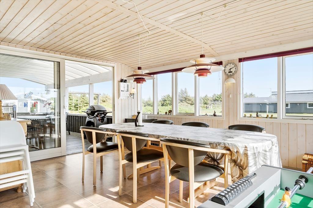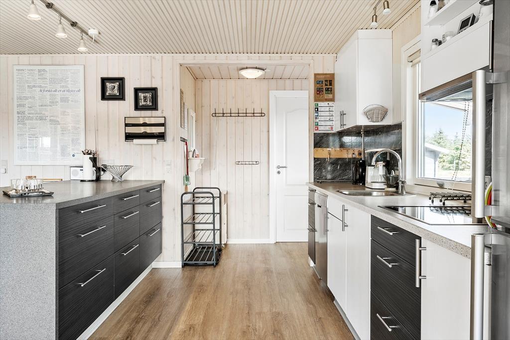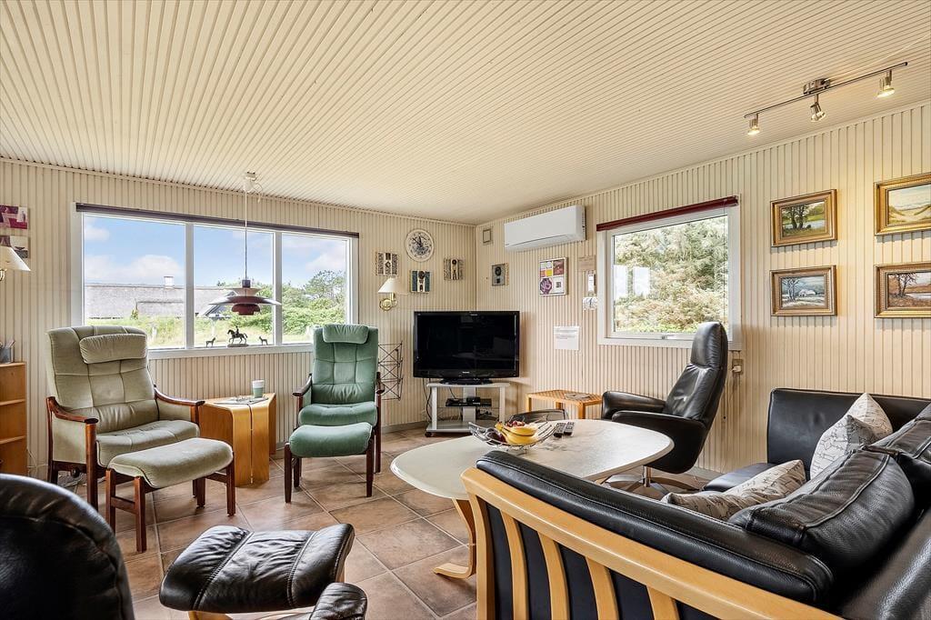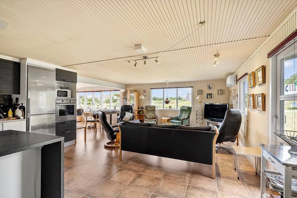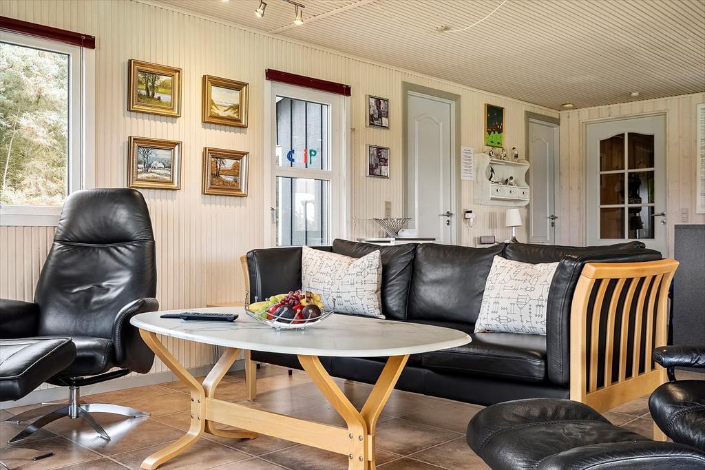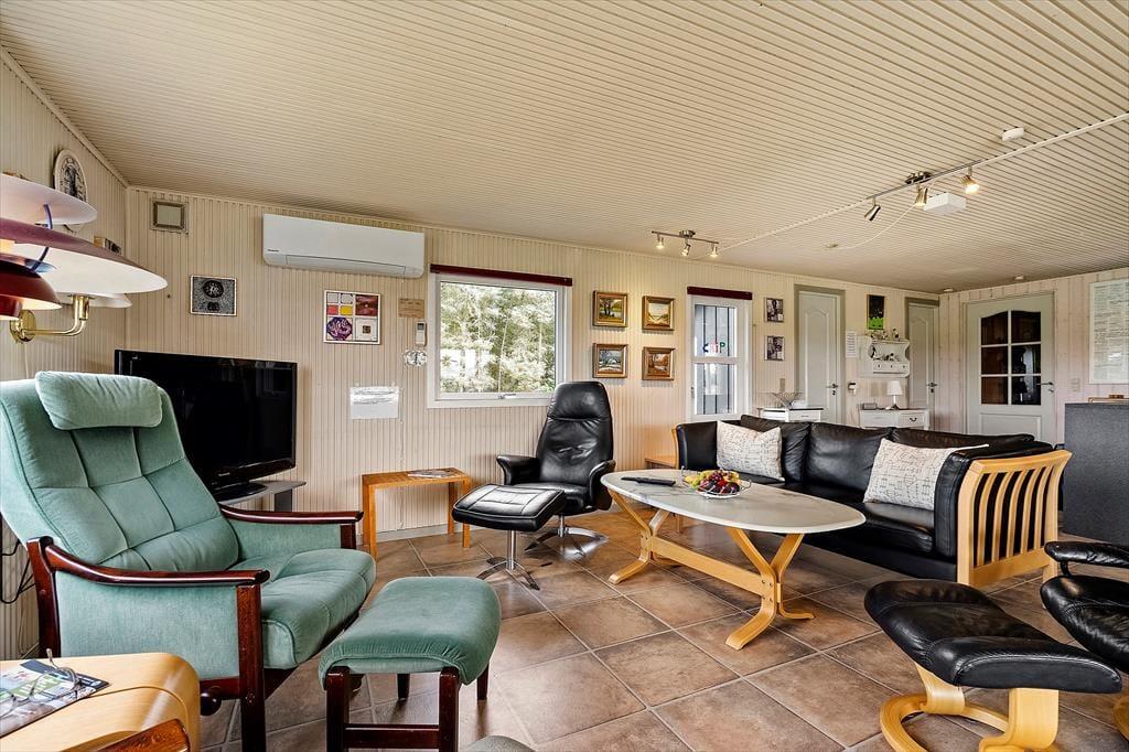 Sommerhuset er ikke bare rummeligt, men har også en glimrende planløsning, så I kan sagtens samles otte personer i huset. To børnefamilier kan oplagt mødes her, for der er et stort opholdsrum, fire soveværelser og et badeværelse at gøre godt med i selve sommerhuset, mens annekset byder på endnu et soveværelse. Annekset byder for øvrigt på et ekstra badeværelse, der er udstyret med vaskemaskine og tørretumbler, så det er muligt at friske feriegarderoben eller strandhåndklæderne op undervejs. I sommerhusets store opholdsrum ligger køkken og stue i åben forbindelse, og derfor kan I nemt nyde hinandens selskab, også selvom der simultant er madlavning, brætspil og sofaafslapning på programmet. Ved køkkenøen er der højstole, hvor I kan få en forfriskning inden aftensmaden, og stuens lange spisebord er placeret med udsigt til den velplejede grund.