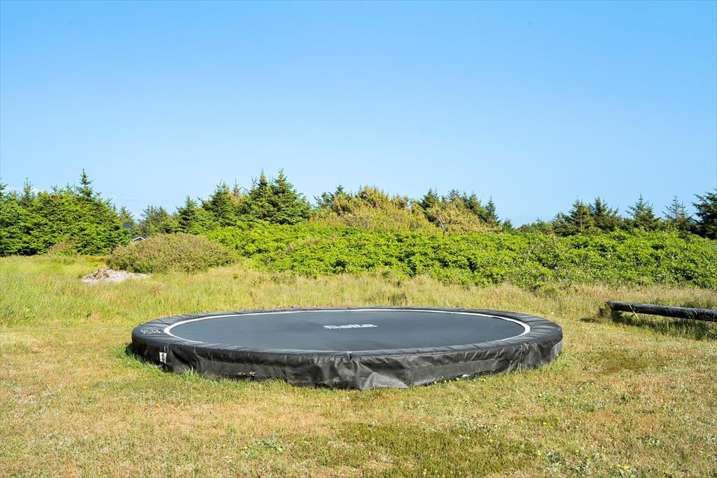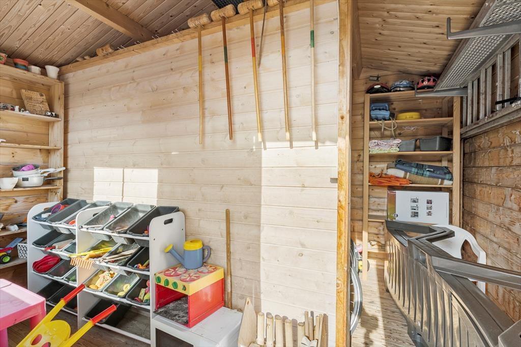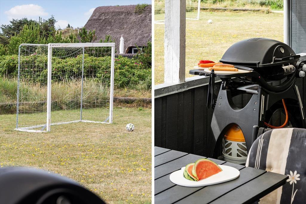Grunden er med sine 2762 m2 dejligt stor, og på græsplænen står der to mål, så hele familien virkelig kan give den gas med fodbolden. Der er også en trampolin såvel som gynger, sandkasse og et legehus – så med andre ord er der masser af aktivitetsmuligheder for børnene, hvis de voksne lige har brug for en rolig pause med kaffe og hyggesnak på terrassen. En lukket og delvist overdækket terrasse er orienteret mod syd, og mod nordvest ligger en åben terrasse.