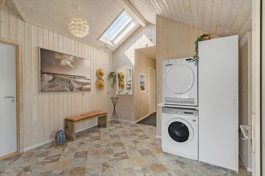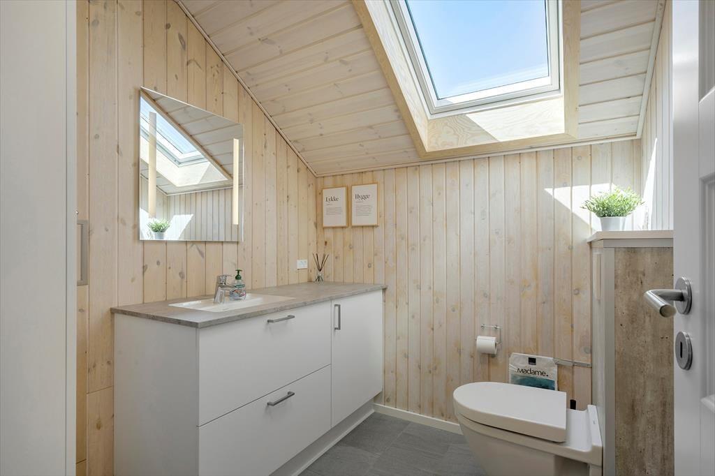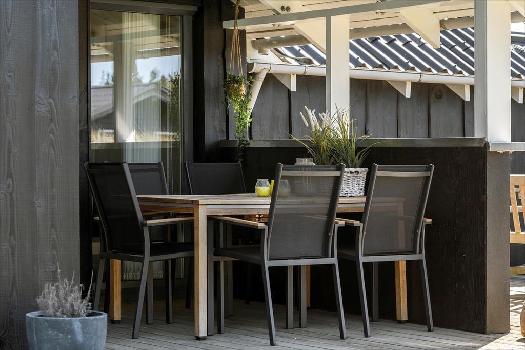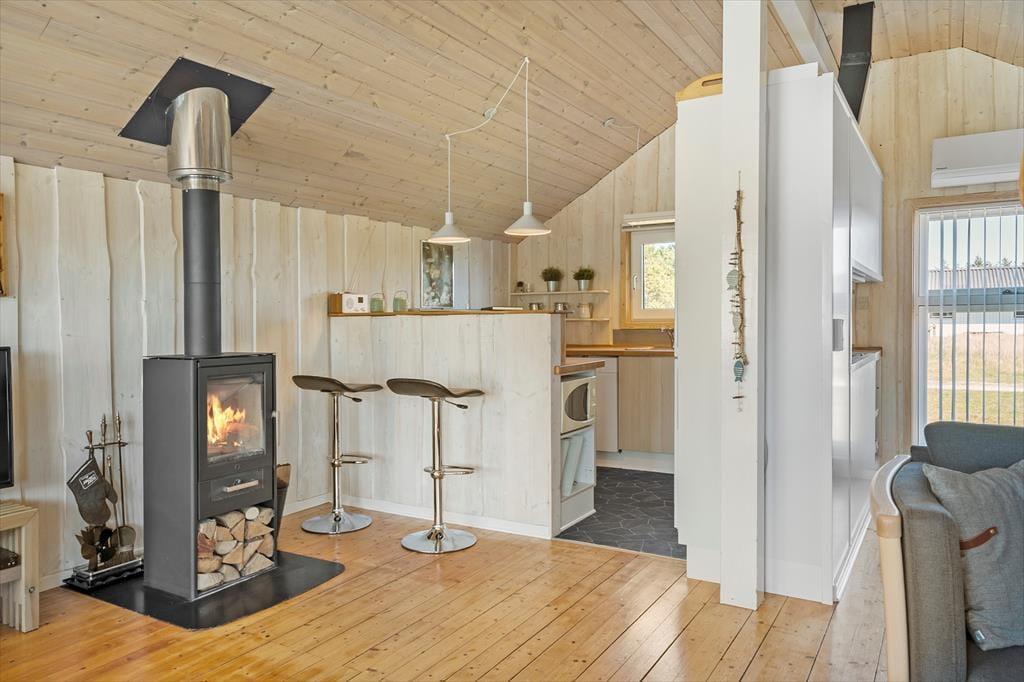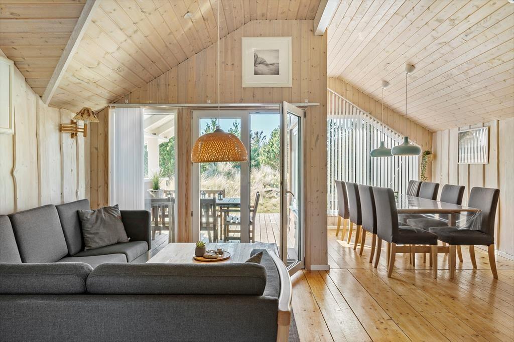 Sommerhuset, der måler 109 m2 og har en god planløsning til fem personer, byder jer velkommen inden døre i en stor og tjekket entré. Her er der både vaskesøjle, et ovenlysvindue og hyggeskabende nips, og det er et glimrende eksempel på, hvor tjekket og indbydende sommerhuset i det hele taget er indrettet. Husets tre gode soveværelser er alle udstyret med komfortable senge og garderobeskabe, og i forlængelse af det lyse brusebadeværelse ligger en sauna, hvor I kan slappe af, når I vender hjem fra dagens udflugter. Det er også skønt at opholde sig i stuen, der er indrettet med bløde siddemøbler, spisebord, brændeovn og fladskærms-tv med både parabol, dvd-afspiller og Chromecast. Et veludstyret køkken ligger i åben forbindelse med stuen, og de store glaspartier sørger ikke bare for et dejligt lysindfald, men giver jer også direkte adgang til terrassen.