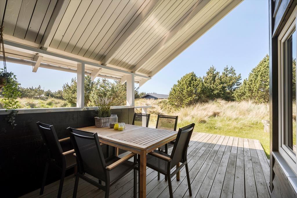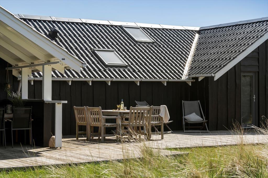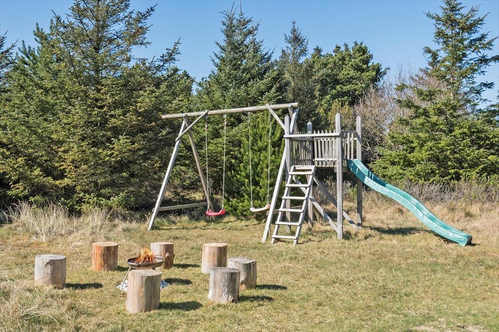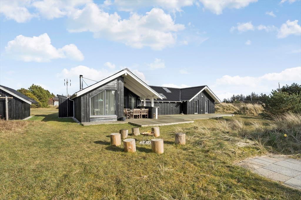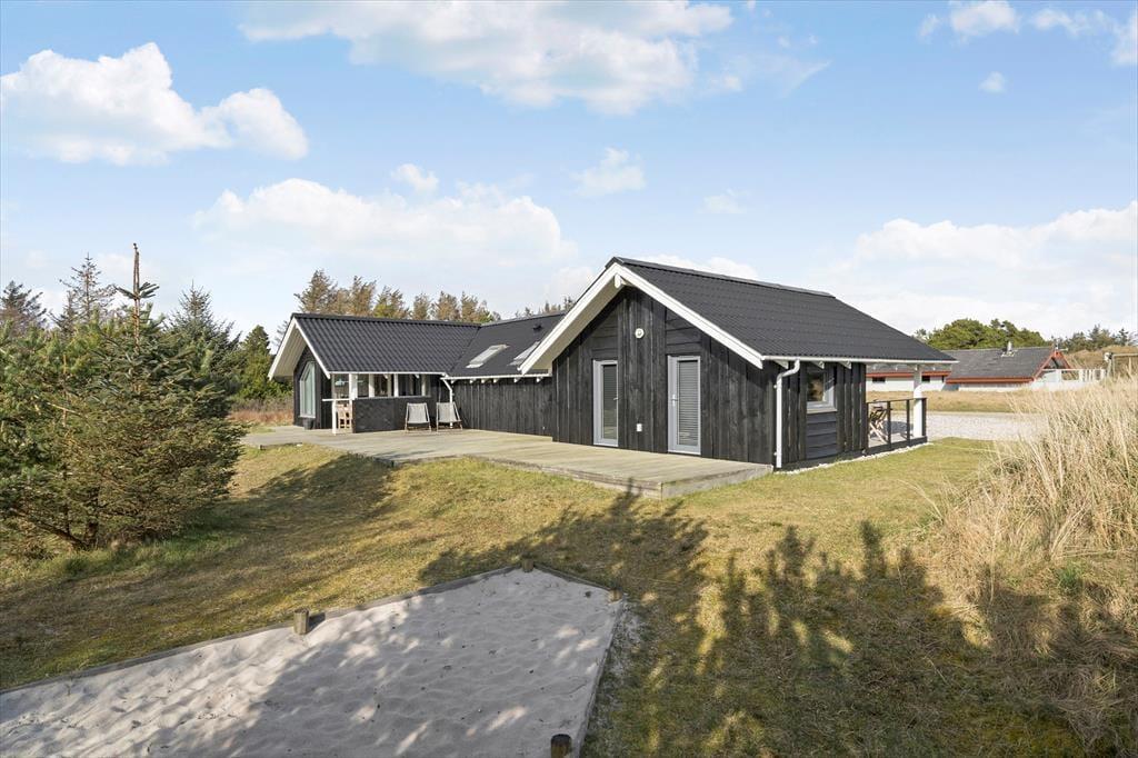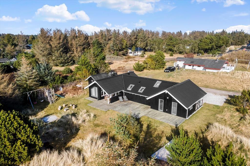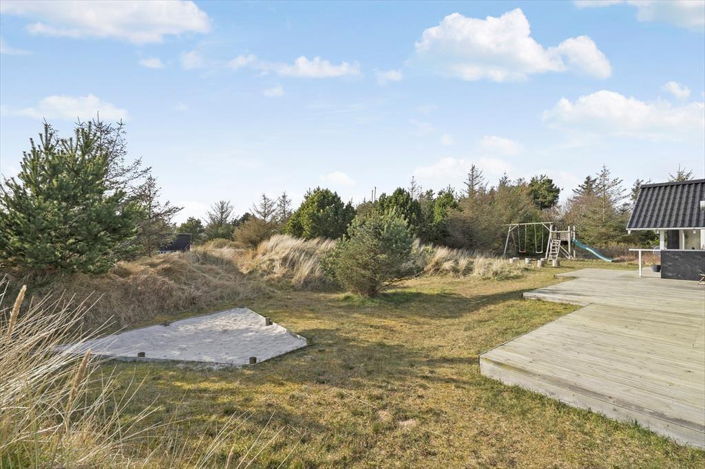 I får plads til både leg og afslapning på den 2050 m2 store naturgrund. Til de alleryngste er der sandkasse og legetårn med gynger, og græsplænen inviterer til boldspil, hvis børnene ikke hellere vil lege gemme mellem grundens små klitter. Den store, vestvendte træterrasse er det perfekte sted at slikke sol og grille, og hvis I ønsker skygge, er der overdækkede arealer på begge sider af huset. Hele familien kan hygge sig rundt om bålstedet, og til lystfiskerne er der en overdækket fiskerenseplads.
