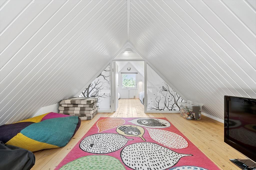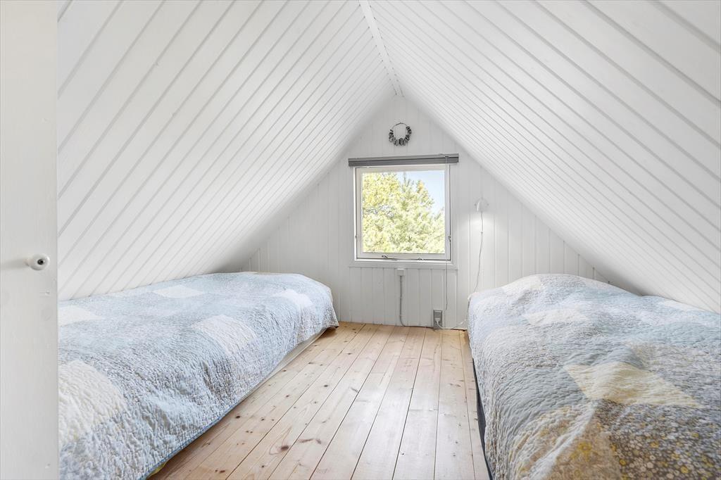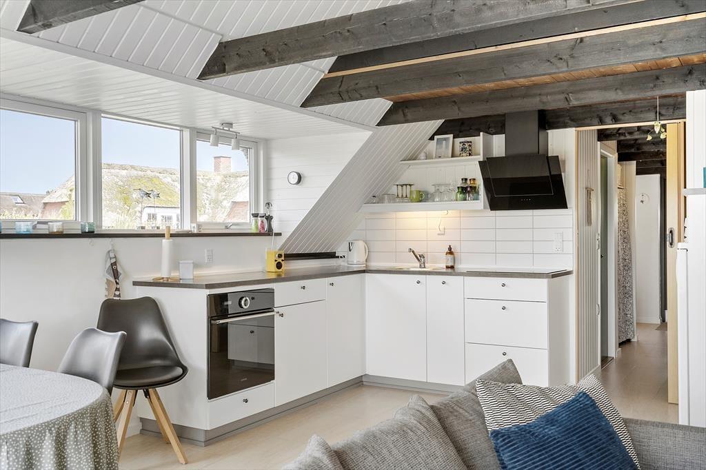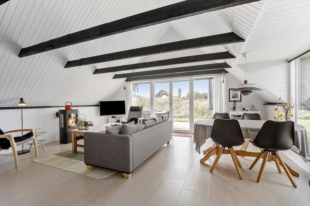 Inde bag sommerhusets hvide facade og høje stråtag er der godt at være. De skrå vægge og rustikke hanebjælker er med til at skrue op for hyggestemningen, som brændeovnen og det komfortable møblement også leverer. Stue og køkken er slået sammen til et stort og indbydende opholdsrum, og her kommer I sikkert til at tilbringe mange gode timer med at spise god mad og slappe af i sofaen med bøger, krydsogtværser eller film. Vinduer mod syd og vest inviterer dagslyset indenfor og giver udsigt til naturgrunden og det kønne sommerhusområde, og havedøren gør det nemt at tage terrassen i brug. Planløsningen byder desuden på en entré med vaskemaskine, et brusebadeværelse og to soveværelser.