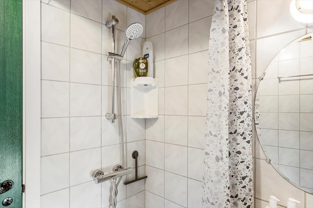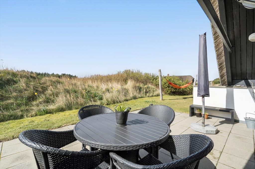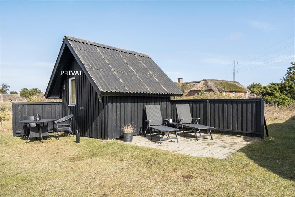 Sommerhusets sydvendte terrasse er en skøn opholdsplads. Der er også en stor træterrasse på den anden side af huset såvel som en mindre terrasse ved skuret, hvor I kan finde læ og sol. Omgivelserne er dejligt fredelige her for enden af den lukkede vej, og naturgrundens græsplæne giver familiens hund plads til at boltre sig.