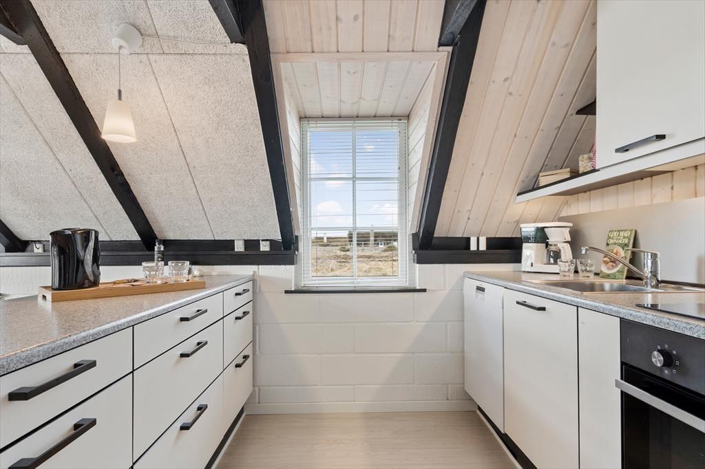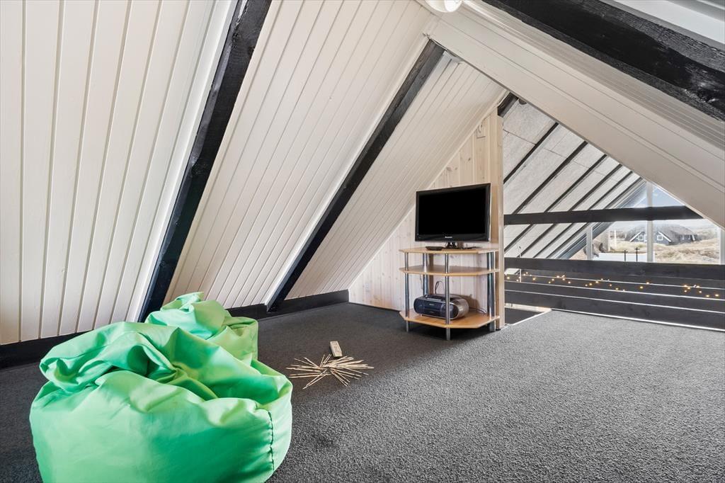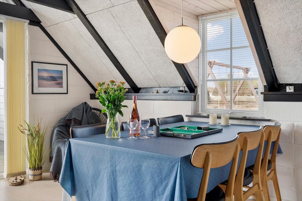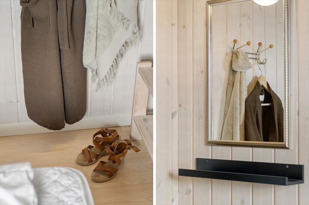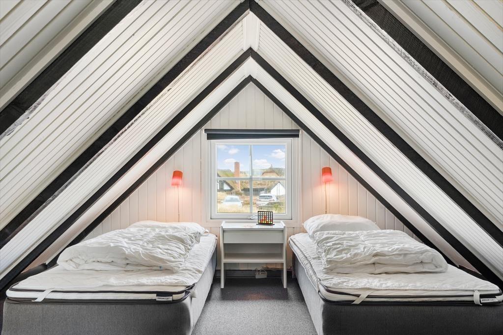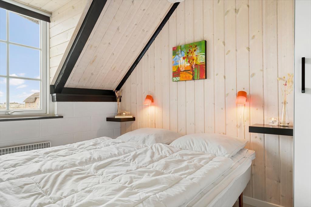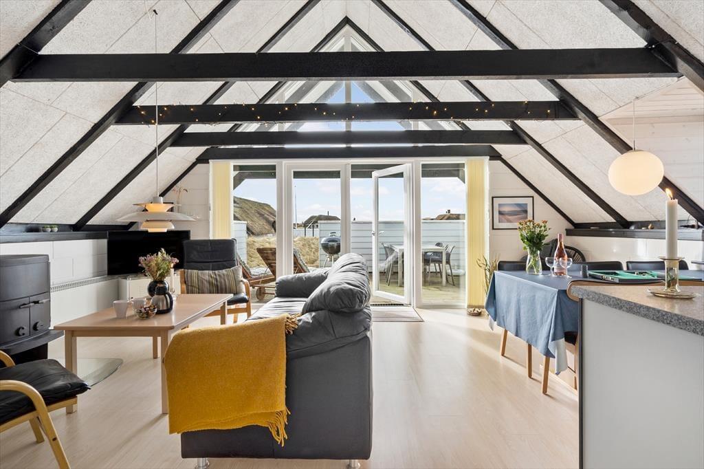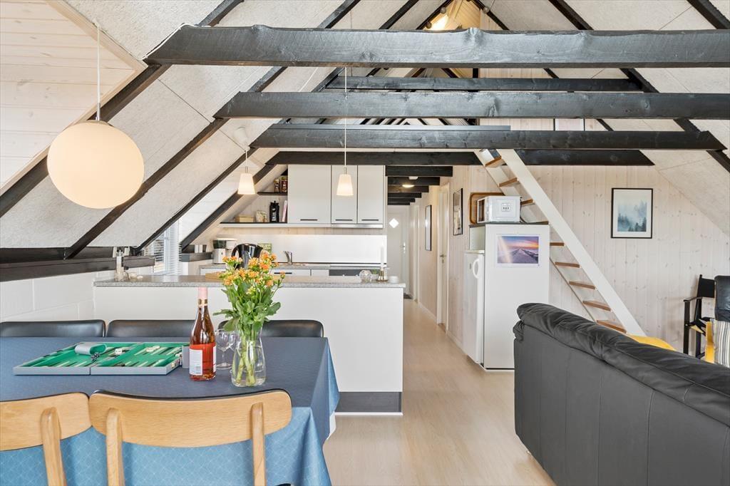 Sommerhuset er med to soveværelser og to senge på hemsen velegnet til fire voksne og to børn. Begge værelser ligger i den ene ende af huset ved siden af et brusebadeværelse og et bryggers med vaskemaskine og tørretumbler. I den anden ende ligger stue og køkken samlet, og herfra fører en stige op til den hyggelige hems. I køkkenet har I alt, hvad I skal bruge for at lave lækker mad, og stuens pæne møblement indbyder til mange hyggelige stunder – uanset om det er lækre måltider, brætspil eller filmaftener nær brændeovnen, I er i humør til.