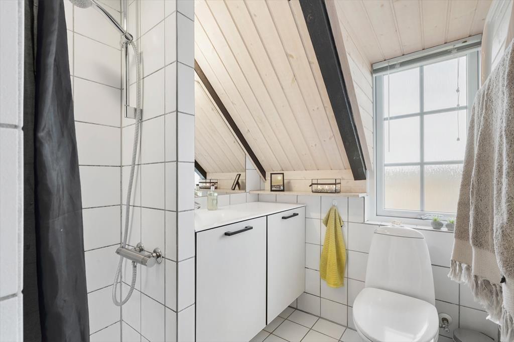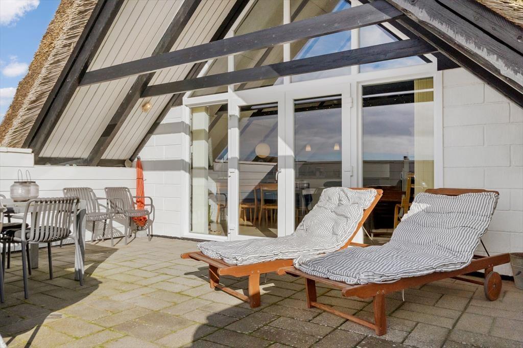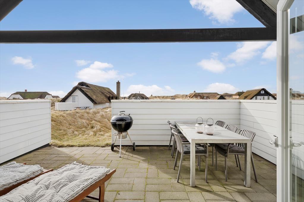 Rundt om sommerhuset har I flere gode opholdspladser at vælge imellem. Den sydvendte terrasse er stor, delvist overdækket og afskærmet, så det er en god og ugeneret solkrog. Derudover er der en mindre morgenterrasse mod øst, hvor I kan indtage dagens første kop kaffe, og I kan også slå jer ned på vestsiden af huset, hvor der står et bord- og bænkesæt såvel som et gyngestativ.