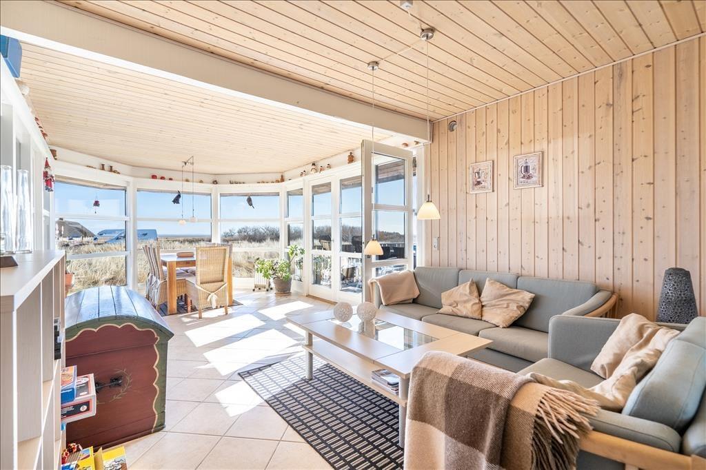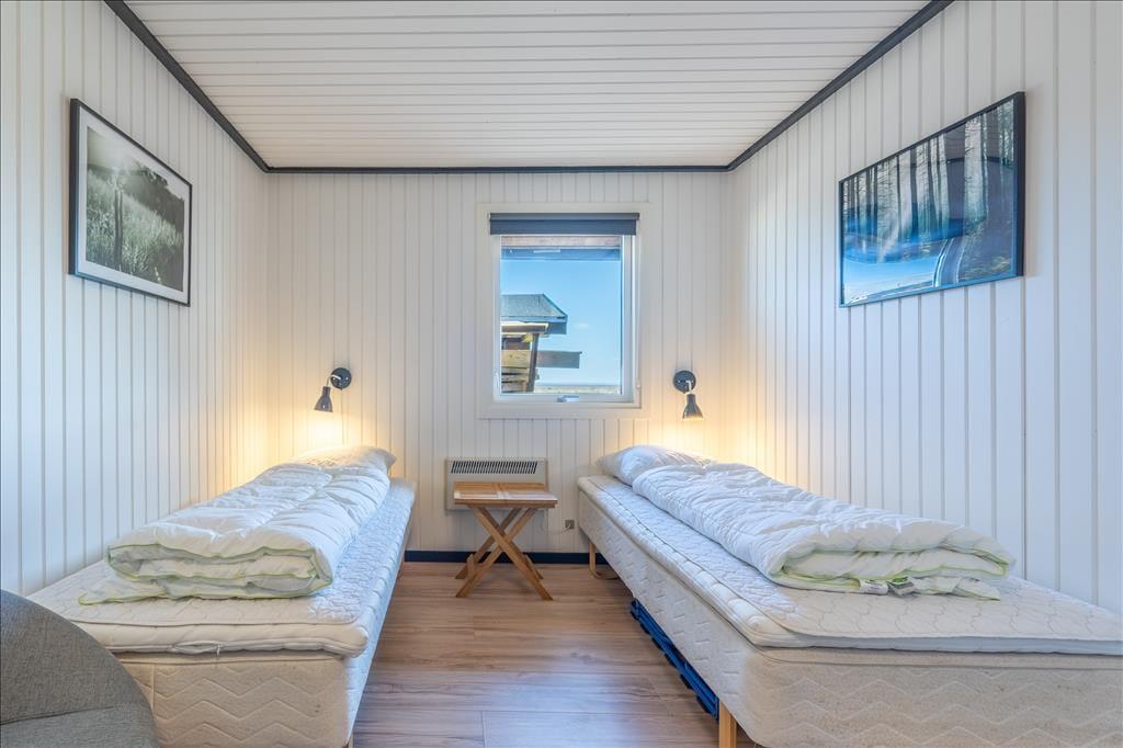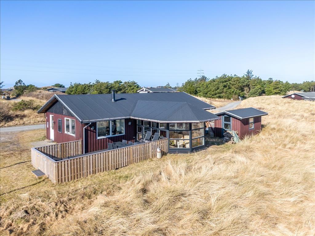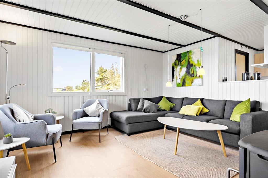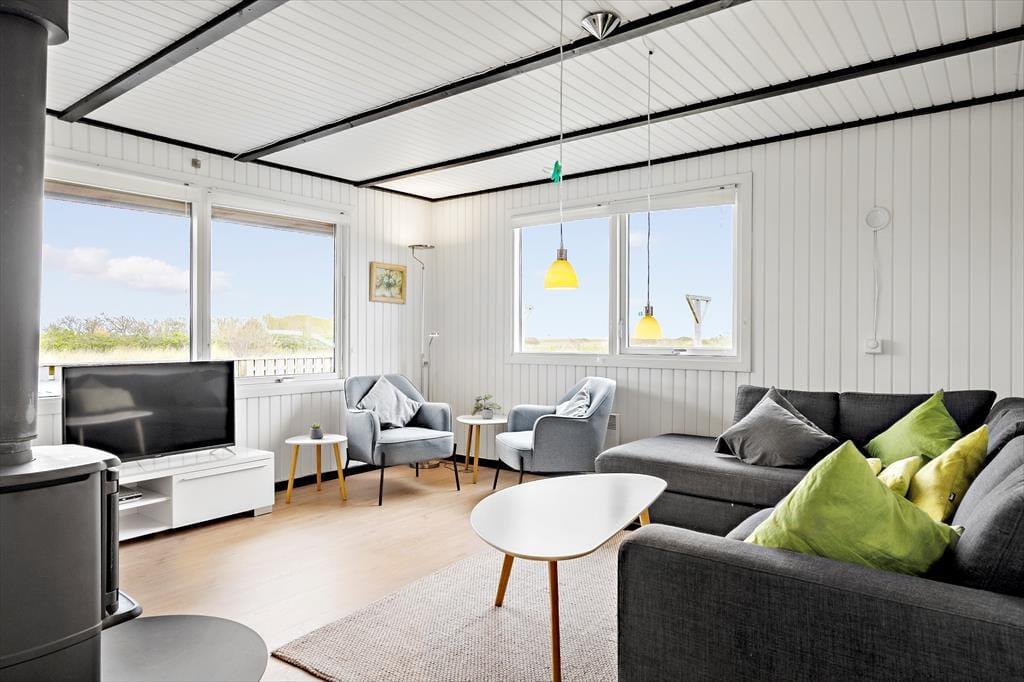 Inden døre i det 111 m2 store sommerhus bliver I budt velkommen i en lille entré, og herfra går turen videre ind til husets hjerte: et skønt opholdsrum med køkken-alrum og stue i åben forbindelse. Her er der både brændeovn og fladskærms-tv med Chromecast – men hvis I vil se film, kræver det dog, at I kan løsrive blikket fra den fine udsigt over de åbne vidder og Holmsland Klit. Fra den tilstødende havestue kan I også nyde det smukke landskab gennem panoramavinduerne, der samtidig sørger for et skønt lysindfald. Tænk, at starte dagen med at sidde her med en varm kop kaffe, mens solen står op over fjorden! Planløsningen byder også på et badeværelse med sauna samt tre fine soveværelser, der egner sig godt til fire voksne og to børn.