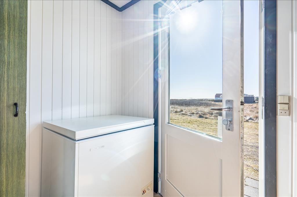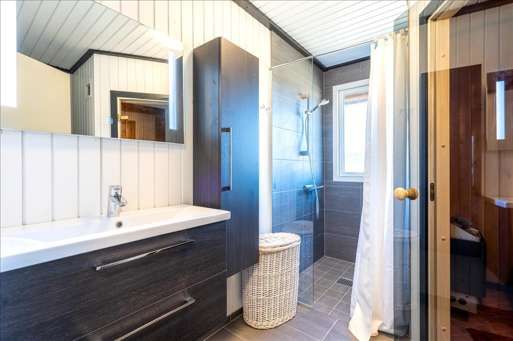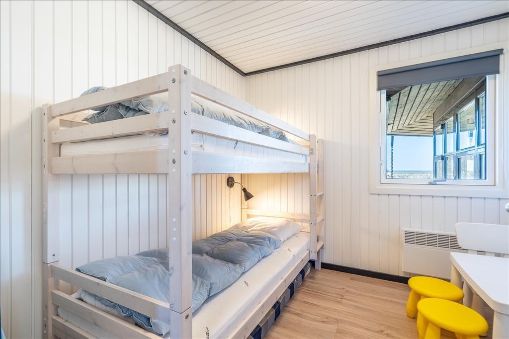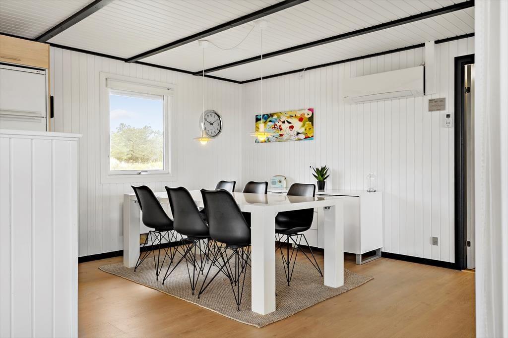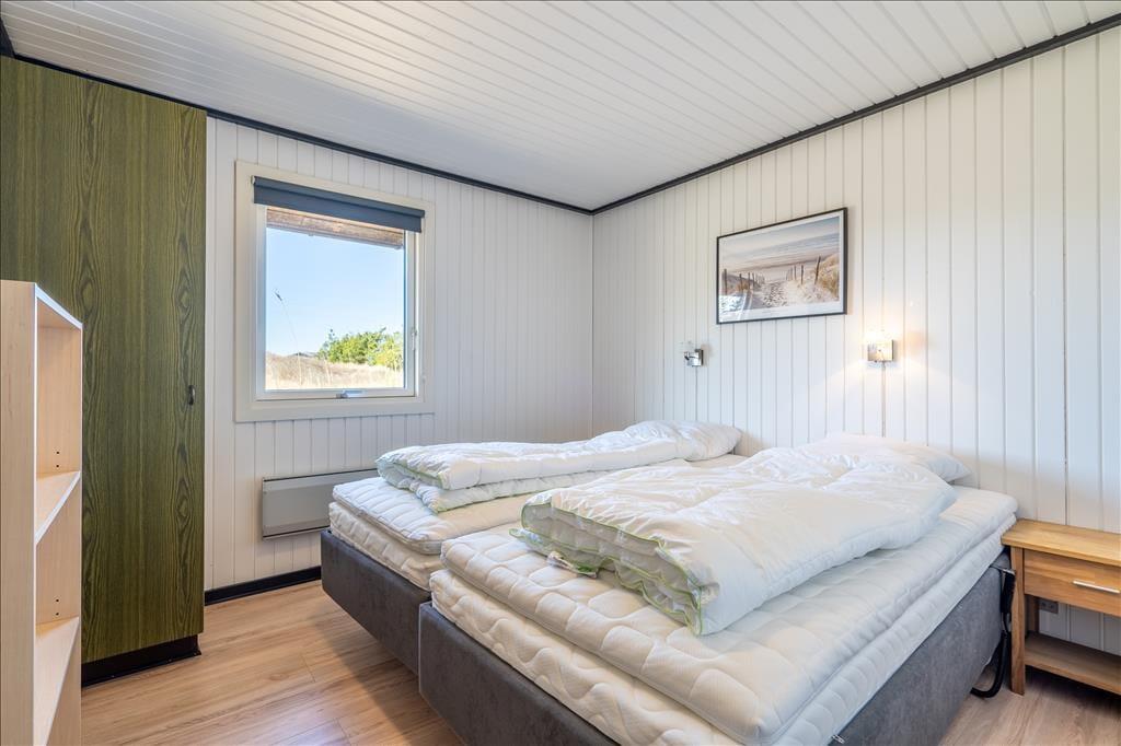 Inden døre i det 111 m2 store sommerhus bliver I budt velkommen i en lille entré, og herfra går turen videre ind til husets hjerte: et skønt opholdsrum med køkken-alrum og stue i åben forbindelse. Her er der både brændeovn og fladskærms-tv med Chromecast – men hvis I vil se film, kræver det dog, at I kan løsrive blikket fra den fine udsigt over de åbne vidder og Holmsland Klit. Fra den tilstødende havestue kan I også nyde det smukke landskab gennem panoramavinduerne, der samtidig sørger for et skønt lysindfald. Tænk, at starte dagen med at sidde her med en varm kop kaffe, mens solen står op over fjorden! Planløsningen byder også på et badeværelse med sauna samt tre fine soveværelser, der egner sig godt til fire voksne og to børn.