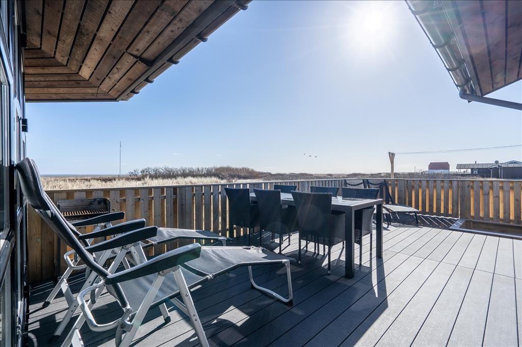 I solrigt og sommerligt vejr er det skønt at slappe af og nyde ferielivet på den sydøstvendte terrasse. Den ligger ved siden af havestuen og har samme flotte fjordudsigt, og så er den både stor og indhegnet, så små børn eller familiens hund kan hygge sig her i trygge rammer. Terrassen er udstyret med havemøbler og en grill, og til børnene er der en indbygget sandkasse.