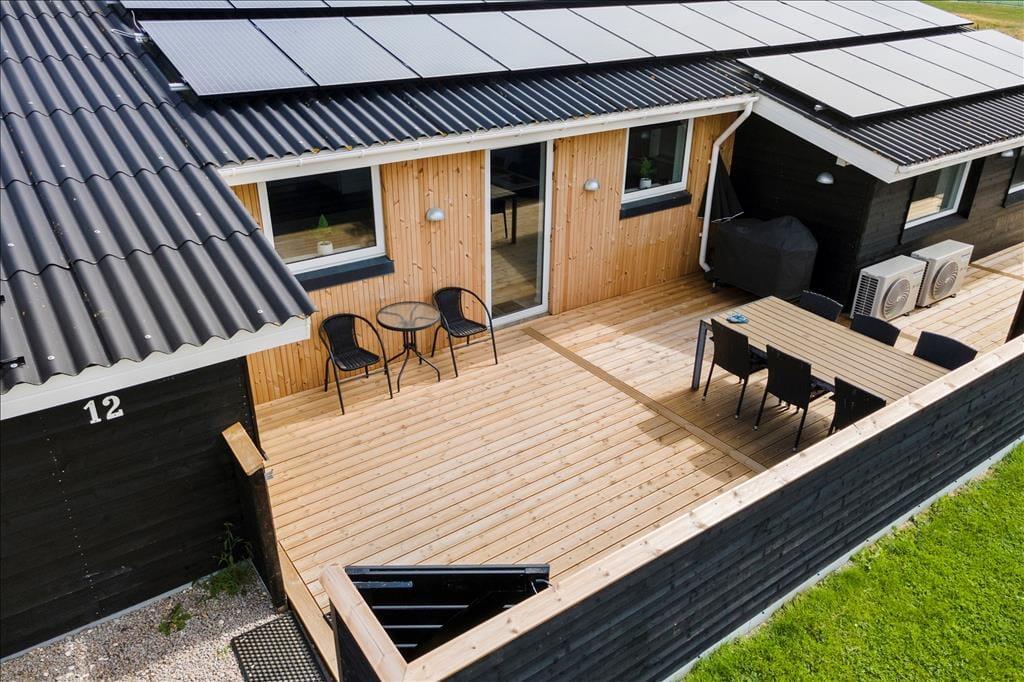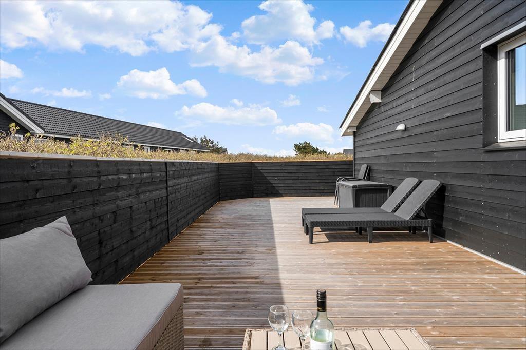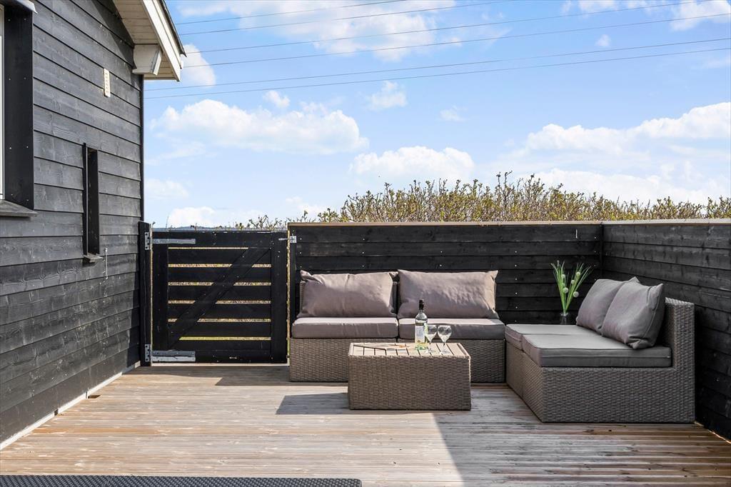 Når solen er fremme, og temperaturerne lune, kan I glæde jer til at indtage terrassen. Øst for huset ligger en mindre fliseterrasse, men mon ikke I vil foretrække den store træterrasse, der breder sig syd og vest for sommerhuset. Terrassen er helt aflukket, så den er et trygt tilholdssted for små børn og hunde, og kvalitetshavemøbler og -liggestole sørger for, at I får det behageligt. På den store naturgrund har I masser af plads til at lege og boltre jer, og mod øst kan I nyde det fine kig til fjordengene og vandet.