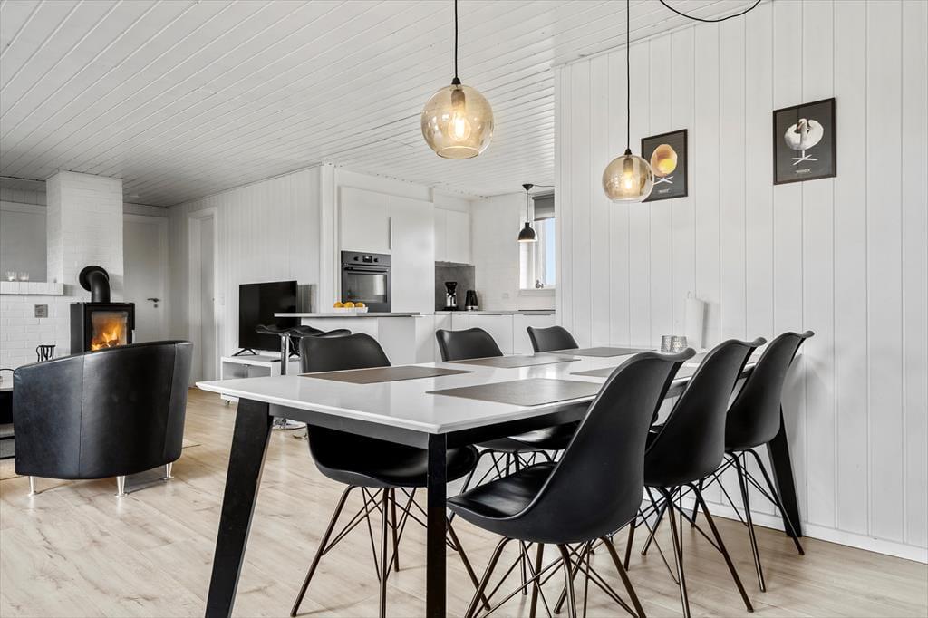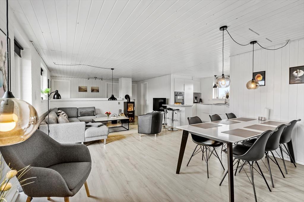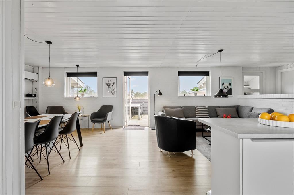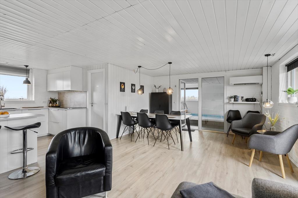 Den dejlige poolafdeling er langt fra den eneste kvalitet ved sommerhuset. Inden døre kan I nyde udsigten til Ringkøbing Fjord – blandt andet fra køkkenet og den øverste bænk i saunaen – mens selve huset har et lyst og indbydende indre efter seneste renovering. Køkken og bad er udskiftet i 2022, så I får en god og moderne ramme om både madlavningen og morgenbrusebadet. Køkkenet ligger i åben forbindelse med stuen, hvor I kan hygge jer i sofaen nær brændeovnen eller samles til lækre måltider omkring spisebordet. Det stilfuldt indrettede rum er udstyret med fladskærms-tv med Chromecast, og der er god wi-fi-forbindelse, hvis I vil surfe på jeres egne devices. De fire soveværelser har sengepladser til otte personer, og på det største af husets to badeværelser er der vaskemaskine og tørretumbler. Det andet badeværelse ligger som del af wellnessafdelingen, som lokker med et topersoners spabad, en skøn sauna og en 15 m2 stor swimmingpool.
