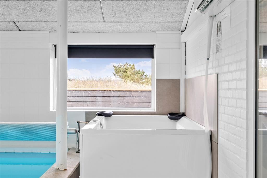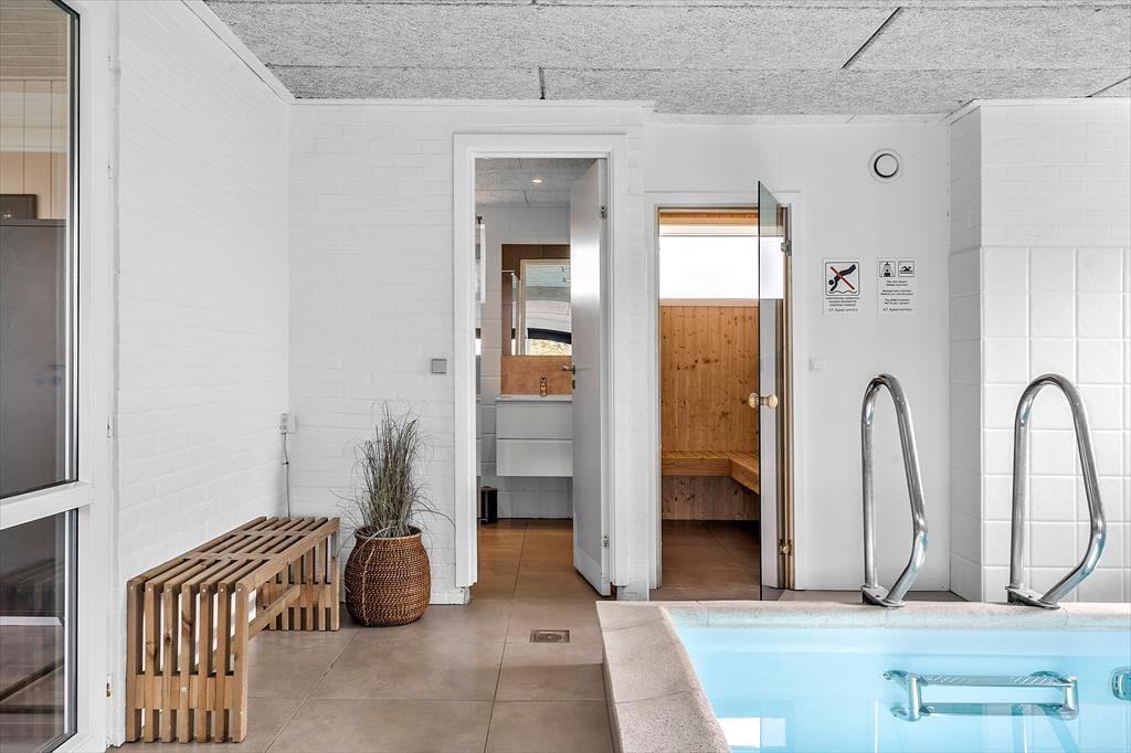 På Vestklitvej 12 i Klegod kan I holde badeferie året rundt! Dette store livsnydersommerhus til otte personer er nemlig udstyret med en wellnessafdeling med swimmingpool, spabad og sauna, så hvis vejret er for koldt til at svømme i Vesterhavet, har I rig mulighed for at plaske og nyde livet inden døre.