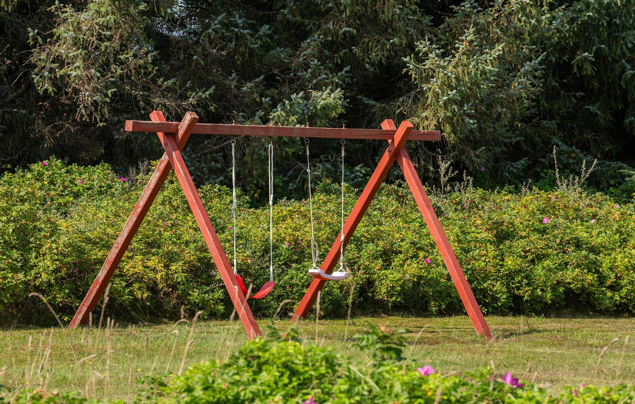 Når solen skinner, kan I dække morgenbordet på terrassen og nyde udsigten til den store naturejendom og den store græsplæne, som giver børnene masser af plads til leg og sjov.