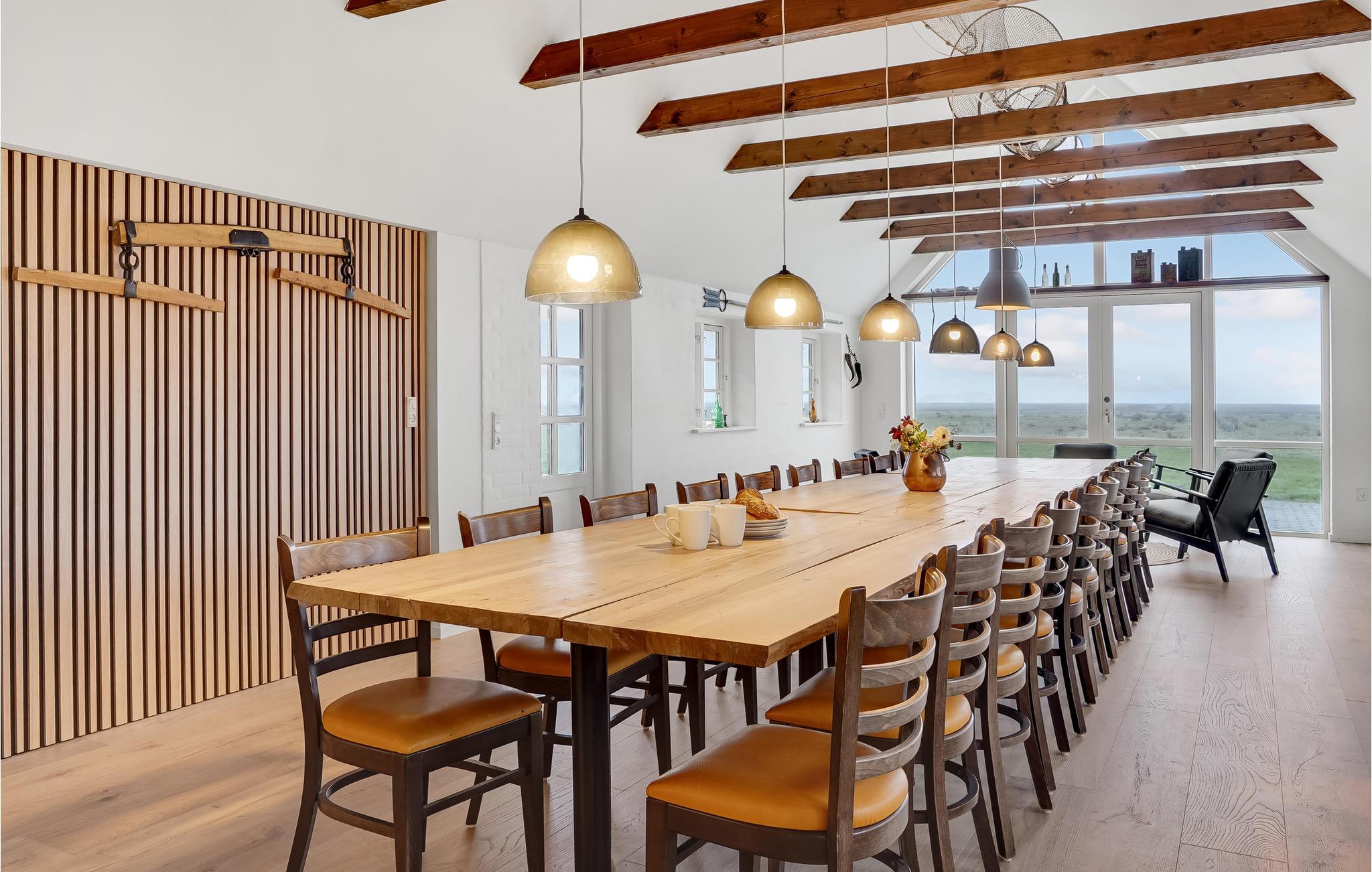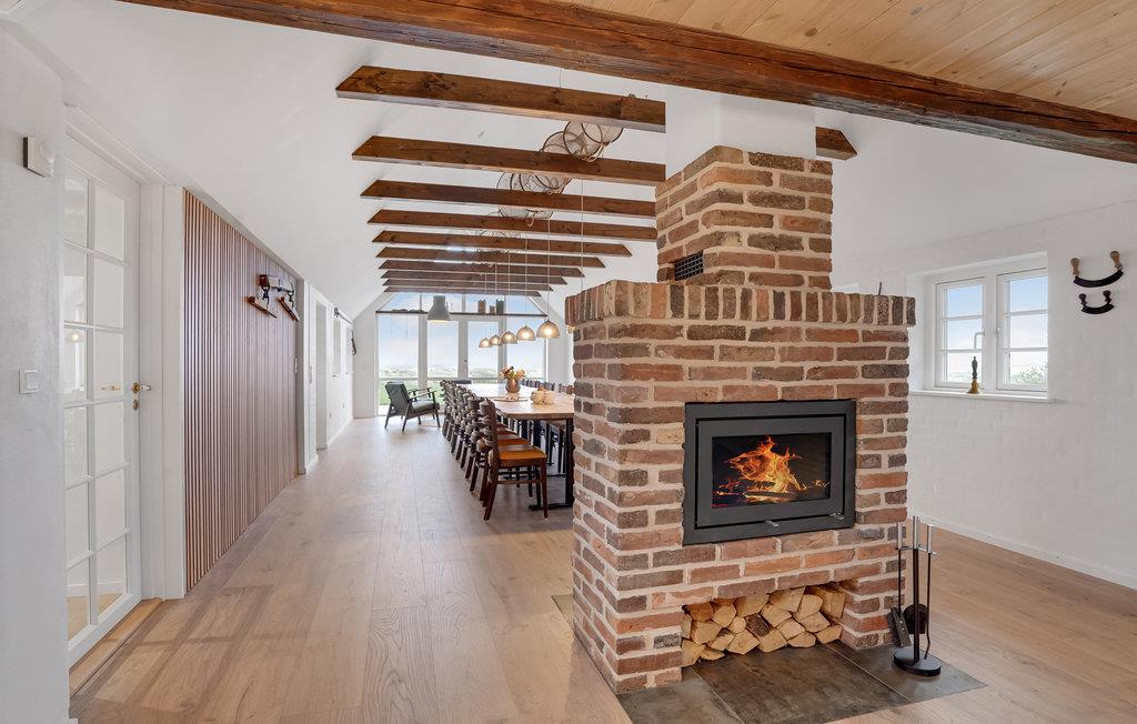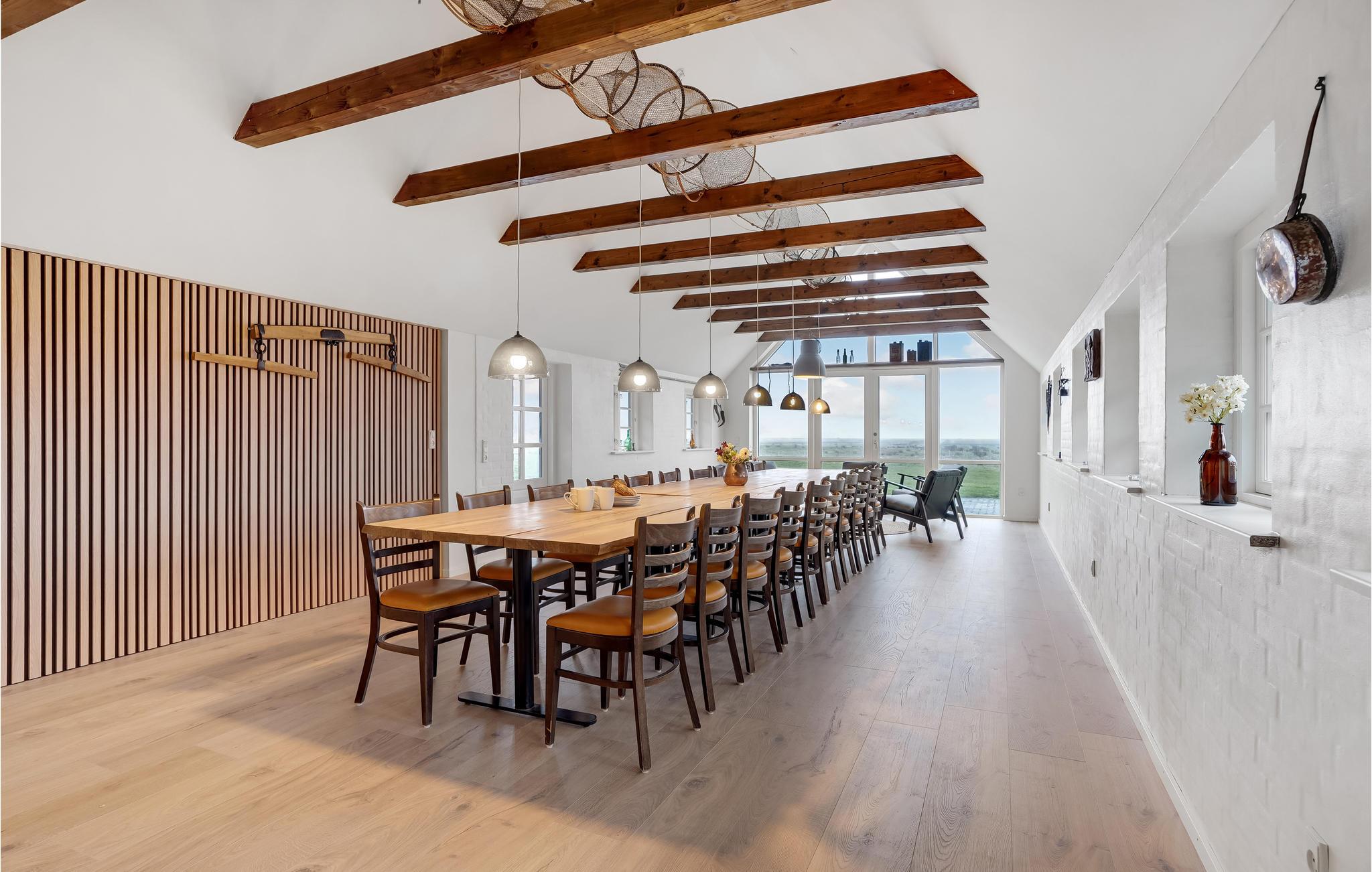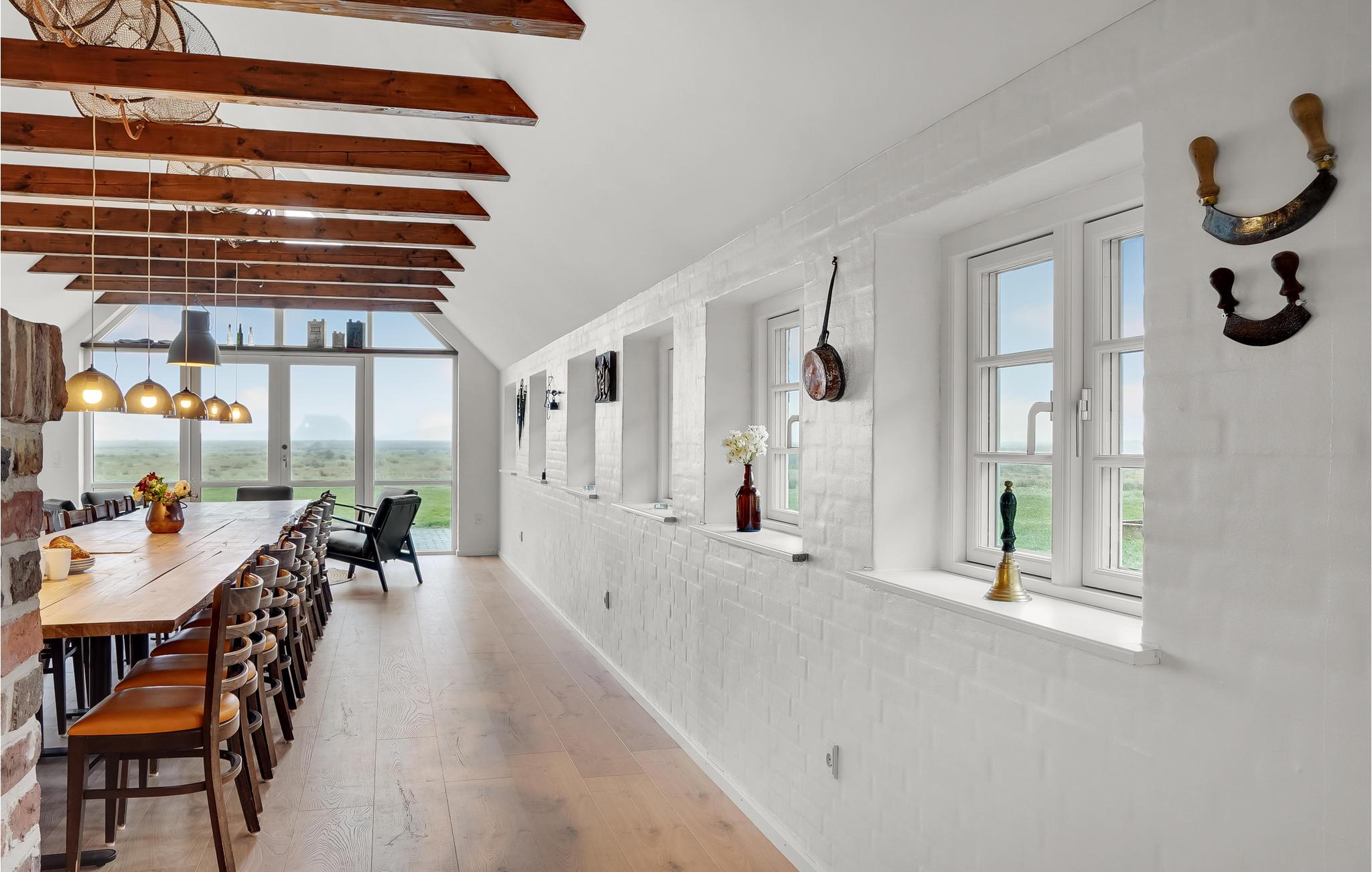 Tæt på Ringkøbing Fjord ligger denne renoverede landejendom. Huset er delt op i et hovedhus samt 2 seperate soveafdelinger (alle 3 sammenhængende men ikke med adgang indefra. Adgang via terrassen til soveafdelingerne). I hovedhuset finder I aktivitetsrummet med bl.a. billardbord og tv-hjørne med behagelige sofaer. Fra aktivitetsrummet er der adgang til det ene soveværelse. I gangen er der vaskemaskine og tørretumbler. Køkkenet og spise/opholdsstuen, ligger ligeledes i hovedhuset, med et stort langbord med plads til alle husets gæster. Loftet er åbnet op til kip, så I får et fantastisk lyst og åbent rum, for enden er der store vinduespartier som både giver lys til rummet samt en skøn udsigt over de åbne marker og helt ned til Ringkøbing Fjord - I kan opleve nogle fantastiske solopgange her. Endvidere findes et hyggehjørne med lænestole samt en sofa i forlængelse af spiseområdet. I køkkenet er der 2 ovne, stort køleskab og fryser, så der er plads og mulighed for at lave mad til mange mennesker. I hovedhuset er der ydeligere 2 soveværelser samt et stort badeværelse. Fra spiseområdet er der udgang til terrassen, hvoraf der er adgang til de 2 separate soveafdelinger.