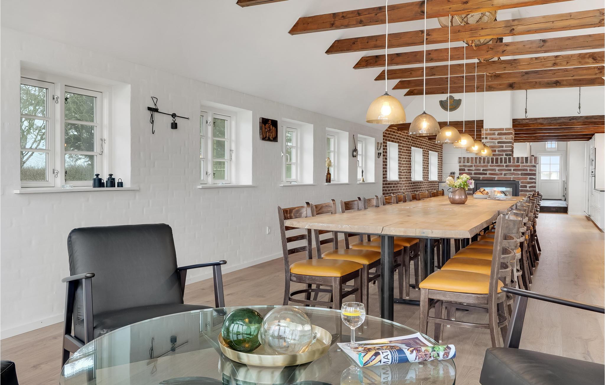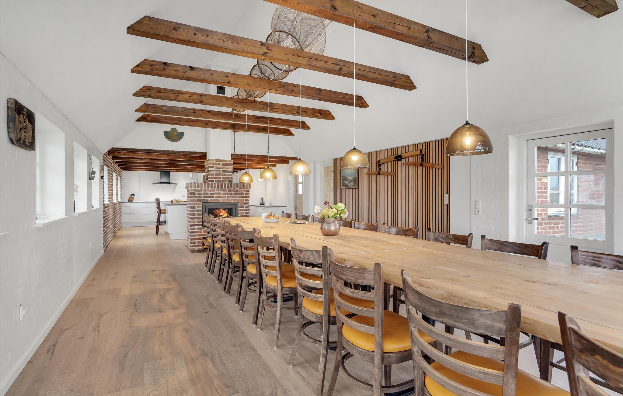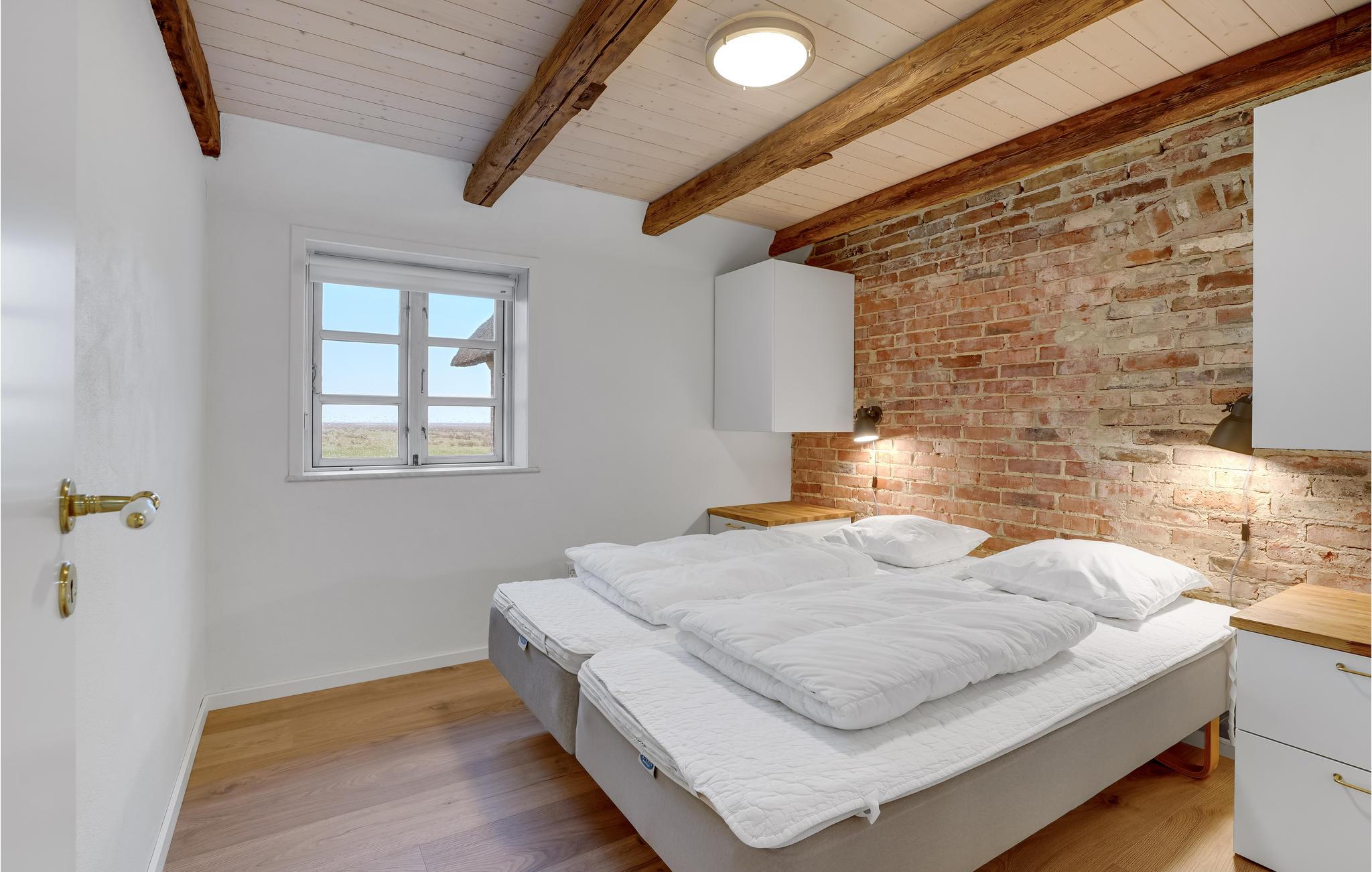 Tæt på Ringkøbing Fjord ligger denne renoverede landejendom. Huset er delt op i et hovedhus samt 2 seperate soveafdelinger (alle 3 sammenhængende men ikke med adgang indefra. Adgang via terrassen til soveafdelingerne). I hovedhuset finder I aktivitetsrummet med bl.a. billardbord og tv-hjørne med behagelige sofaer. Fra aktivitetsrummet er der adgang til det ene soveværelse. I gangen er der vaskemaskine og tørretumbler. Køkkenet og spise/opholdsstuen, ligger ligeledes i hovedhuset, med et stort langbord med plads til alle husets gæster. Loftet er åbnet op til kip, så I får et fantastisk lyst og åbent rum, for enden er der store vinduespartier som både giver lys til rummet samt en skøn udsigt over de åbne marker og helt ned til Ringkøbing Fjord - I kan opleve nogle fantastiske solopgange her. Endvidere findes et hyggehjørne med lænestole samt en sofa i forlængelse af spiseområdet. I køkkenet er der 2 ovne, stort køleskab og fryser, så der er plads og mulighed for at lave mad til mange mennesker. I hovedhuset er der ydeligere 2 soveværelser samt et stort badeværelse. Fra spiseområdet er der udgang til terrassen, hvoraf der er adgang til de 2 separate soveafdelinger.