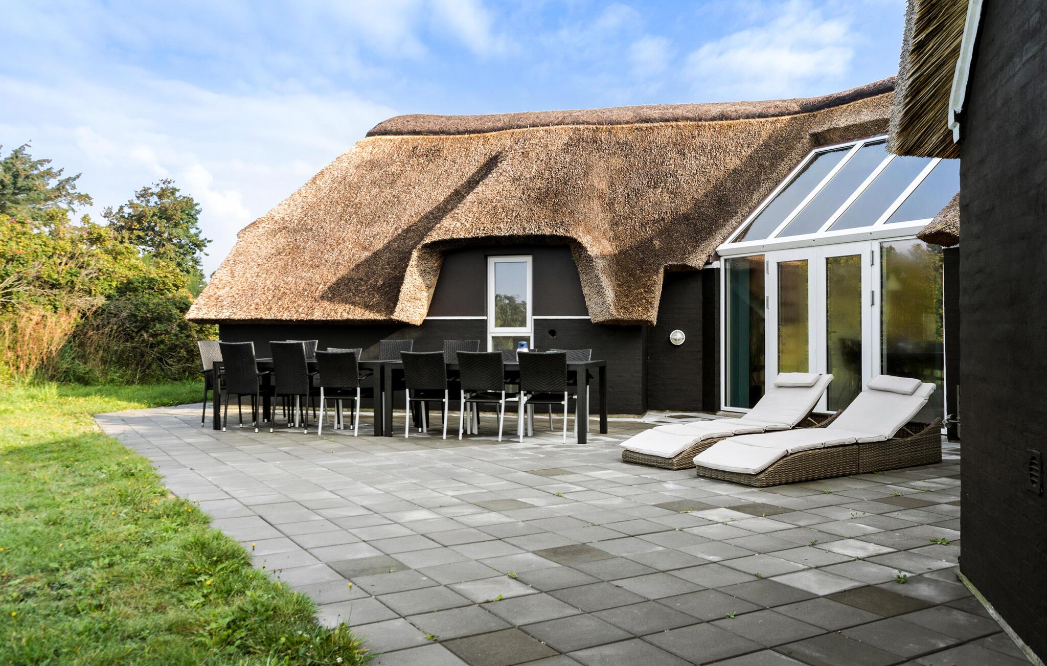 Skønt feriehus med stråtag, pool, sauna og plads til hele familien i rolige Klegod.