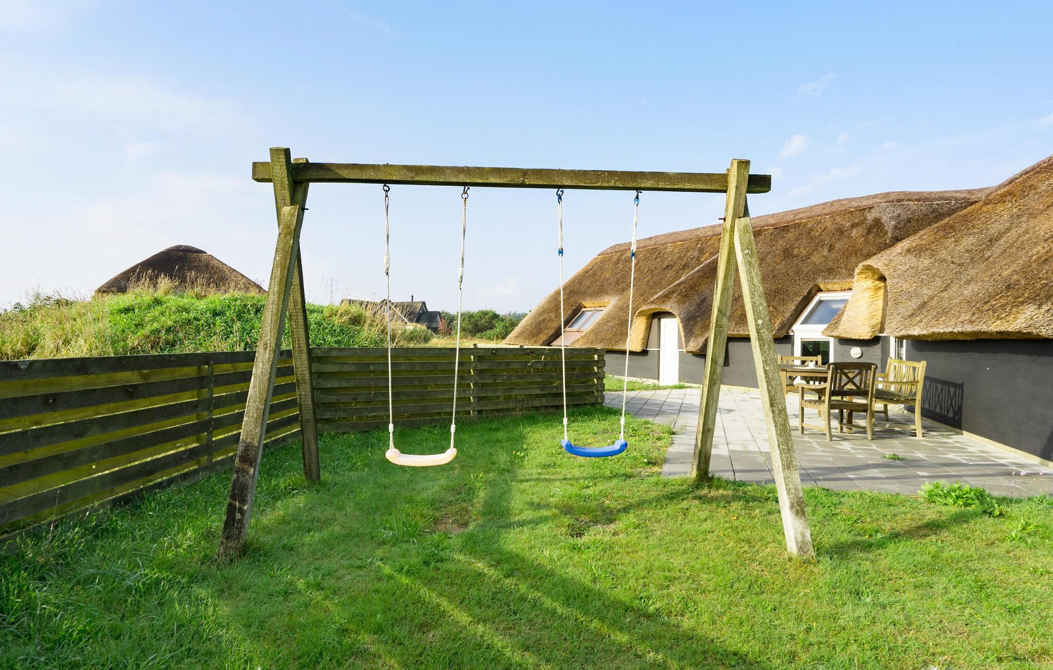 Der er lagt op til nogle herlige feriedage i dette rummelige hus, hvor der er plads til en stor vennegruppe eller flere familier. Når alle er kommet ud fra deres soveværelser, kan dagen begynde med morgenmad i det store opholdsrum. Find sammen om spisebordet eller ryk ud på terrassen, hvis vejret er til det. Senere kan I benytte jer af husets store udvalg af wellnessfaciliteter og lade børnene lege i poolen, mens de voksne måske har lyst til en tur i spa eller sauna. Om aftenen kan I gøre klar til grill på terrassen, mens børnene boltrer sig i haven, hvor der er gynger og sandkasse.