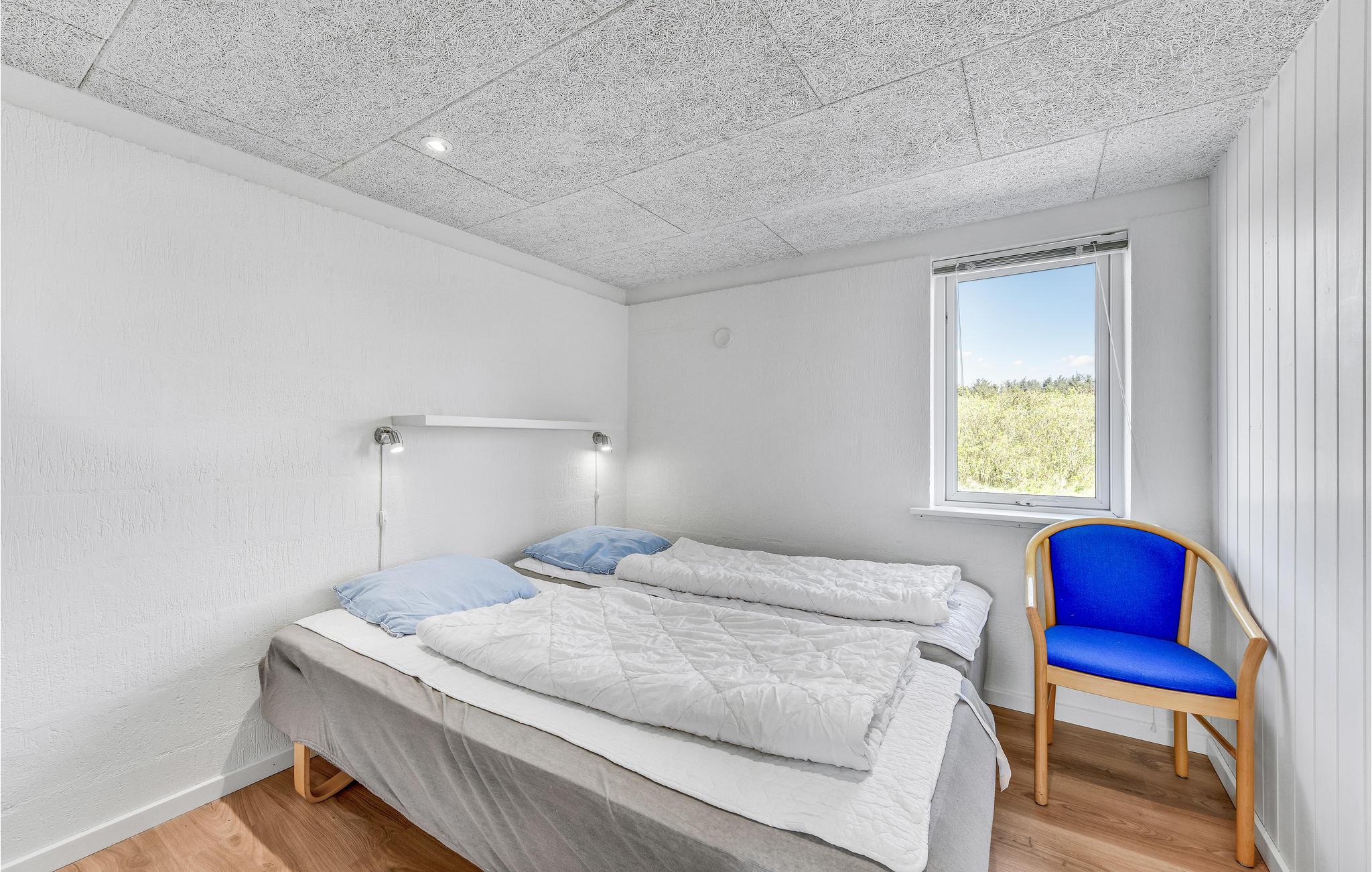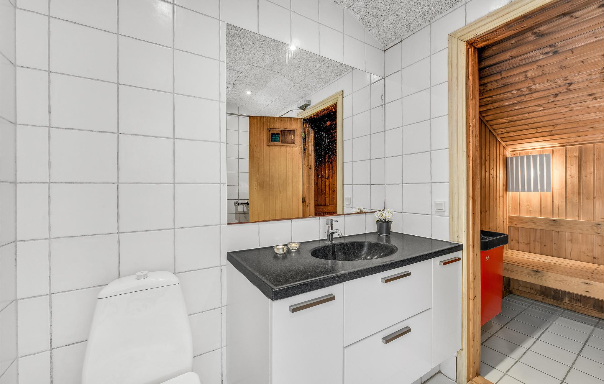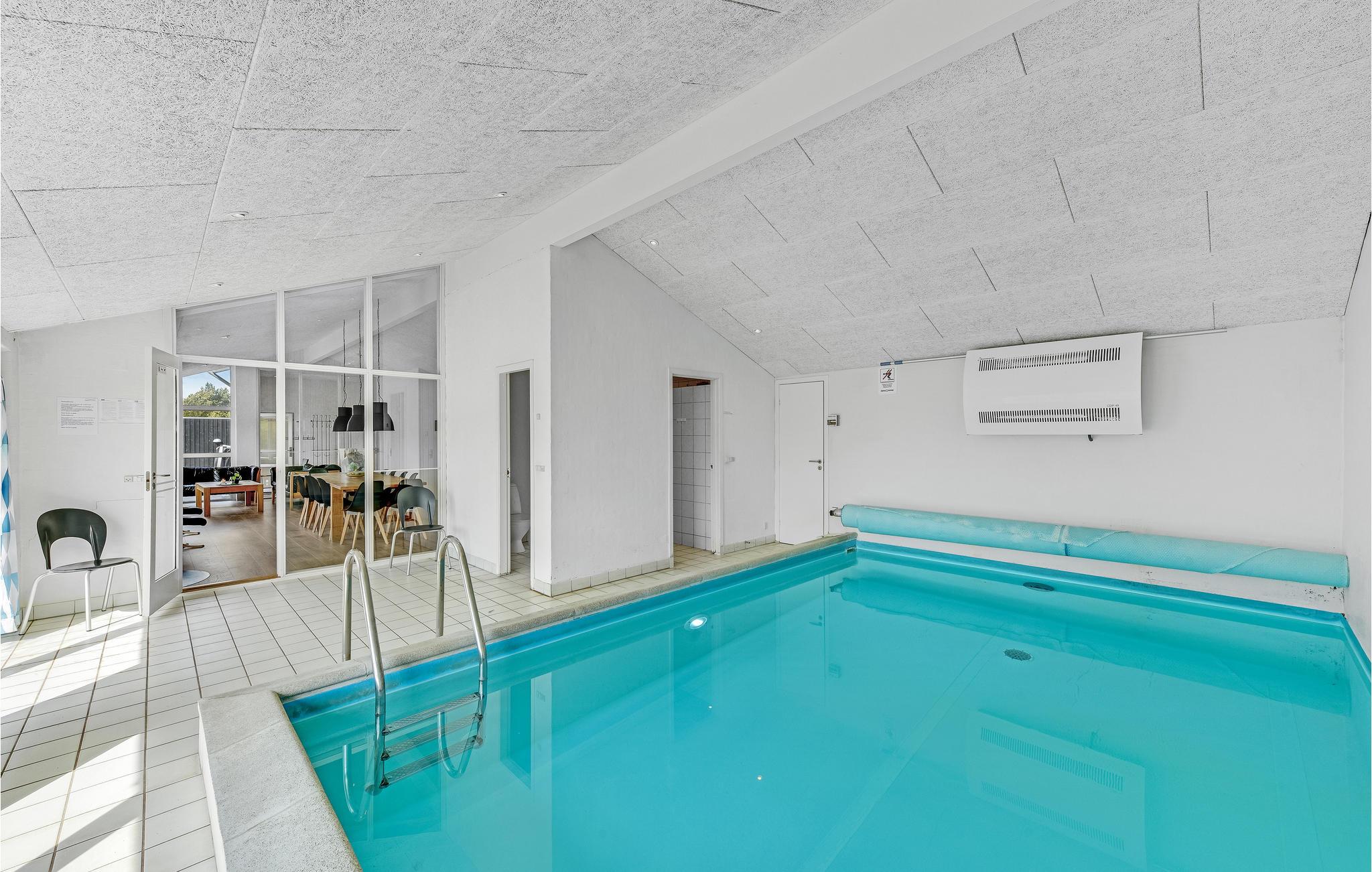 Dette sommerhus med swimmingpool og sauna danner gode rammer for årets familieferie eller en aktiv ferie med vennerne. Huset har 7 soveværelser alle med 2 sovepladser, så her er plads til i alt 14 gæster. Alle soveværelser ligger i den ene ende af huset sammen med et badeværelse med bruser. Stuen og køkkenet ligger i åben forbindelse, og fra stuen er der adgang til swimmingpoolafdelingen, hvor der findes ydeligere et badeværelse med bruser samt et gæstetoilet. Fra badeværelset er der adgang til saunaen.