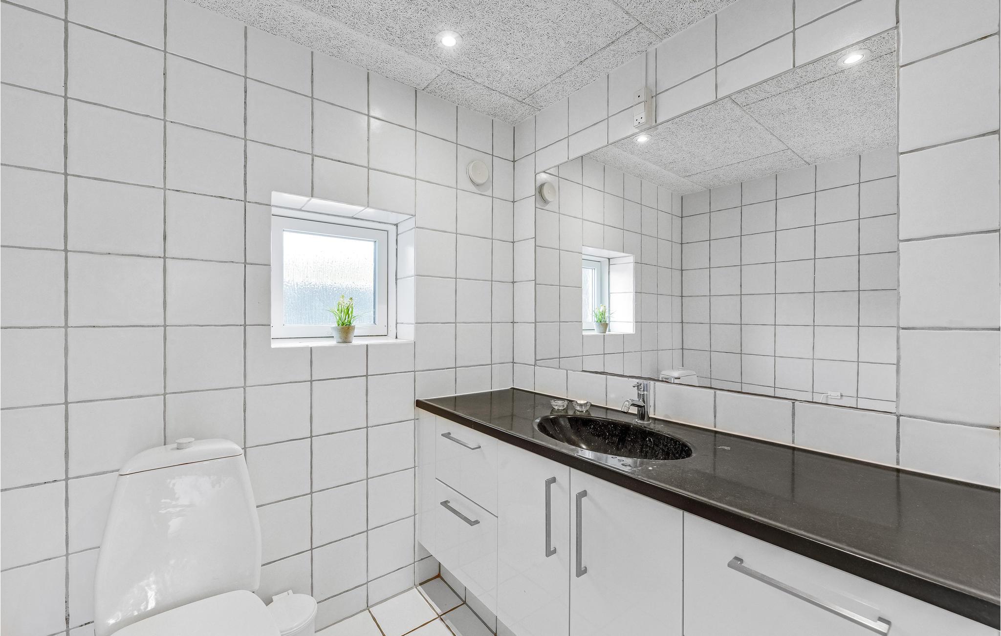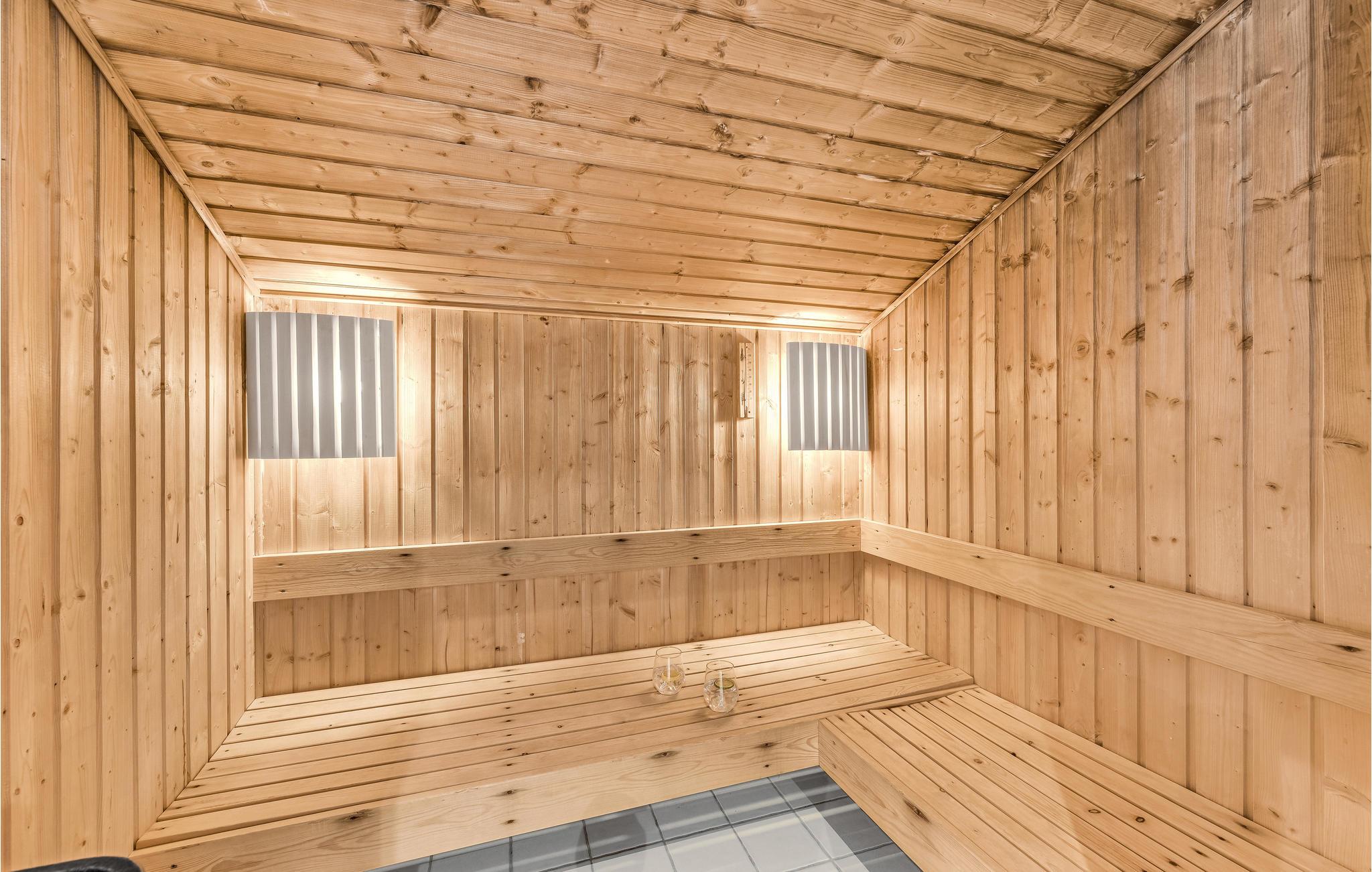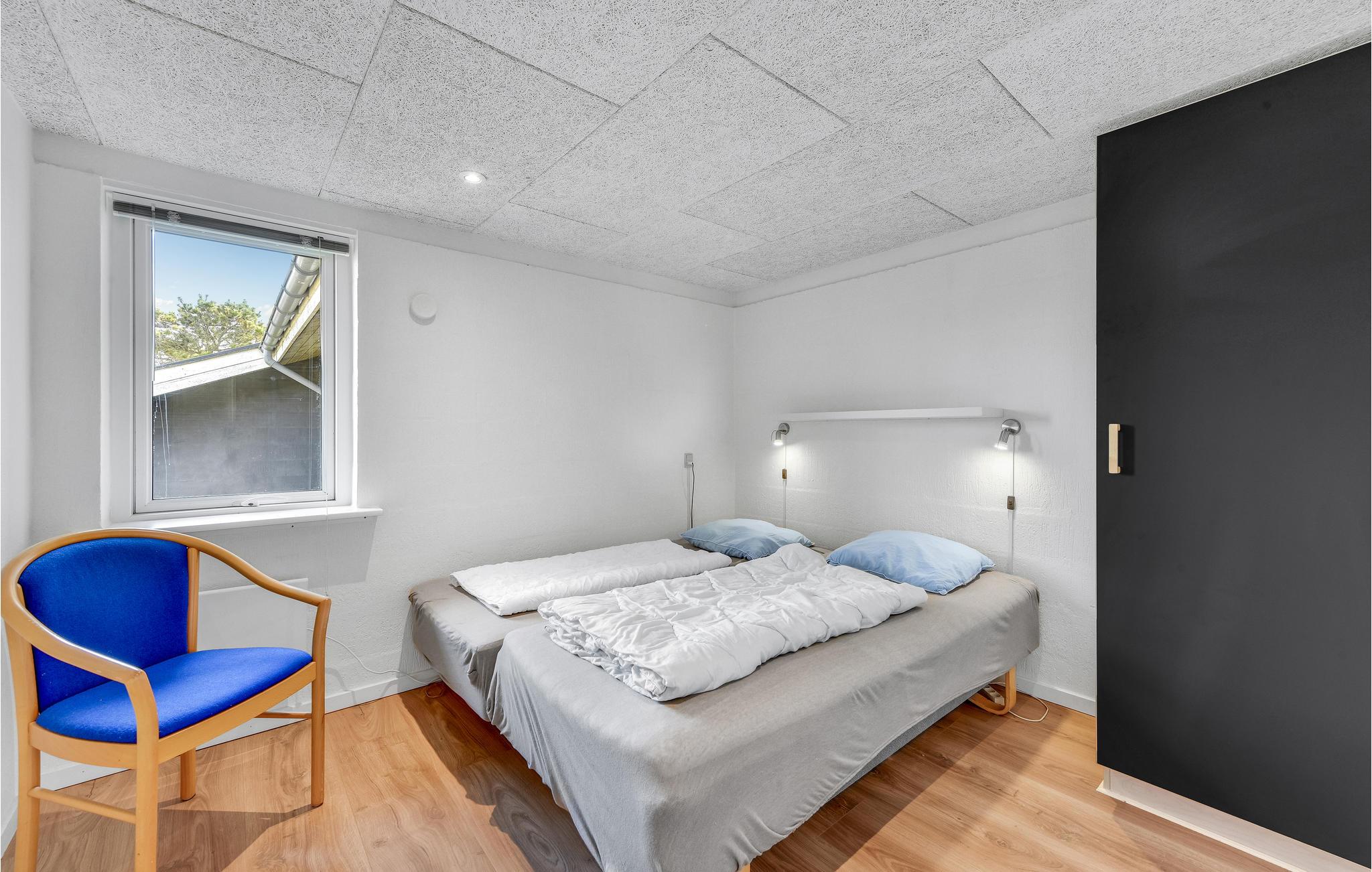 Dette sommerhus med swimmingpool og sauna danner gode rammer for årets familieferie eller en aktiv ferie med vennerne. Huset har 7 soveværelser alle med 2 sovepladser, så her er plads til i alt 14 gæster. Alle soveværelser ligger i den ene ende af huset sammen med et badeværelse med bruser. Stuen og køkkenet ligger i åben forbindelse, og fra stuen er der adgang til swimmingpoolafdelingen, hvor der findes ydeligere et badeværelse med bruser samt et gæstetoilet. Fra badeværelset er der adgang til saunaen.