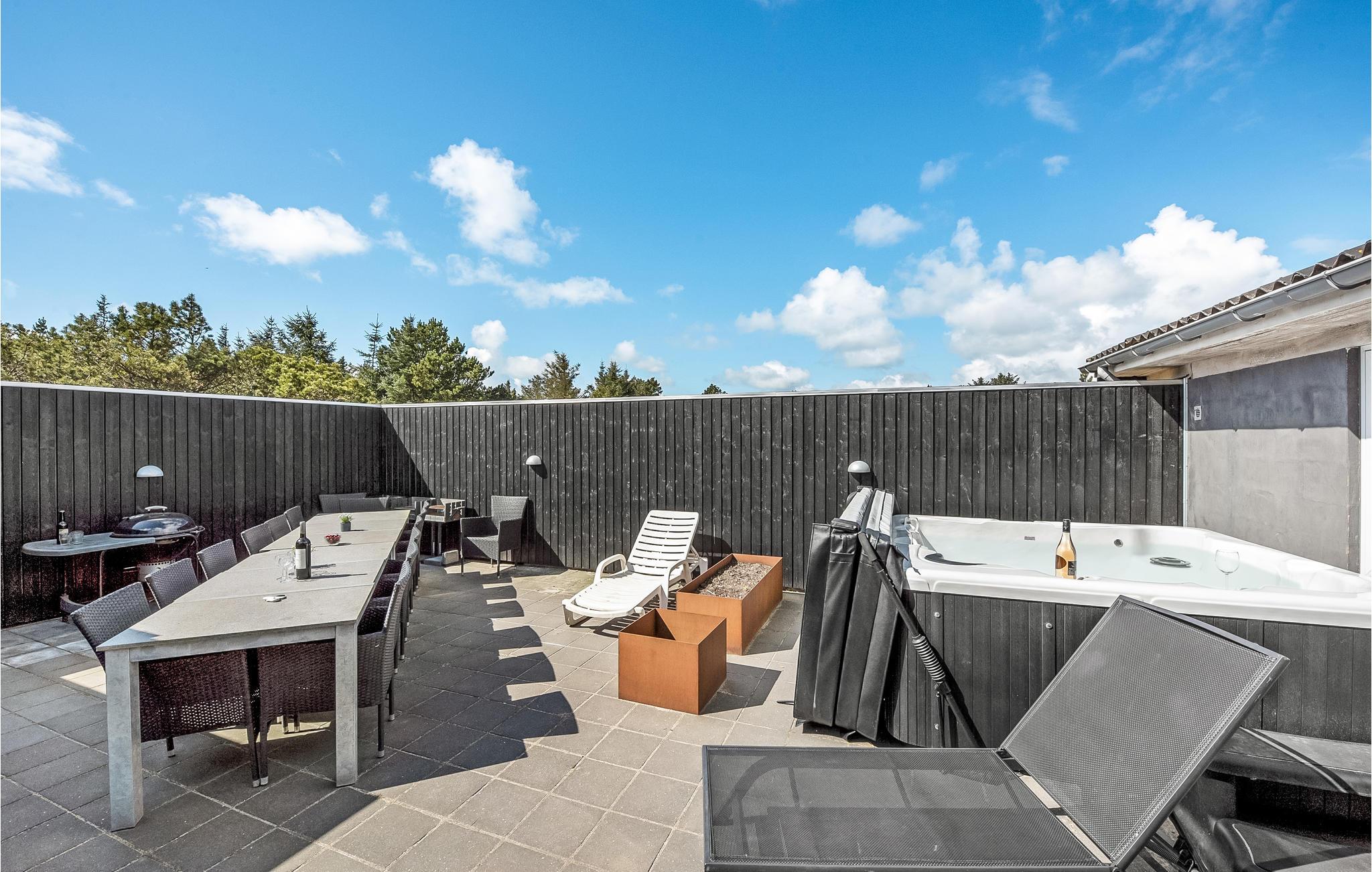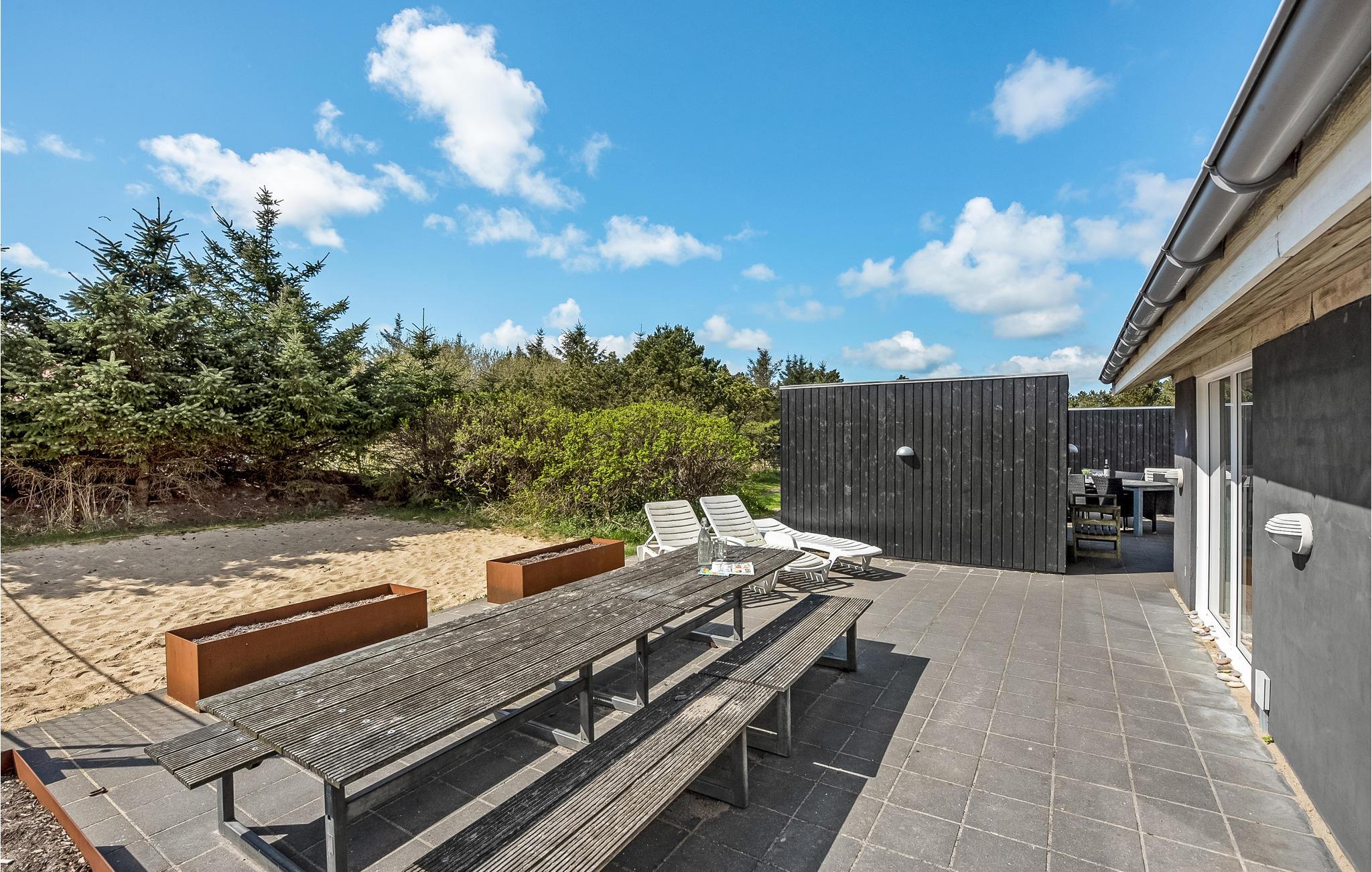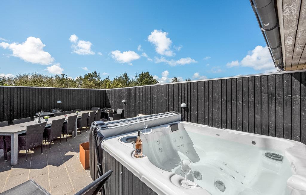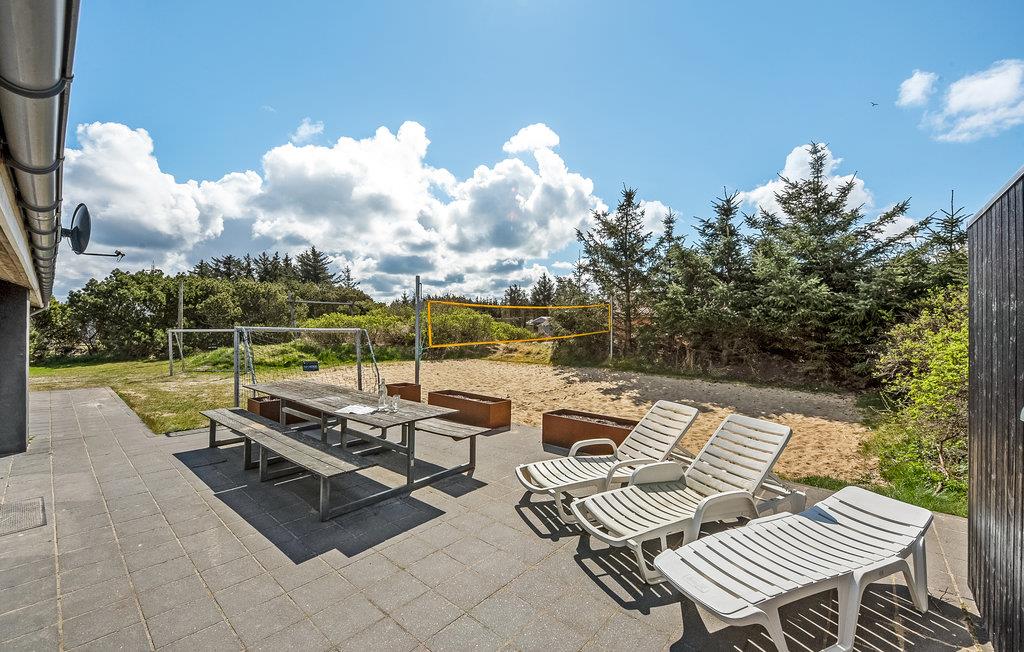 På den store terrasse er der gode læmuligheder, og husets beachvolleybane ligger lige ved siden af. Her er også udendørs standvandsspa til 6 personer.