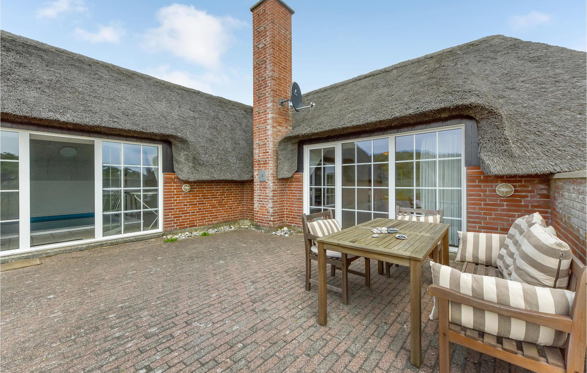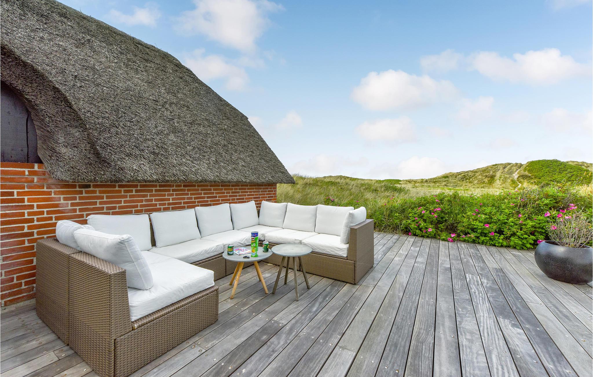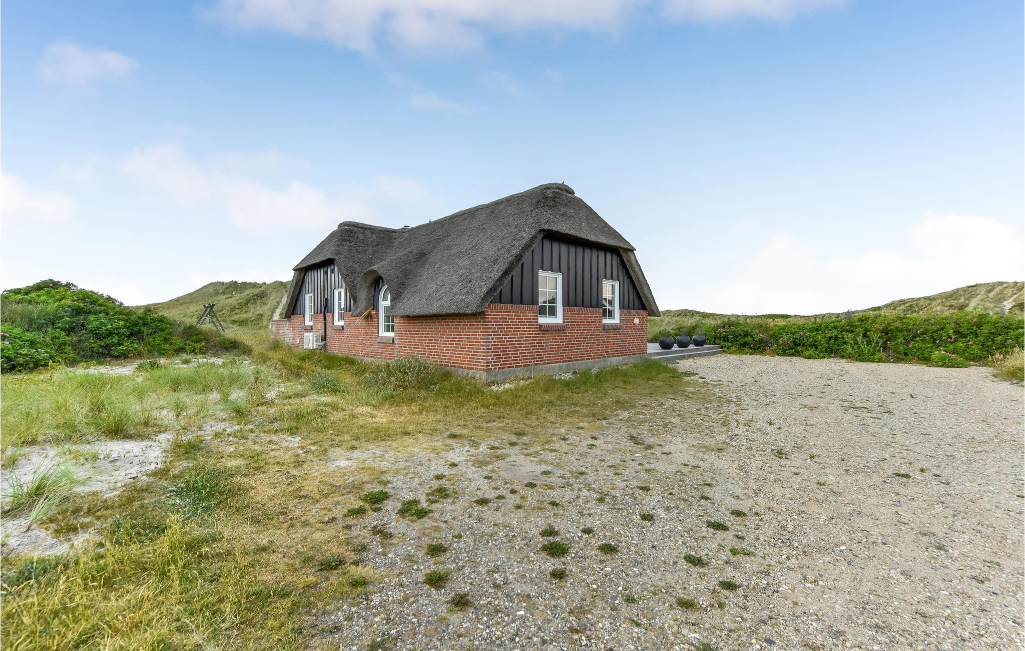 Dette hyggelige, stråtækte sommerhus er beliggende i første klitrække, op til et stort fredet areal og kun et par minuttets gang gennem klitterne til en af områdets fineste sandstrande. Sommerhuset er til otte personer og indrettet med en kombineret køkken og stue, fire soveværelser, to badeværelser samt den skønne poolafdeling med swimmingpool og sauna. Udendørs kan I nyde terrassen og udsigten til det specielle klitlandskab. På den anden side af klitterne ligger Vesterhavet, hvor stranden indbyder bl.a. til leg, afslapning, en dukkert, drageflyvning og lange gåture, og måske er I endda så heldige at finde rav.