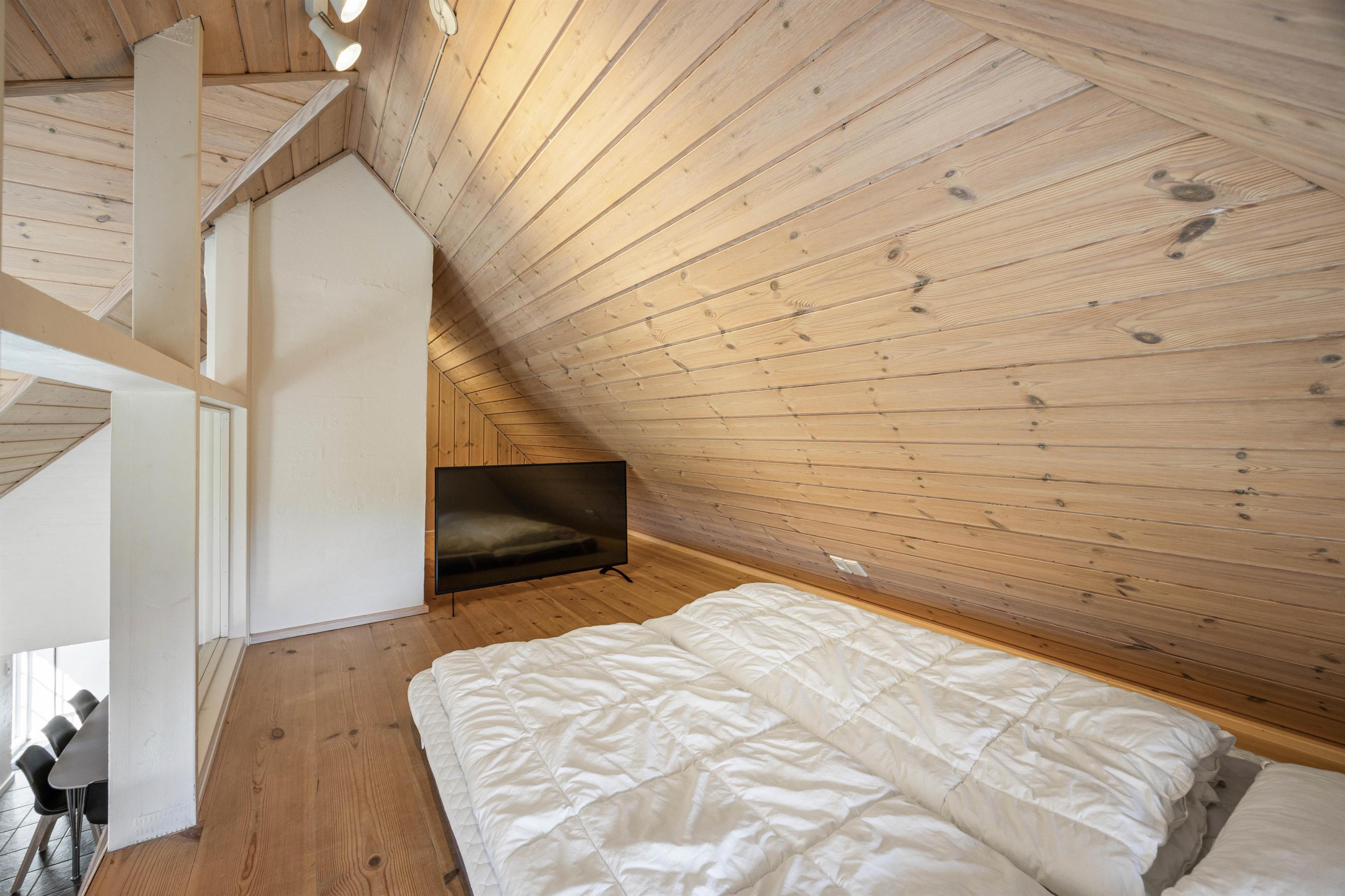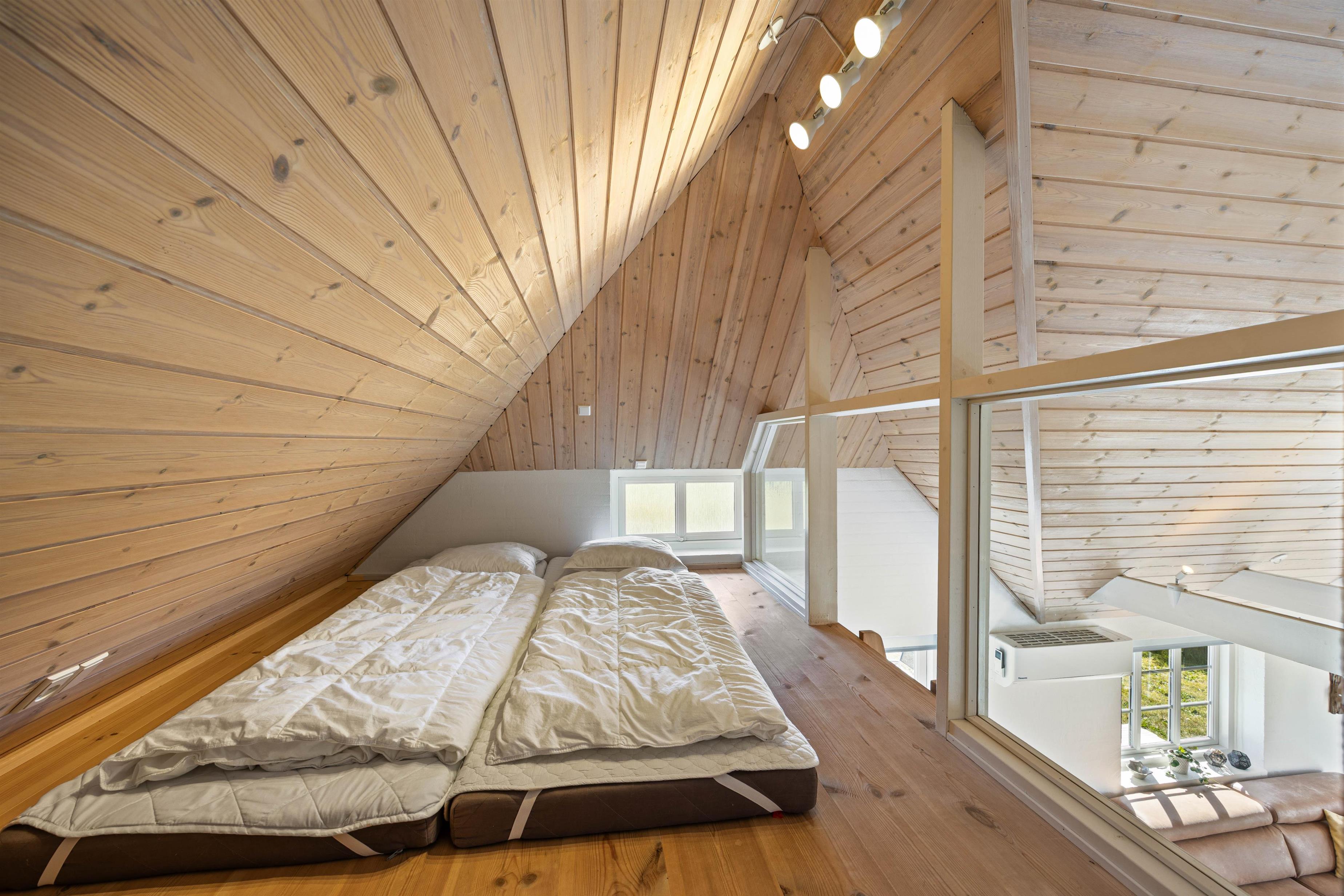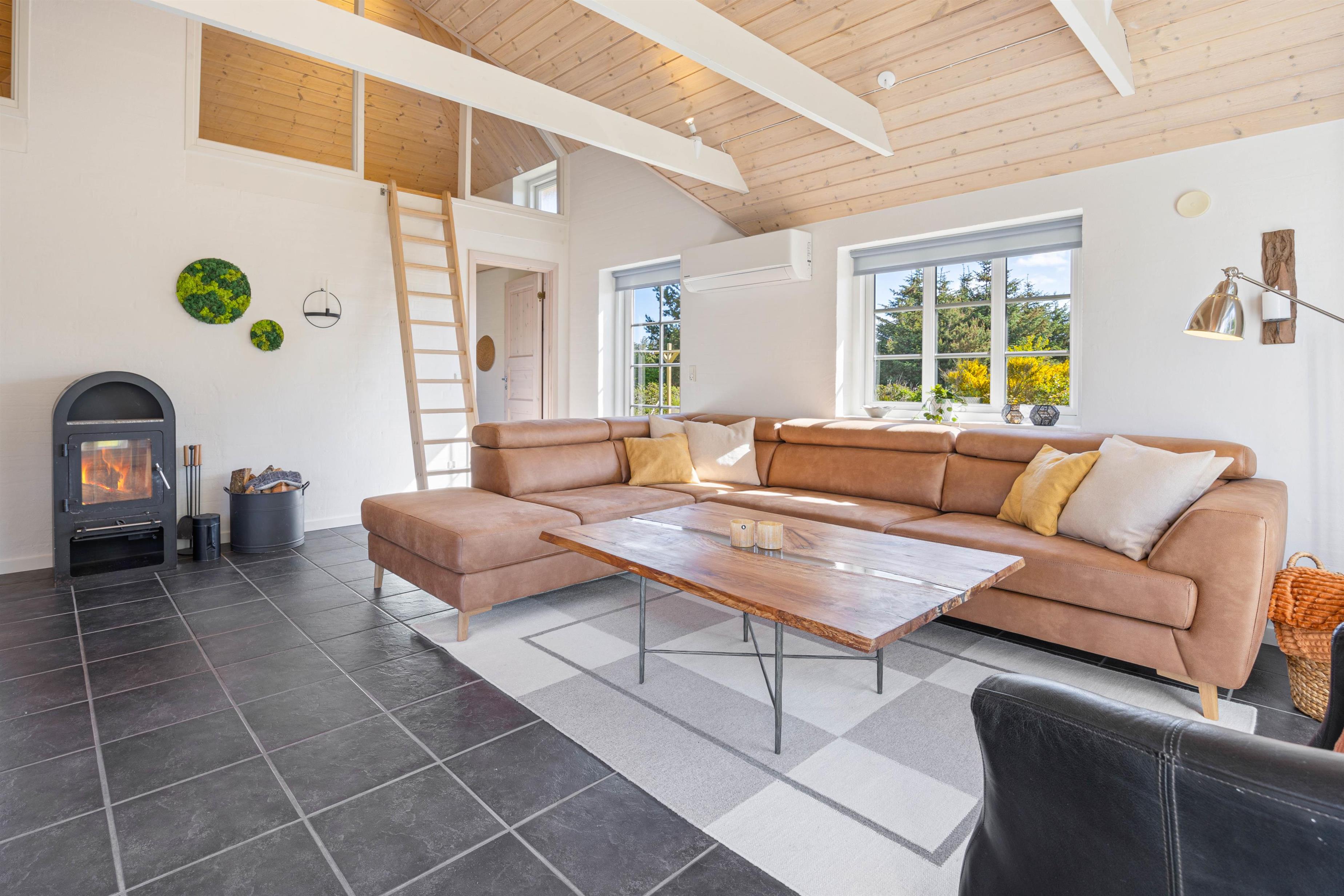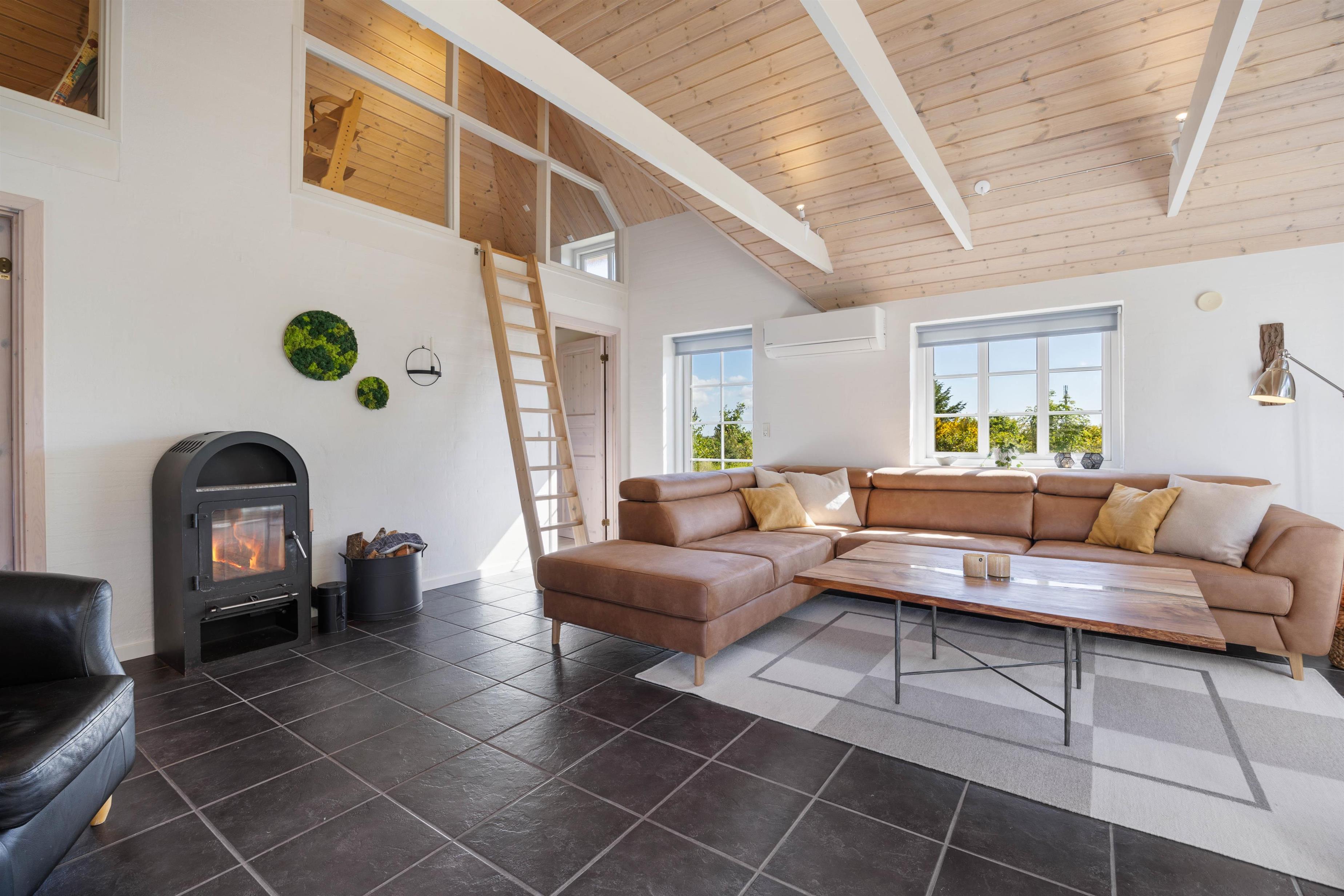 Feriehuset har i alt 3 soveværelser samt en hems med tilhørende soveplads. I hjertet af huset, nemlig stue og køkkenalrum, kan I samles og hygge med brætspil ved spisebordet samt fælles madlavning. Om aftenen kan I samles i sofaen foran fjernsynet, hvor I kan streame film fra husets Chromecast. I kan også tænde op i brændeovnen og nyde hyggen og varmen fra de knitrende flammer. Huset opvarmes også af den energibesparende luft til luft varmepumpe.
