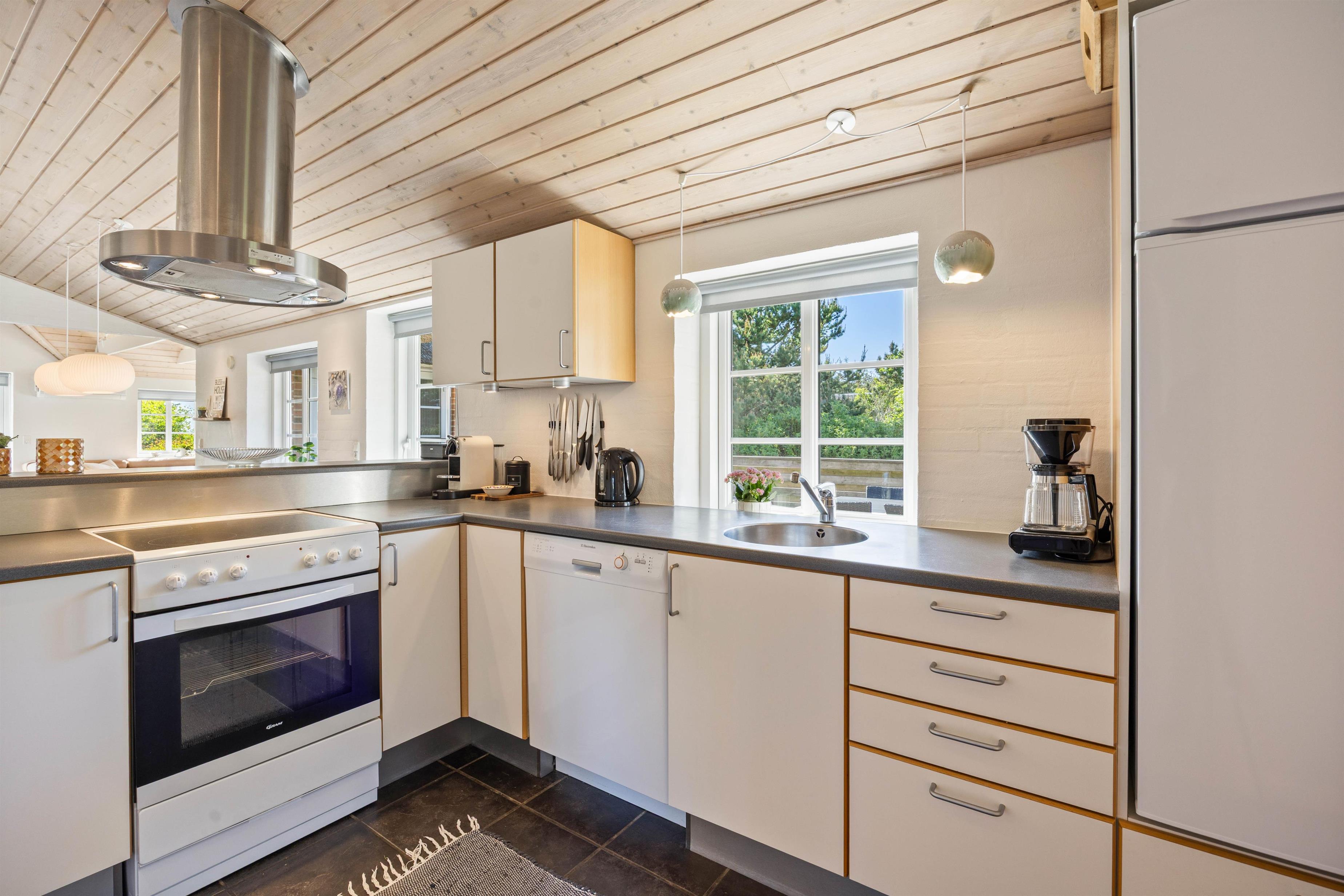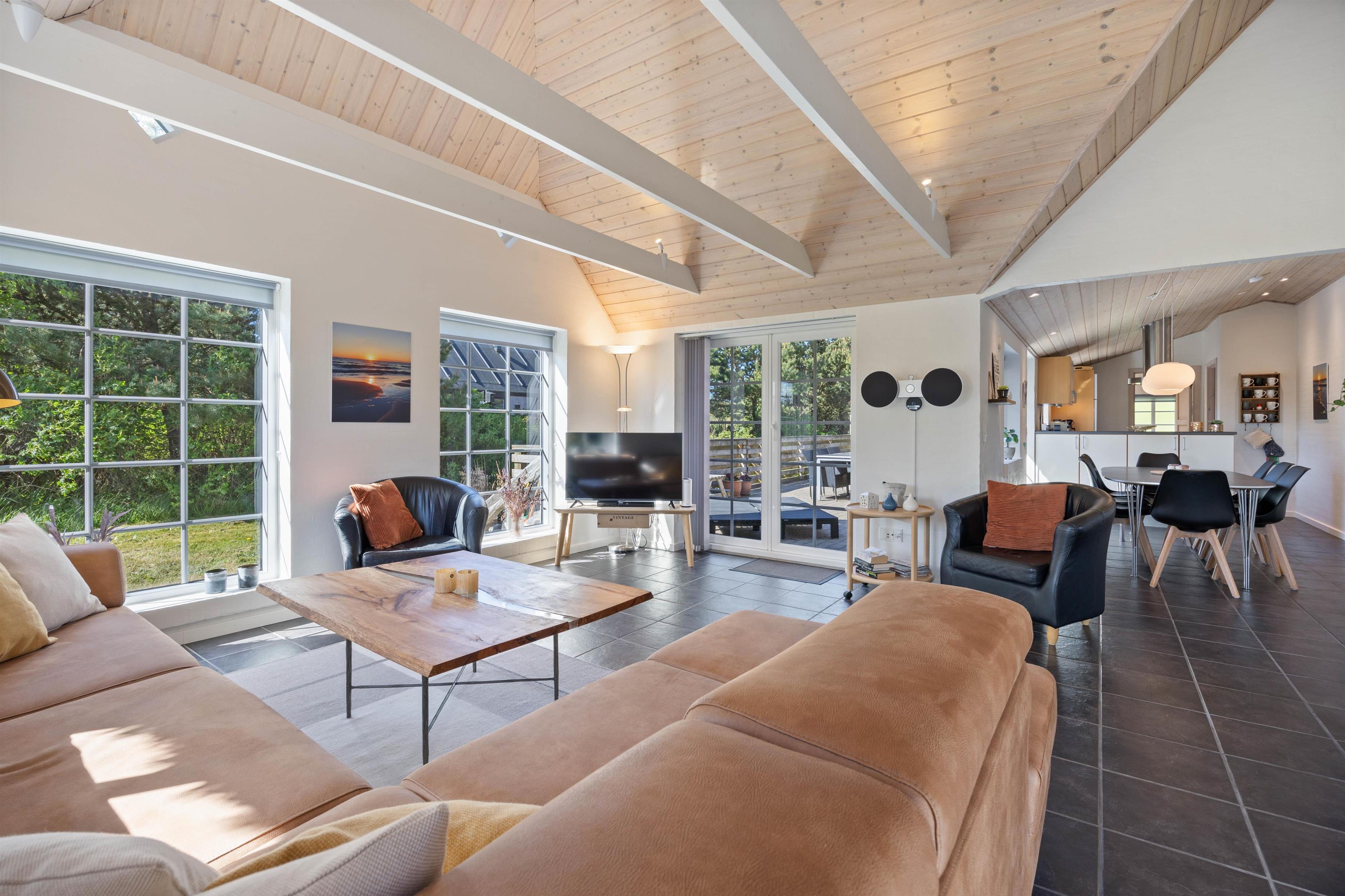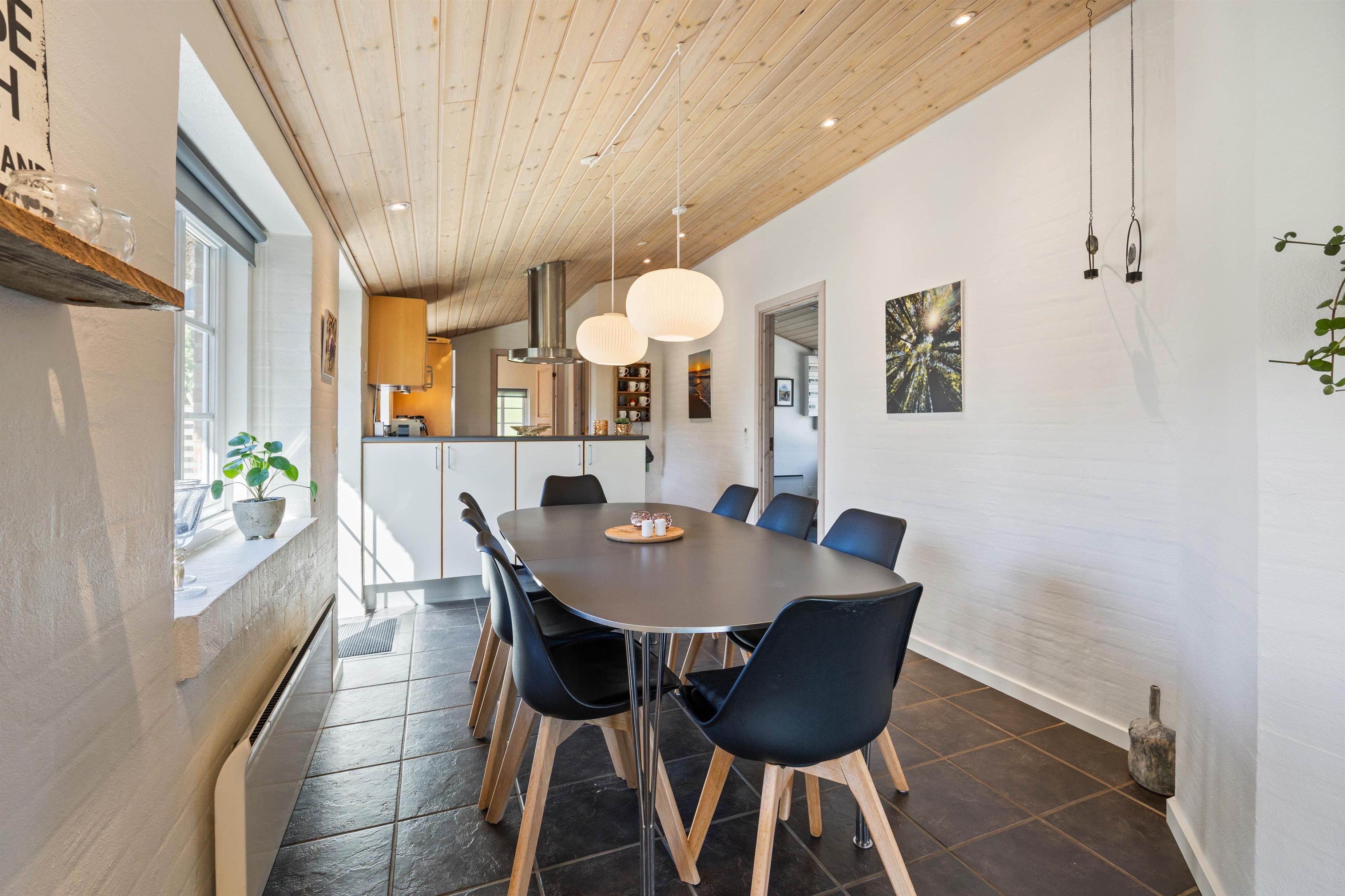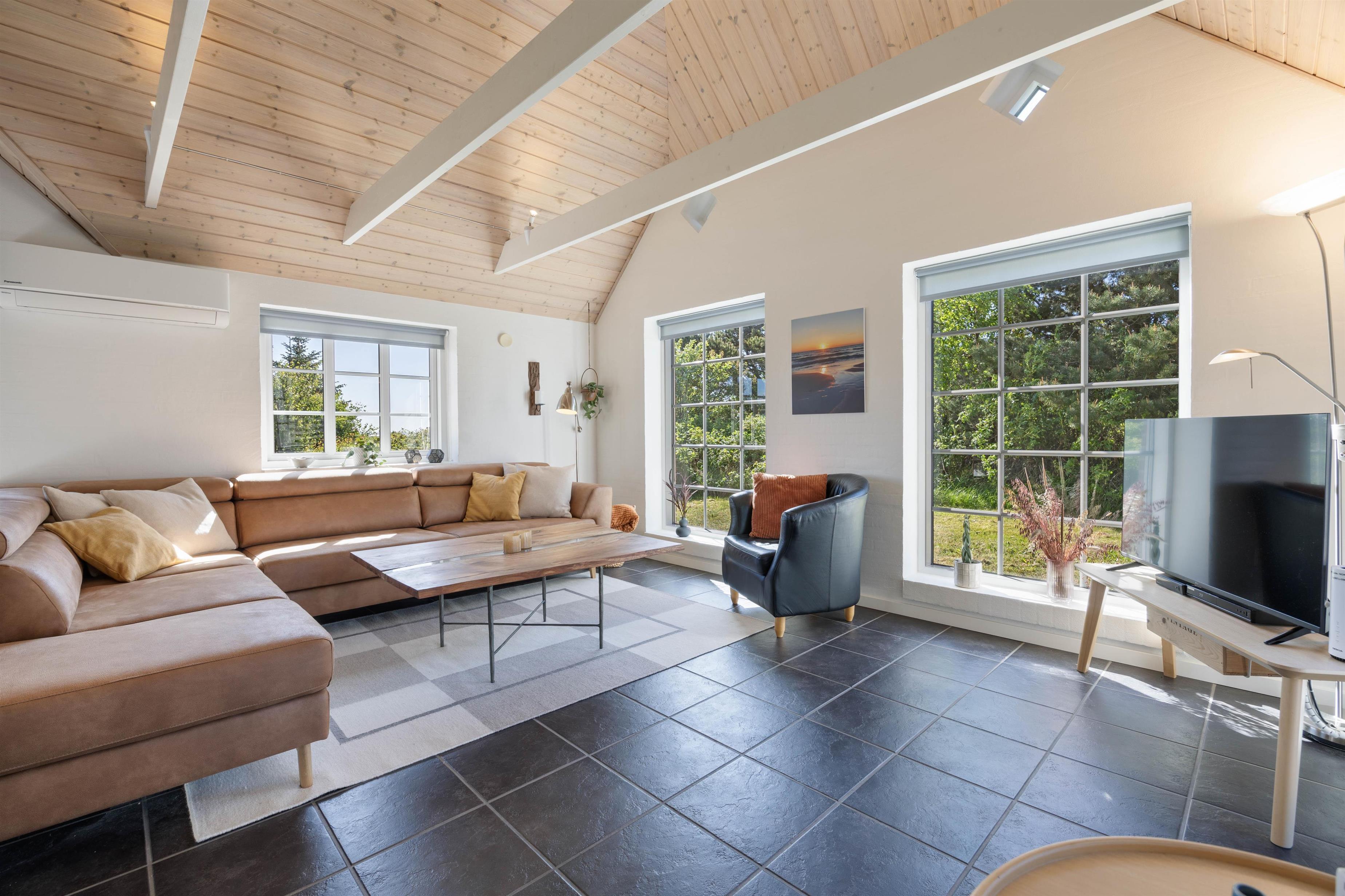 Feriehuset har i alt 3 soveværelser samt en hems med tilhørende soveplads. I hjertet af huset, nemlig stue og køkkenalrum, kan I samles og hygge med brætspil ved spisebordet samt fælles madlavning. Om aftenen kan I samles i sofaen foran fjernsynet, hvor I kan streame film fra husets Chromecast. I kan også tænde op i brændeovnen og nyde hyggen og varmen fra de knitrende flammer. Huset opvarmes også af den energibesparende luft til luft varmepumpe.