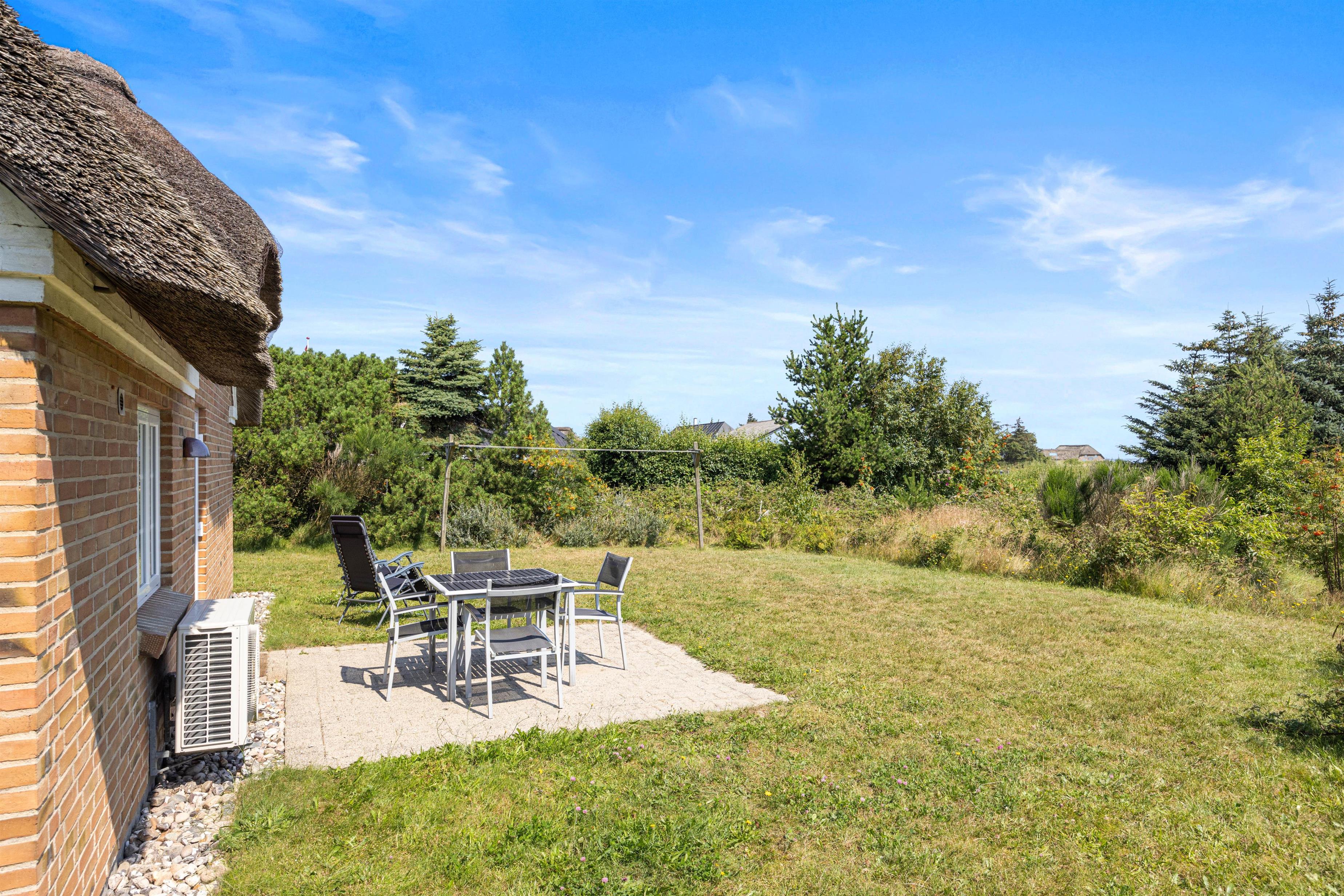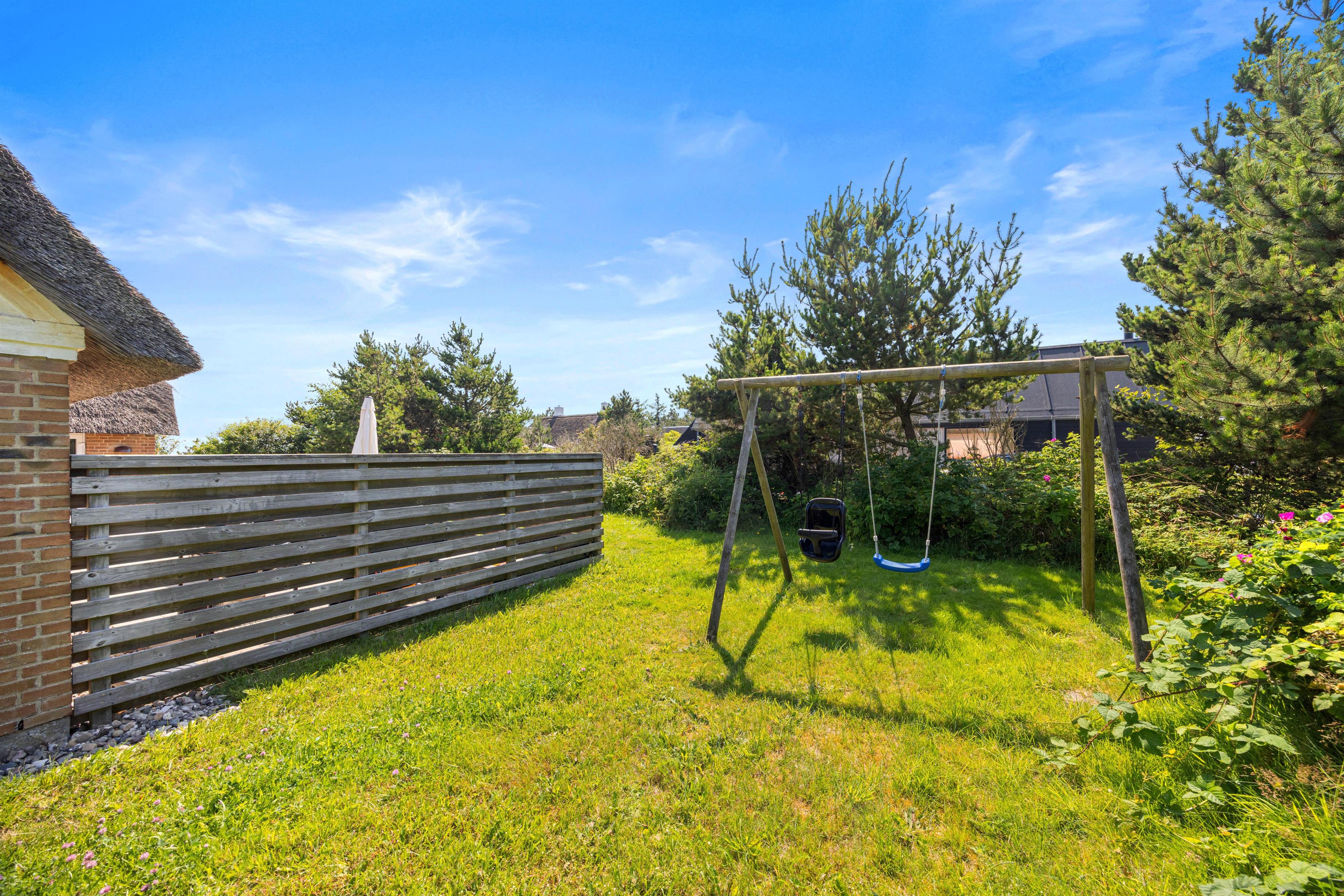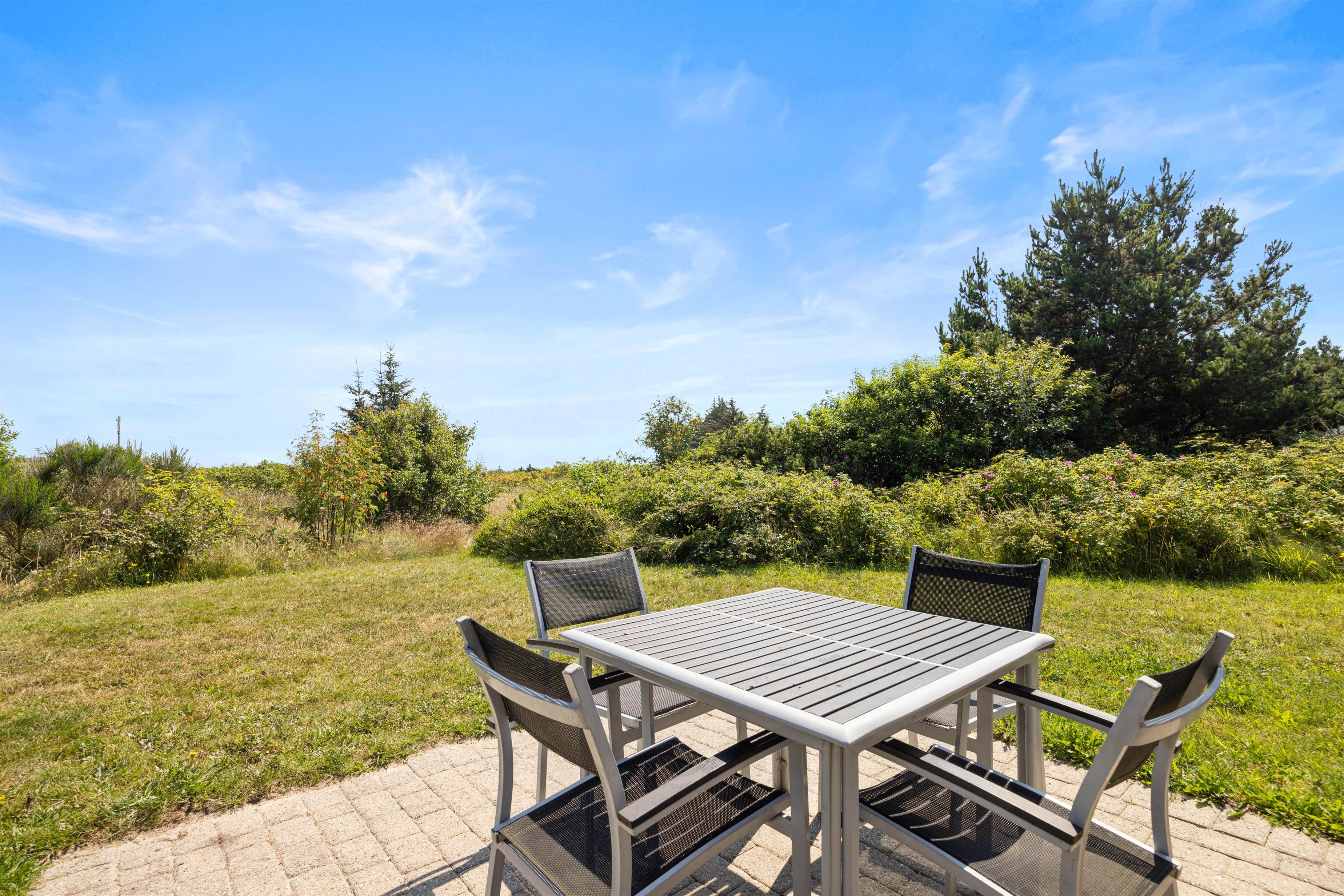 Det hyggelige feriehus er beliggende på en delvis afskærmet naturgrund i Klegod. Den store lukkede terrasse er sydvendt og velegnet til børn. På østsiden af huset er der også en mindre terrasse med udsigt til Ringkøbing Fjord, hvor I om morgenen kan nyde en kop kaffe med udsigt til solopgangen. Ved huset er der blandt andet også en sandkasse og gynge, som er særligt populær hos børnene.