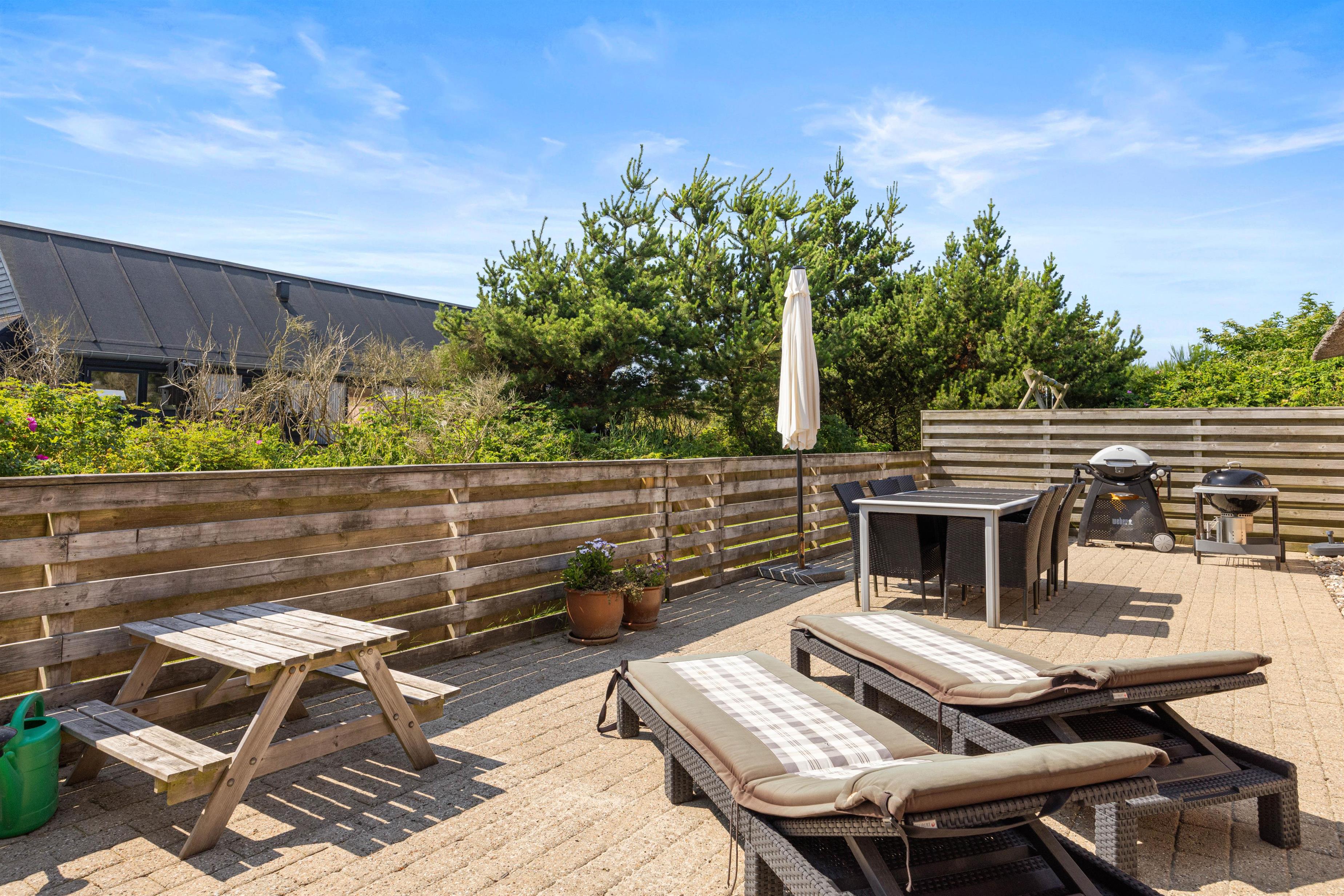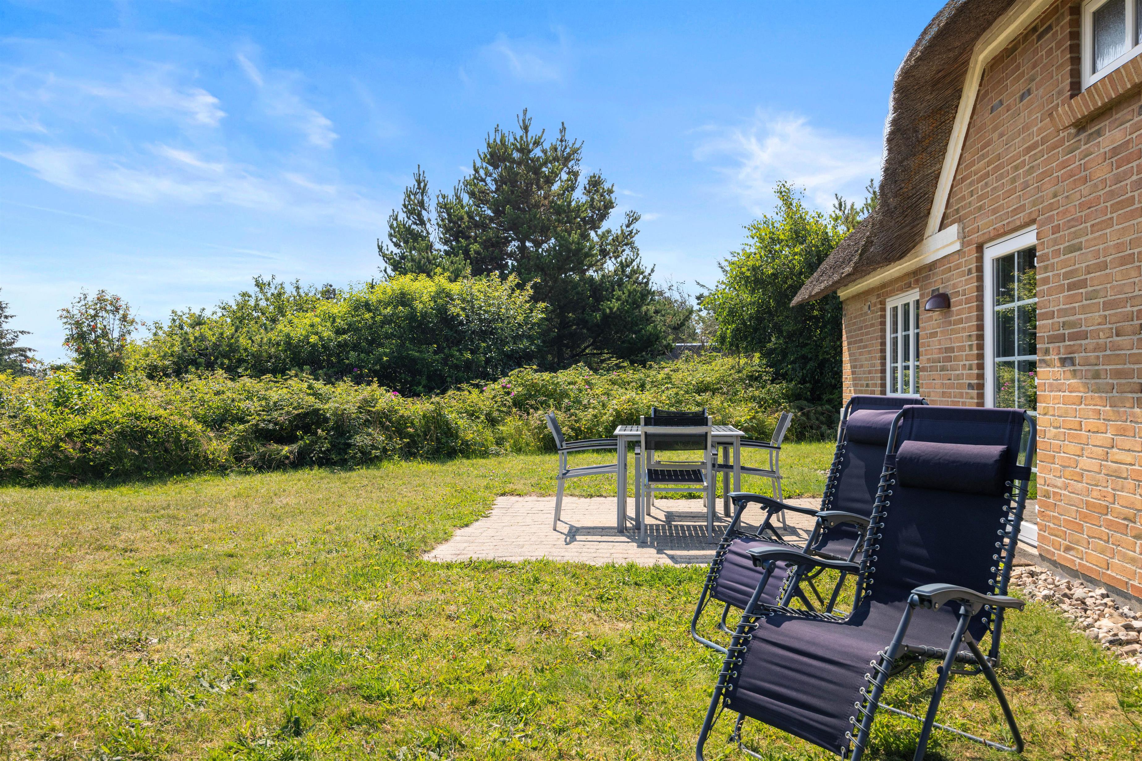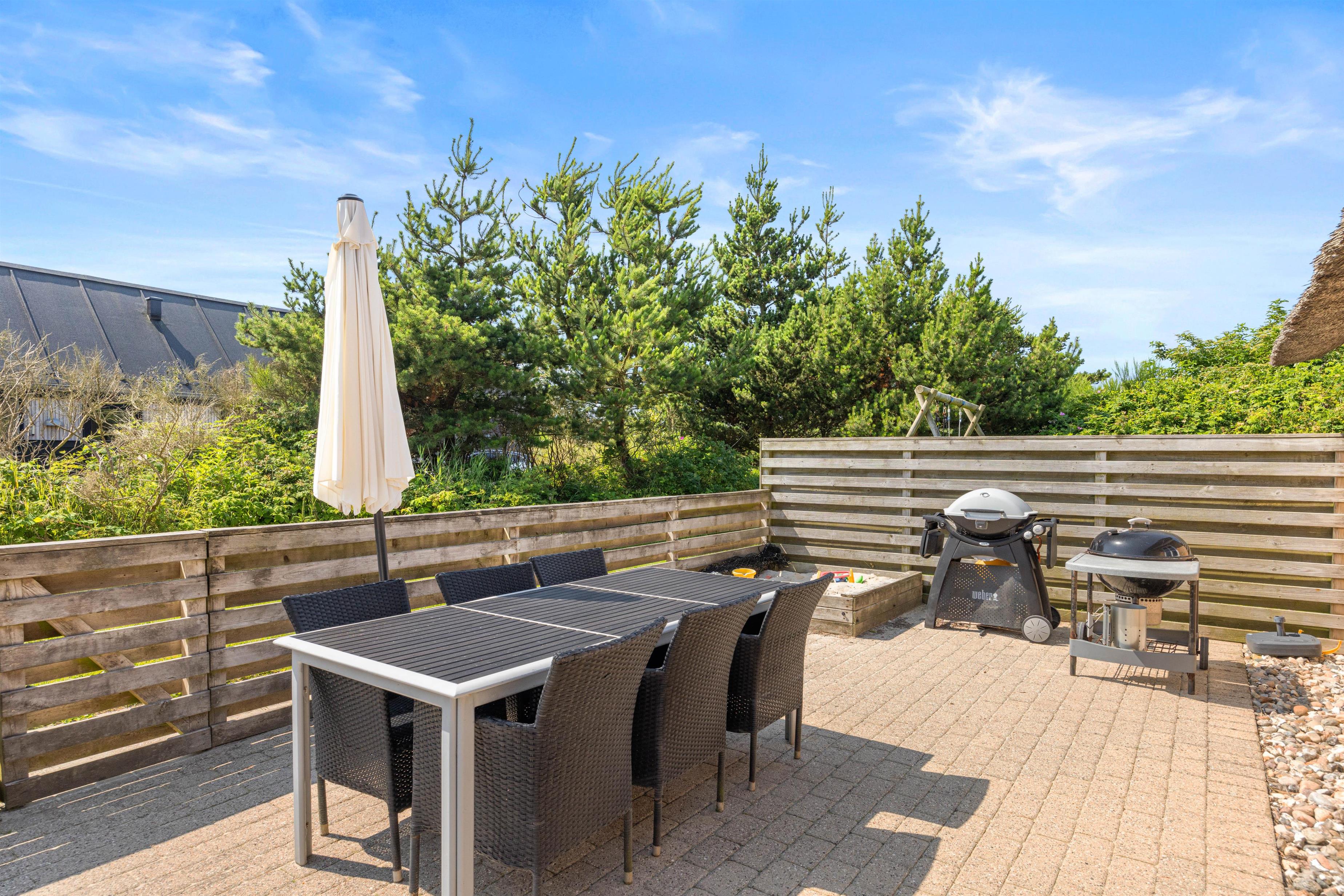 Det hyggelige feriehus er beliggende på en delvis afskærmet naturgrund i Klegod. Den store lukkede terrasse er sydvendt og velegnet til børn. På østsiden af huset er der også en mindre terrasse med udsigt til Ringkøbing Fjord, hvor I om morgenen kan nyde en kop kaffe med udsigt til solopgangen. Ved huset er der blandt andet også en sandkasse og gynge, som er særligt populær hos børnene.