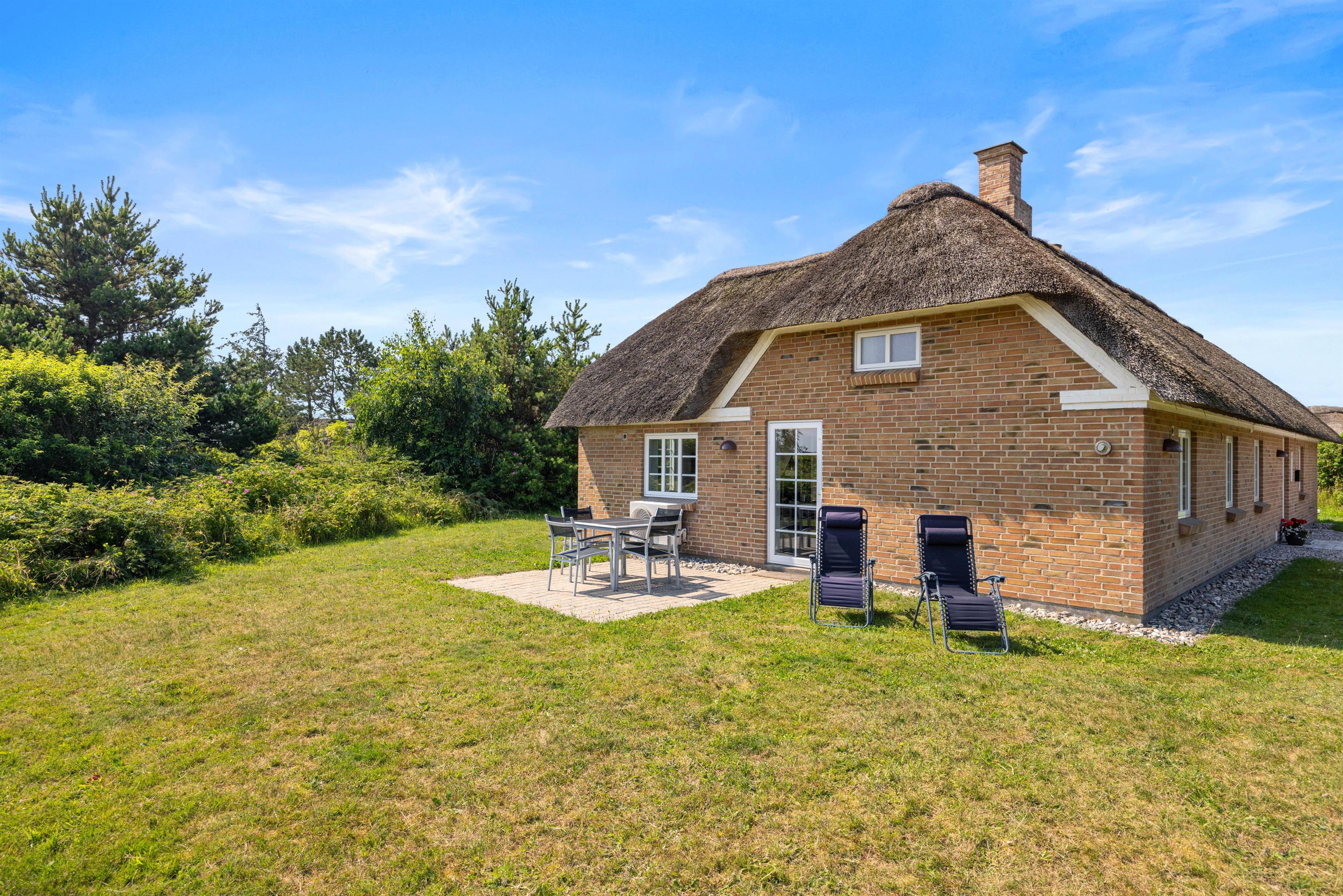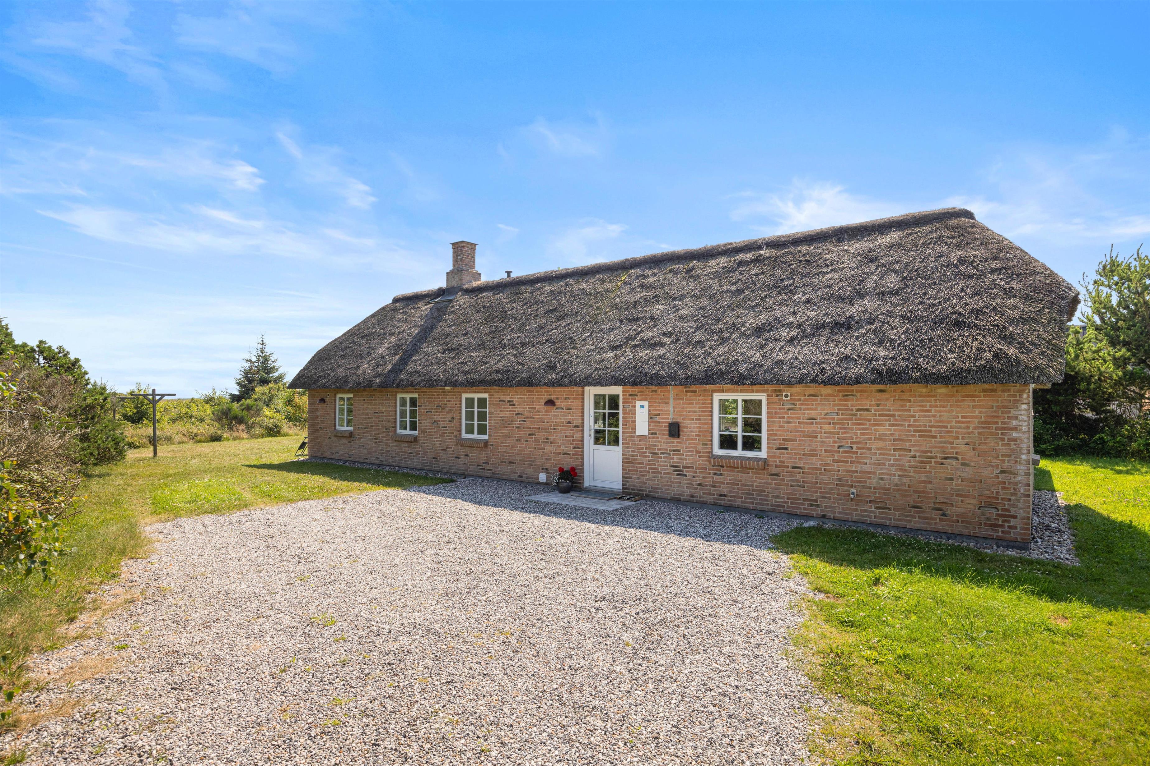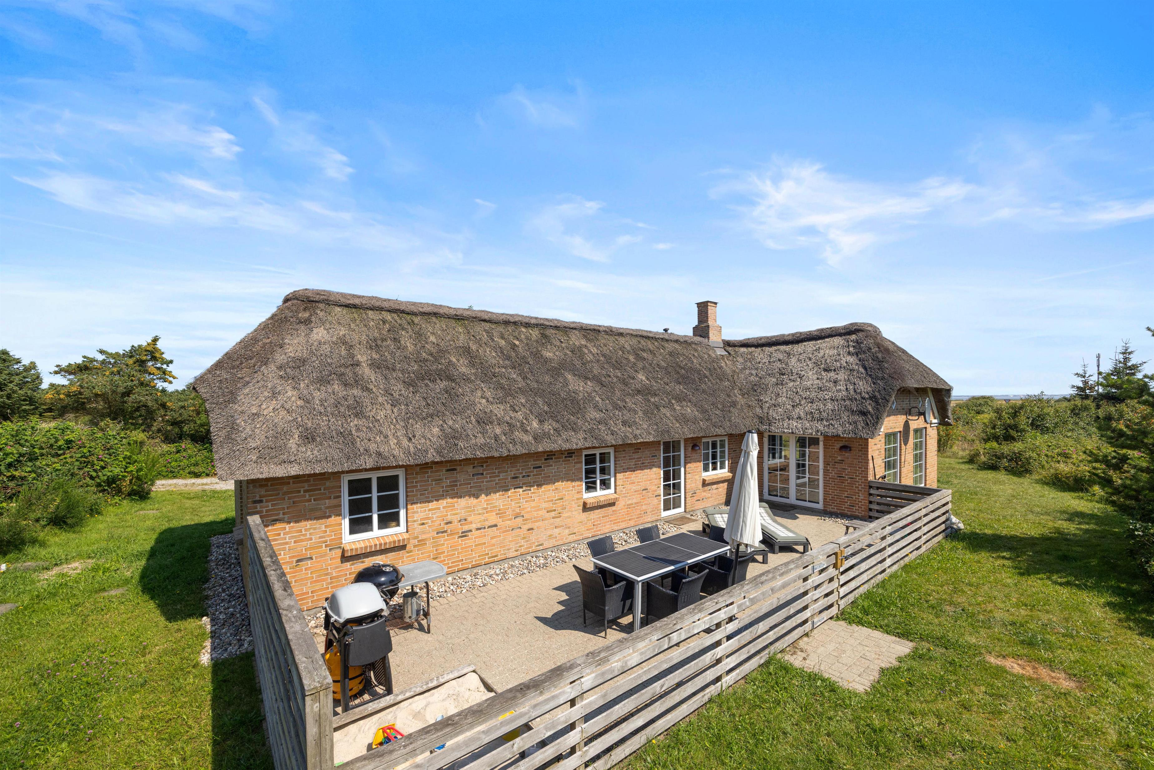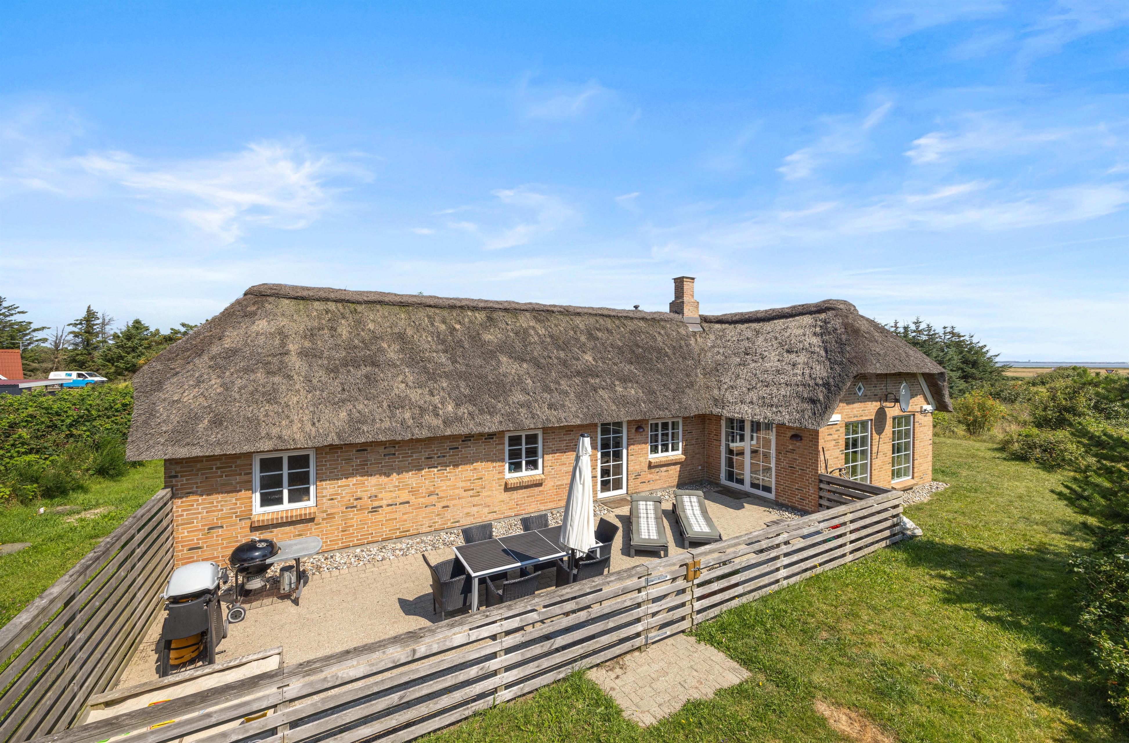 I dette hyggelige sommerhus med stråbelagt tag kan der bo 6 personer. Sommerhuset har både spa og sauna samt en dejlig lukket terrasse. Mod øst kan I nyde udsigten til smukke Ringkøbing Fjord, hvortil I også kan tage på udflugt.