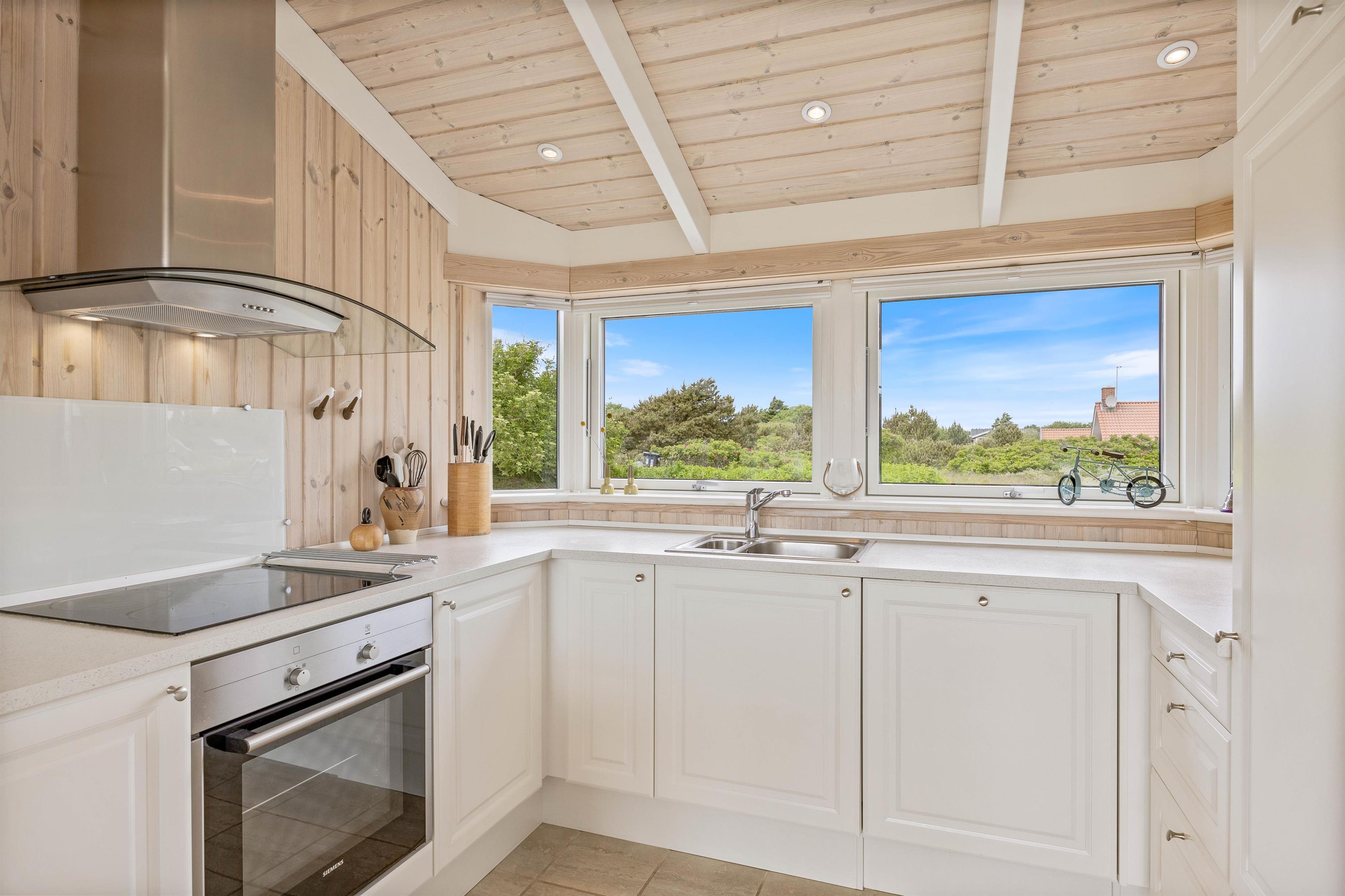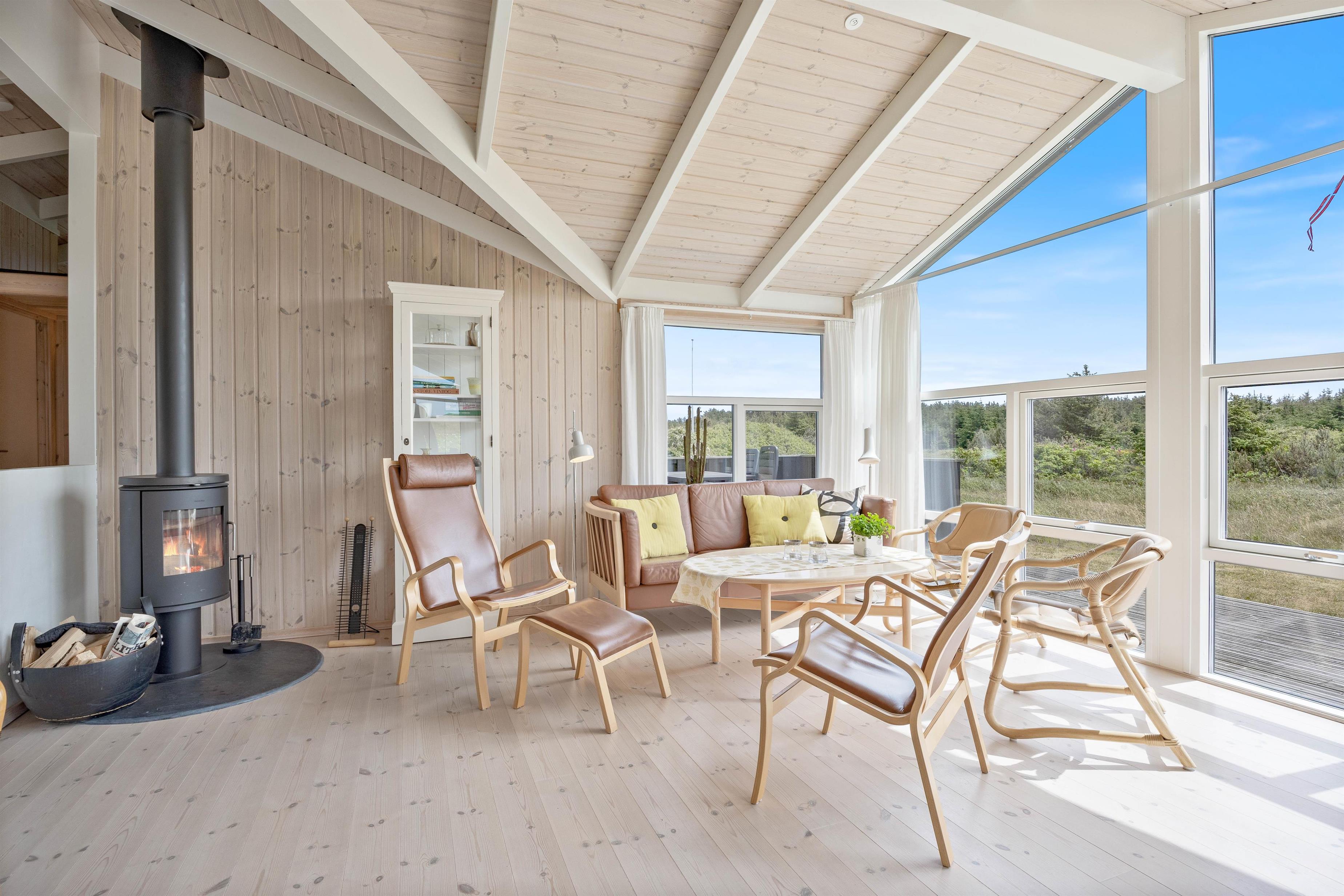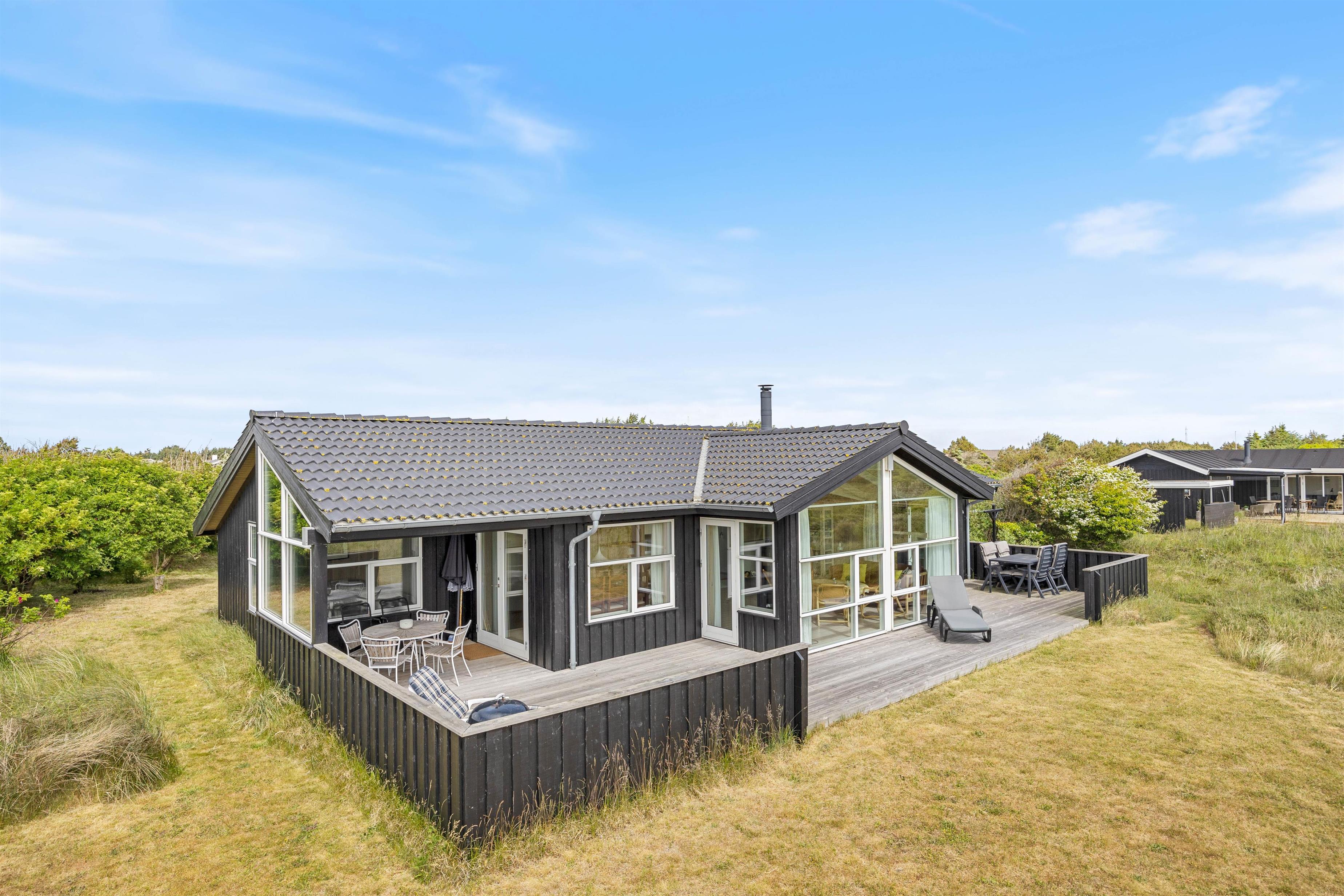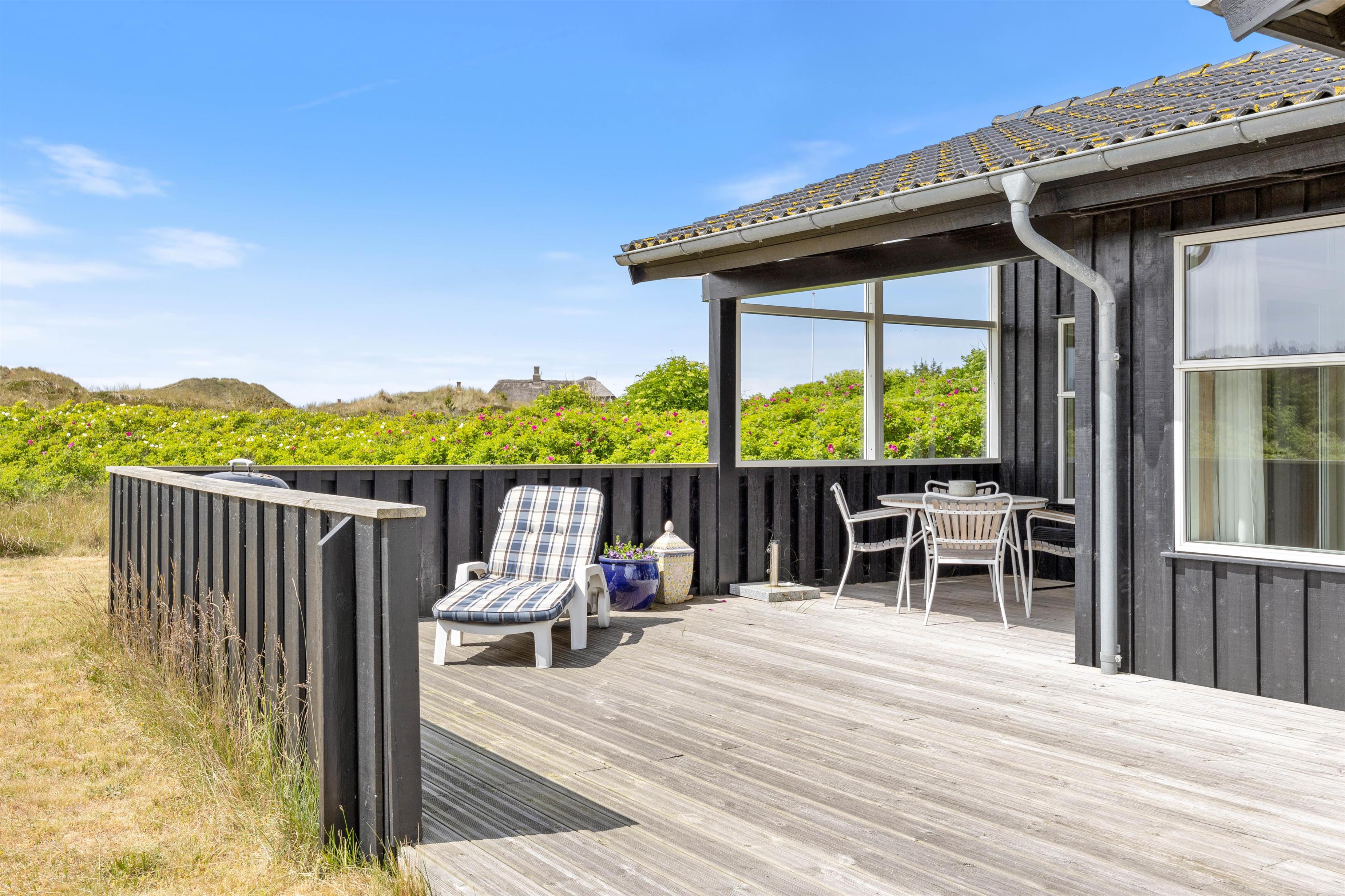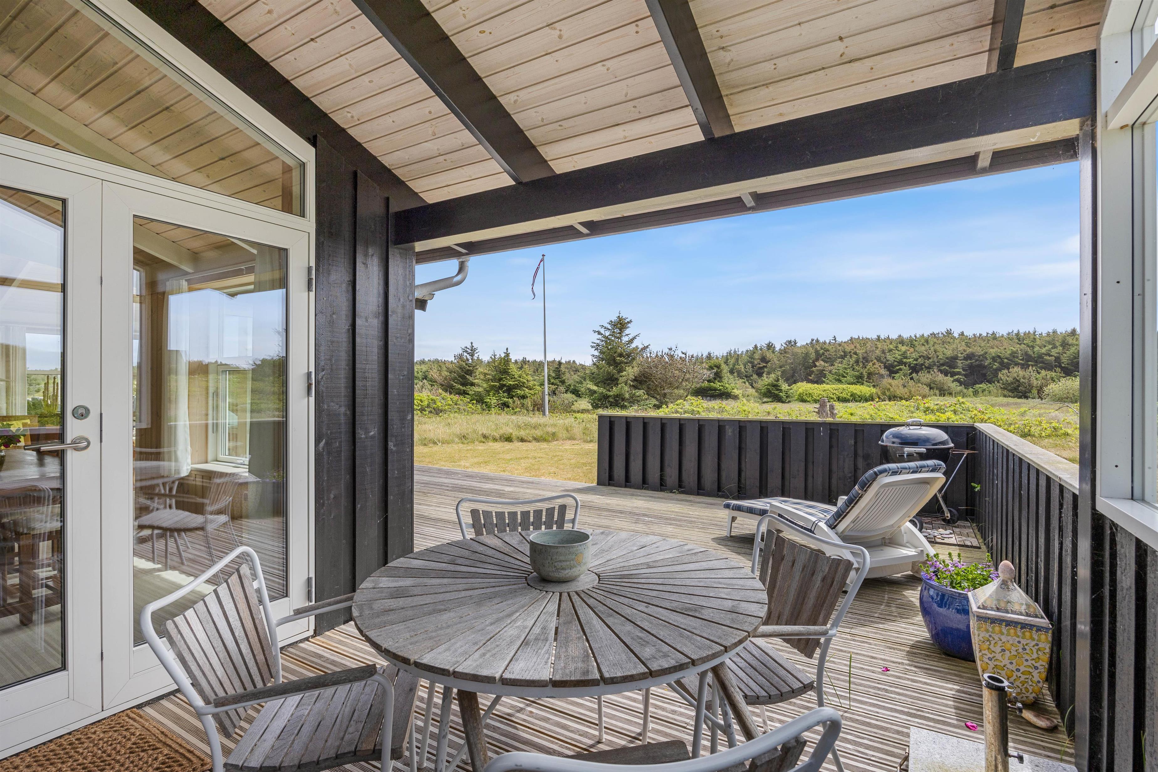 Feriehuset byder endvidere på en dejlig terrasse, som strækker sig fra øst til vest, så du kan nyde solen dagen lang – om det er til morgenkaffen, ved solbadningen eller med et glas kold hvidvin før en hyggelig grillaften. Udsigten til naturen i syd er uforstyrret, idet de eneste naboer er rådyr og harer. Feriehuset ligger kun 400 meter fra havet, hvilket gør det let tilgængeligt at gå en tur ned til Vesterhavet.